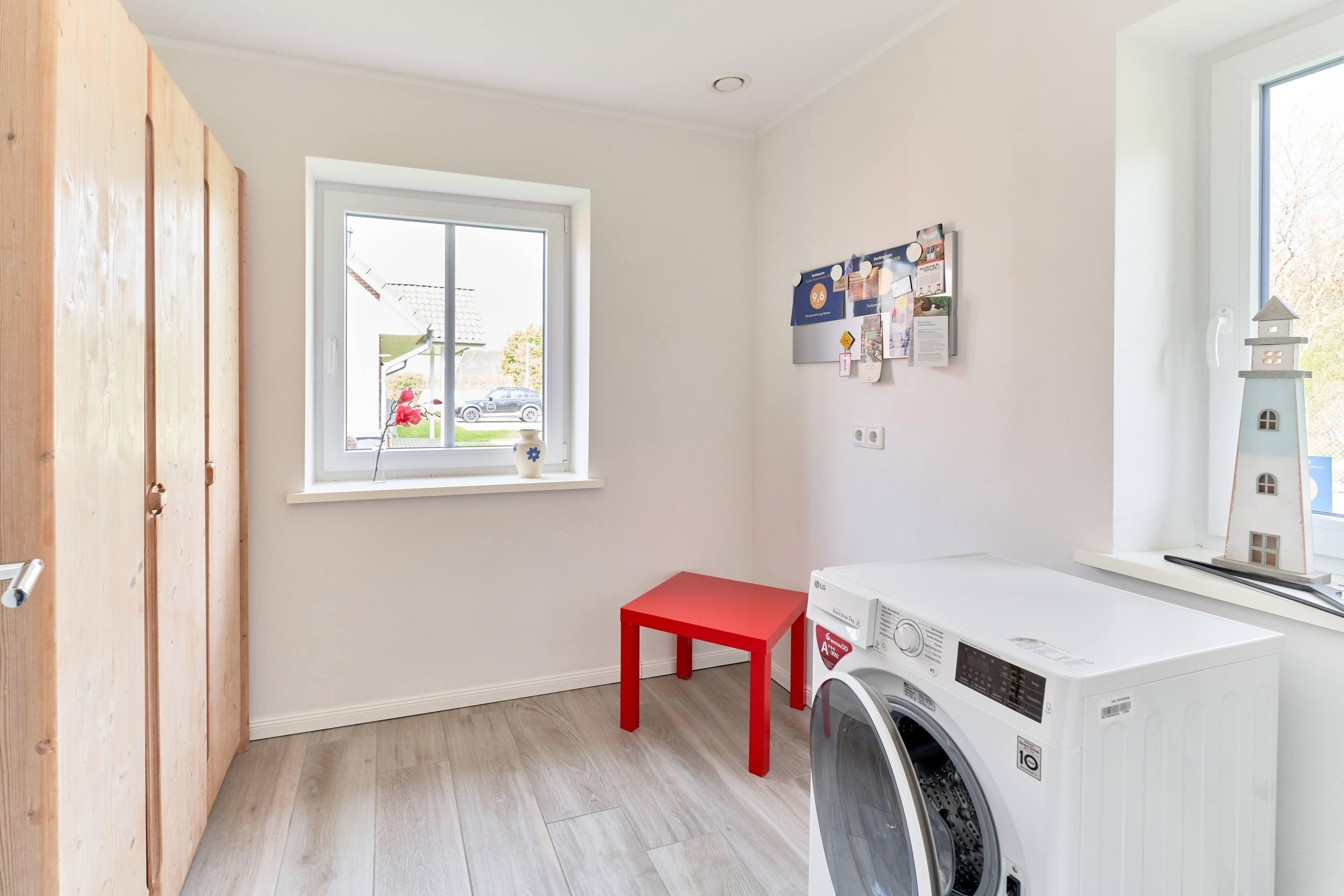 Neben dem Wohnbereich befindet sich ein praktischer Hauswirtschaftsraum mit Waschmaschine und Stauraum für Ihre persönlichen Dinge. Zudem steht Ihnen ein modernes Badezimmer mit Dusche, WC und Waschbecken zur Verfügung.