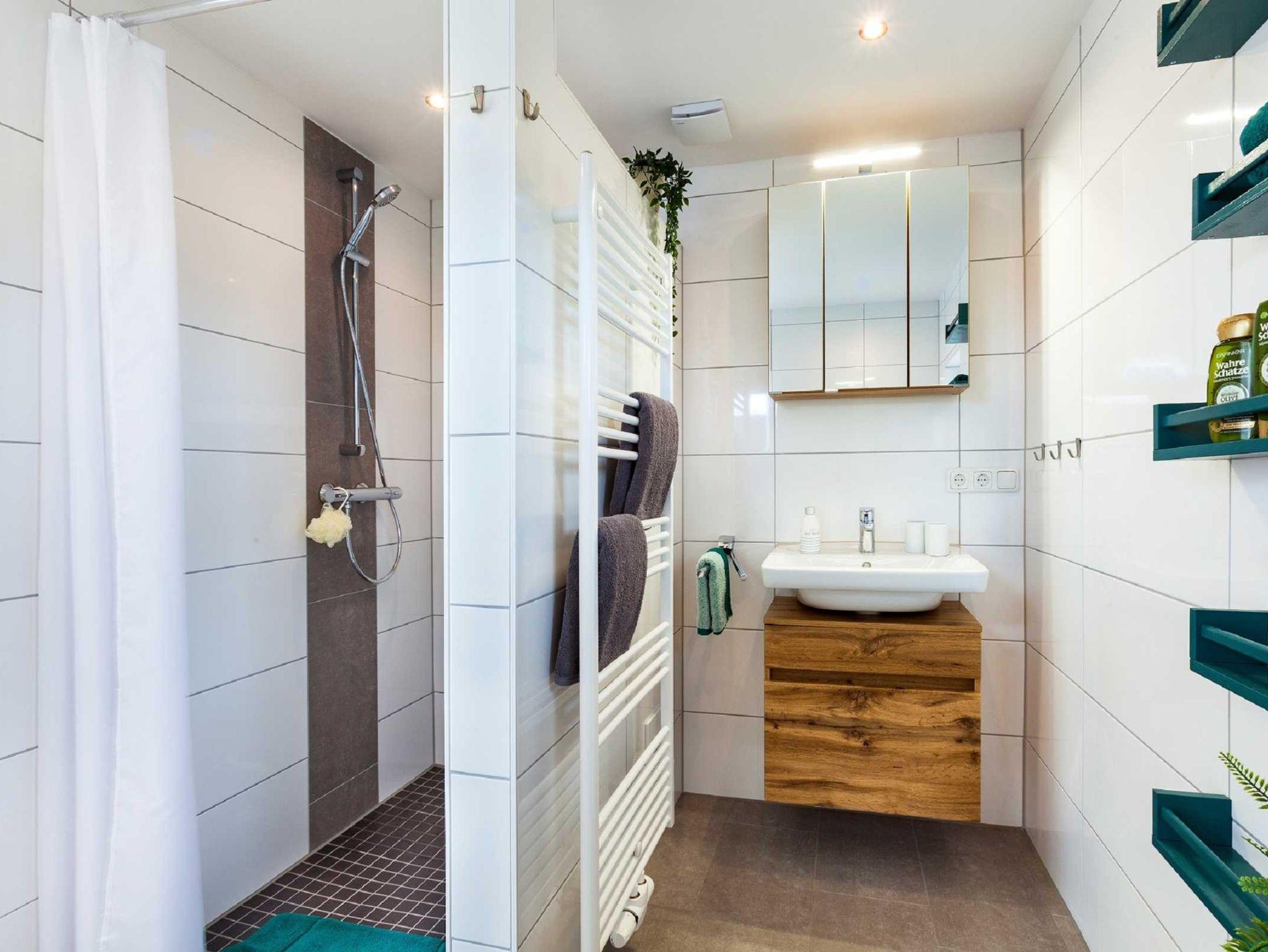 Voll ausgestatteter Küche. Das Bad mit Dusche und WC.