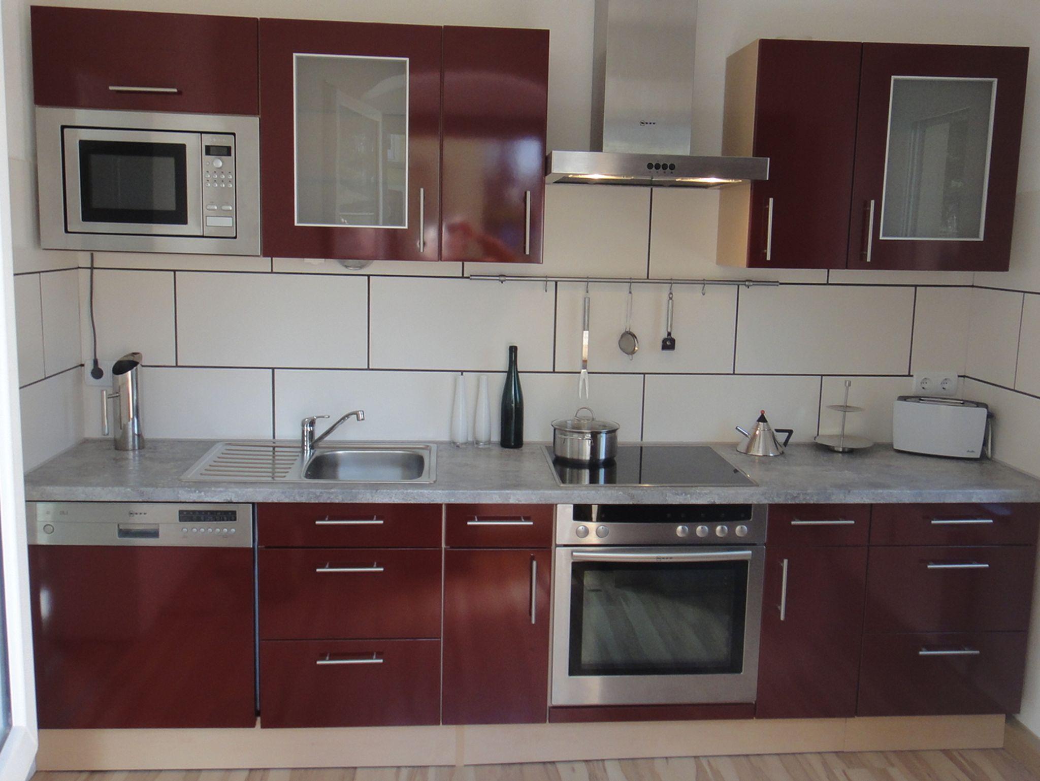 Alno-Markenküche mit NEFF-Geräten (Microwelle, Spülmaschine, Kühl- und Gefrierschrank, Backofen und Cerankochfeld), Kaffeemaschine, Wasserkocher, Toaster