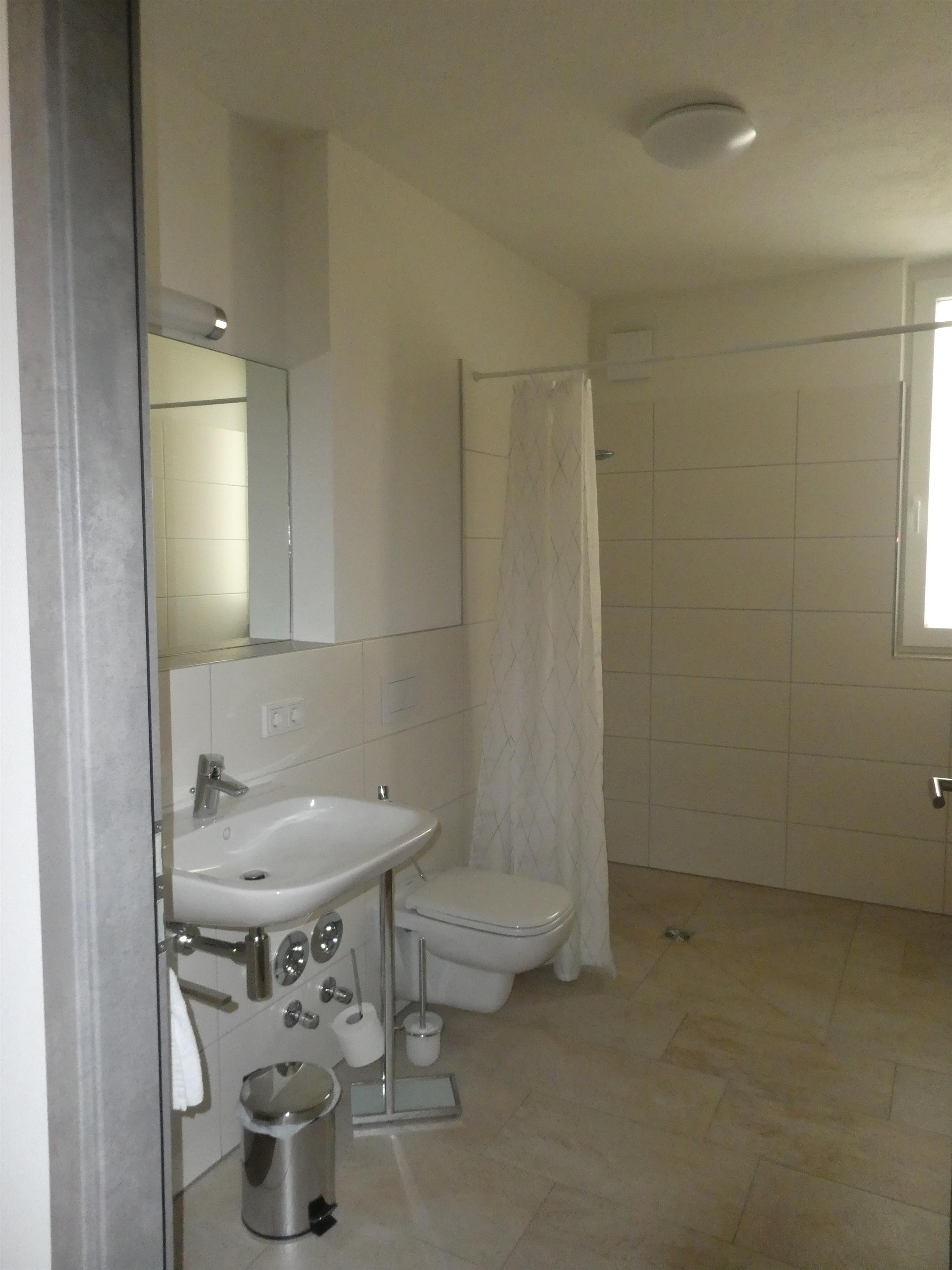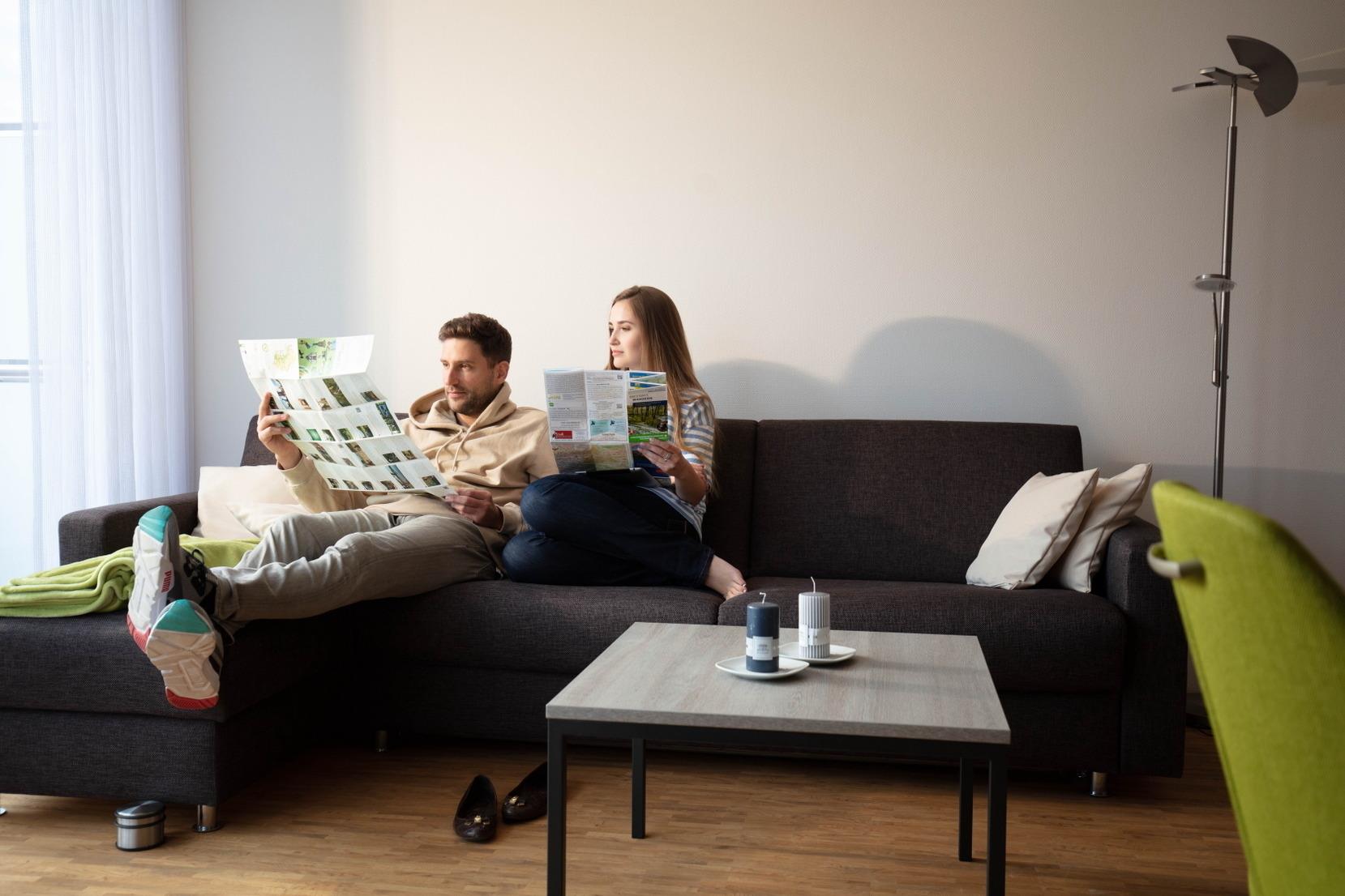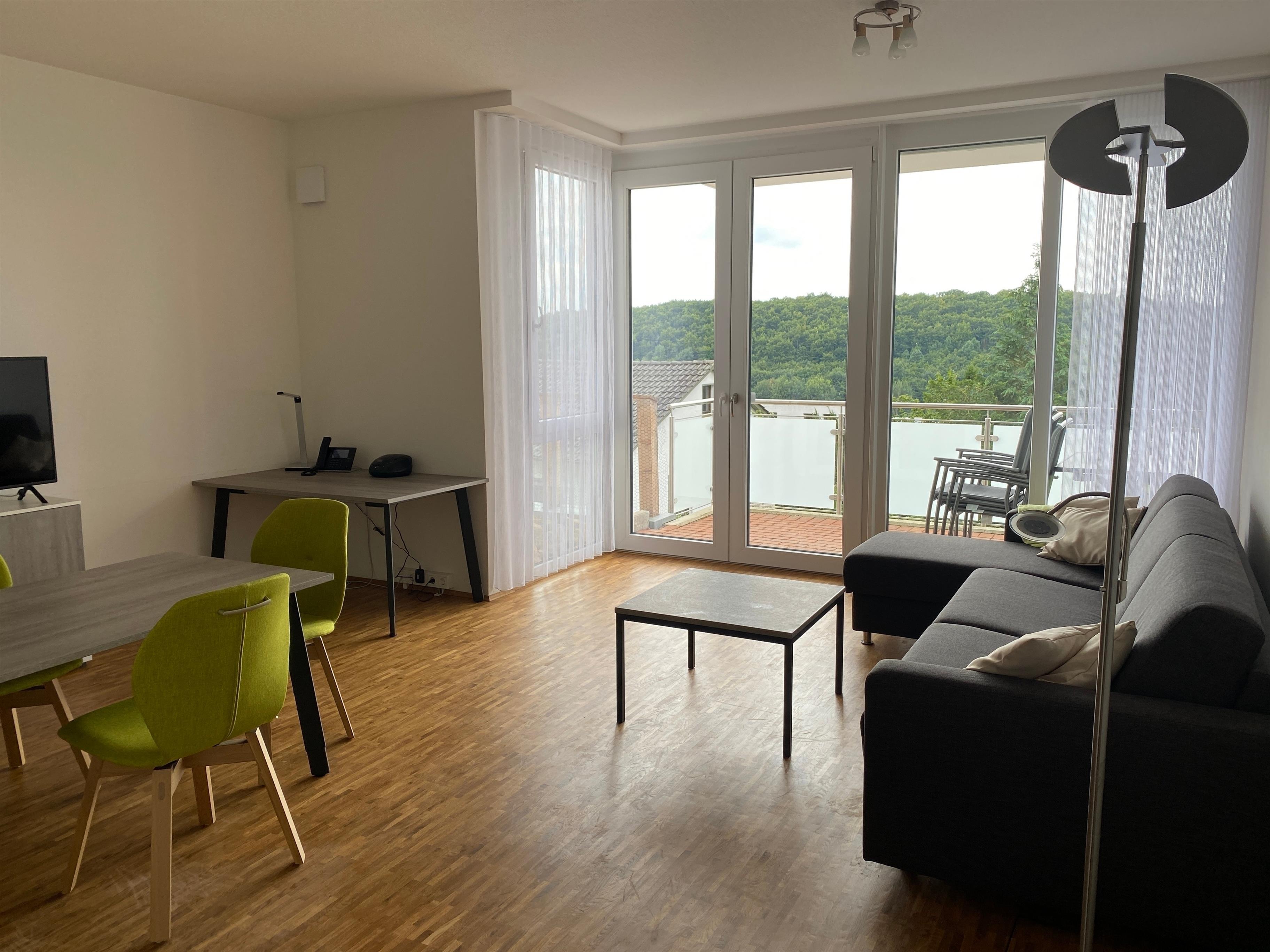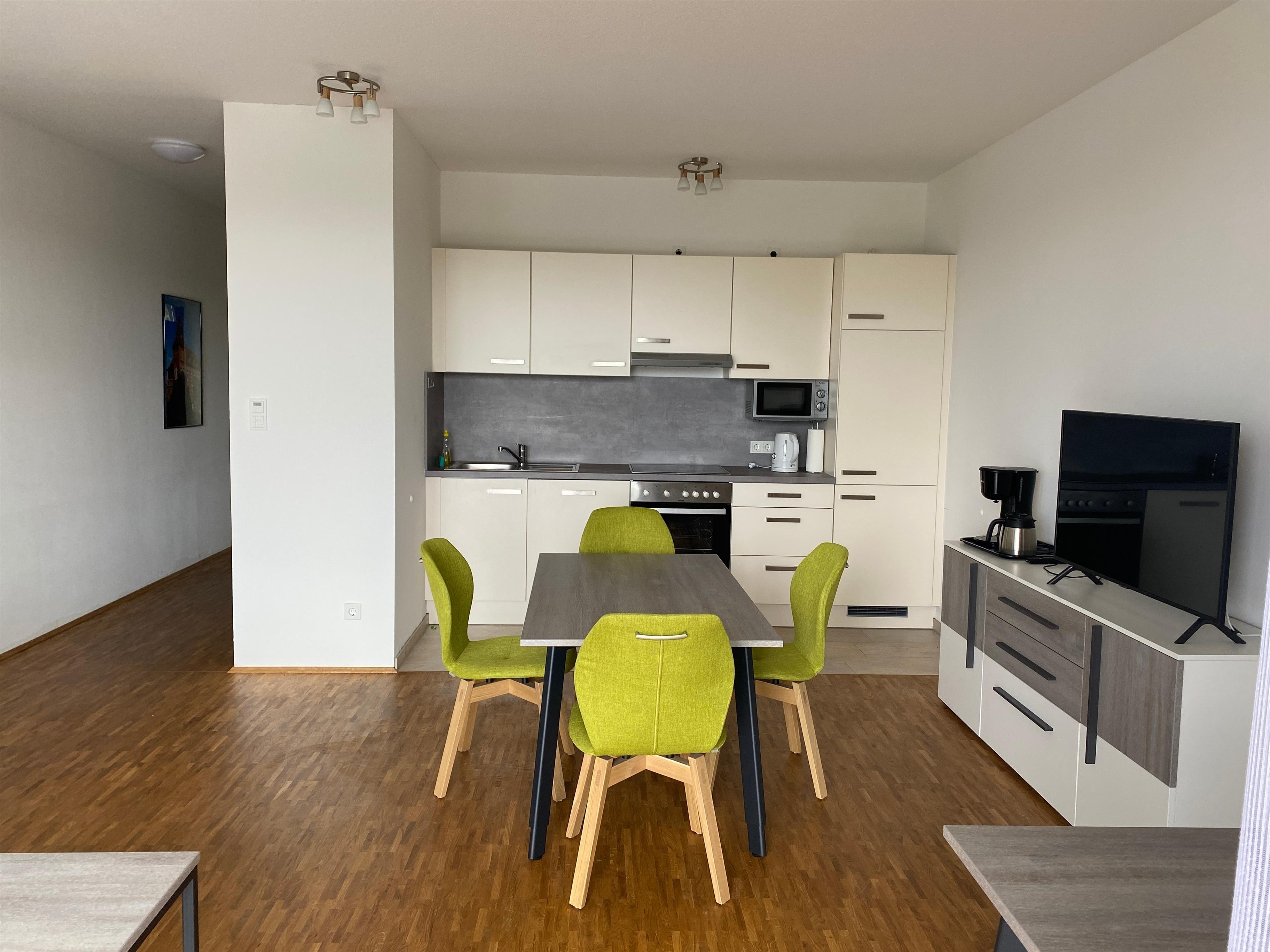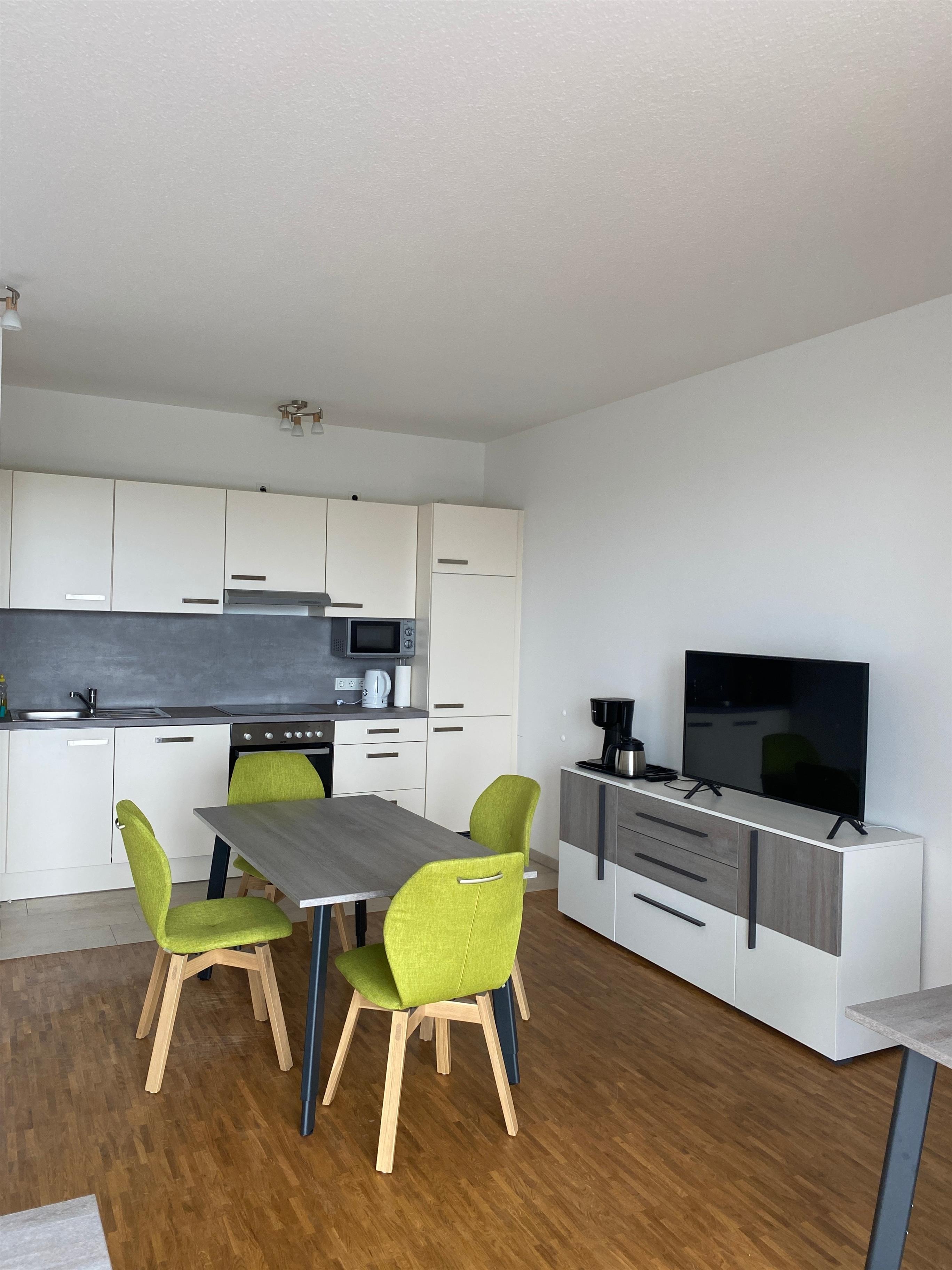 Unsere Wohnungen sind komplett möbliert und voll ausgestattet mit allem was Sie brauchen, um sich wie zuhause zu fühlen. Die Küchenzeile ist mit 4-teiligem Ceranfeld, Backofen, Spülmaschine, Mikrowelle, Toaster und Geschirr komplett eingerichtet. Neben einem Essbereich bietet Ihnen der offen gestaltete und modern eingerichtete Wohnbereich einen Bereich mit Ecksofa und 43″ UHD TV. Außerdem befindet sich im Raum ein Arbeitsplatz.
