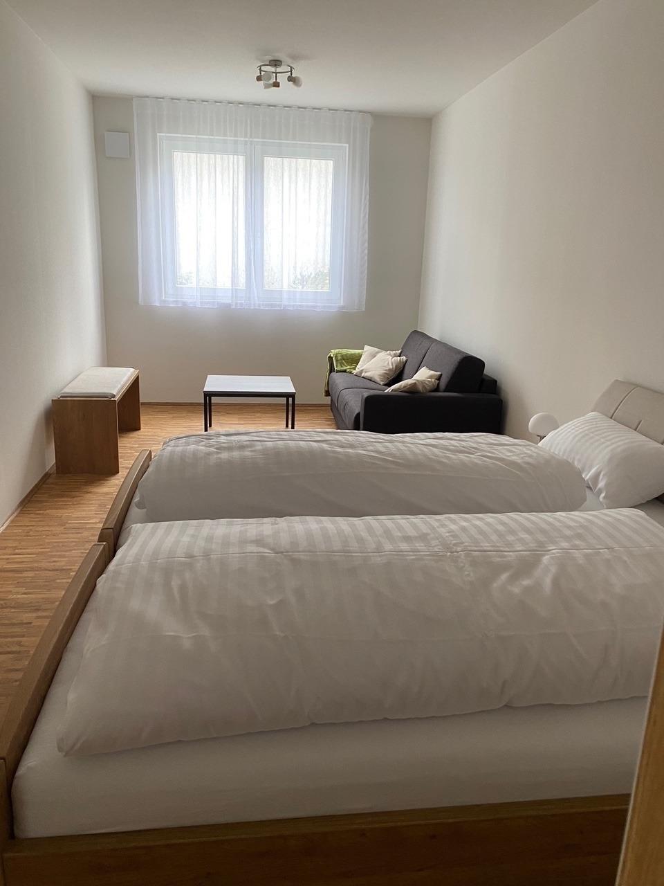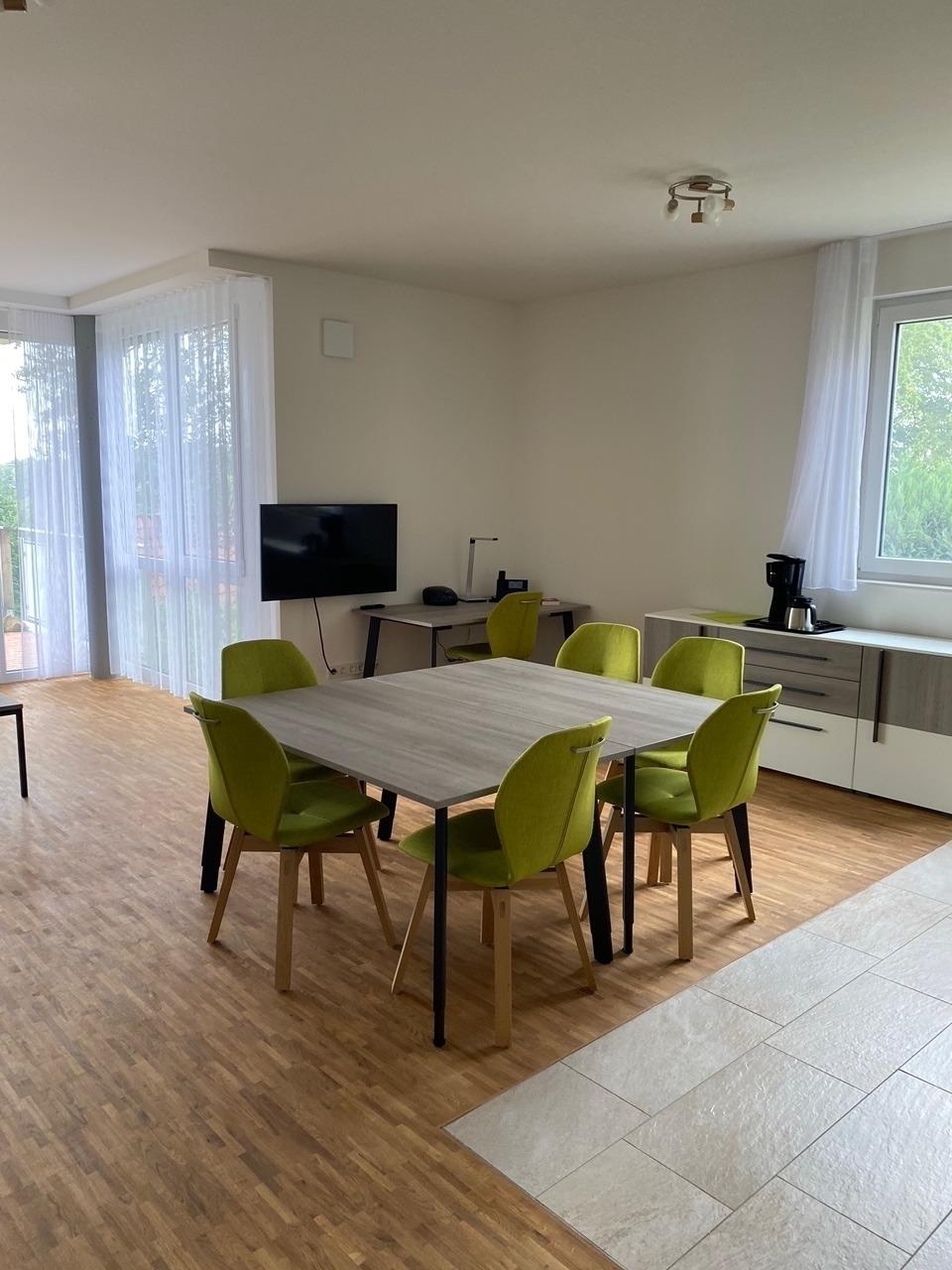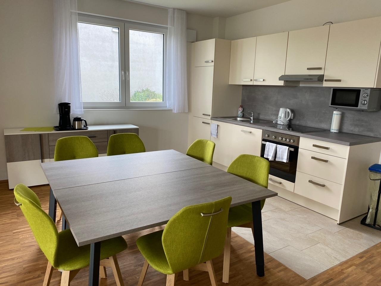 Unsere Wohnungen sind komplett möbliert und voll ausgestattet mit allem was Sie brauchen, um sich wie zuhause zu fühlen. Die Küchenzeile ist mit 4-teiligem Ceranfeld, Backofen, Spülmaschine, Mikrowelle, Toaster und Geschirr komplett eingerichtet. Neben einem Essbereich bietet Ihnen der offen gestaltete und modern eingerichtete Wohnbereich einen Bereich mit Ecksofa und 43? UHD TV. Außerdem befindet sich im Raum ein Arbeitsplatz.