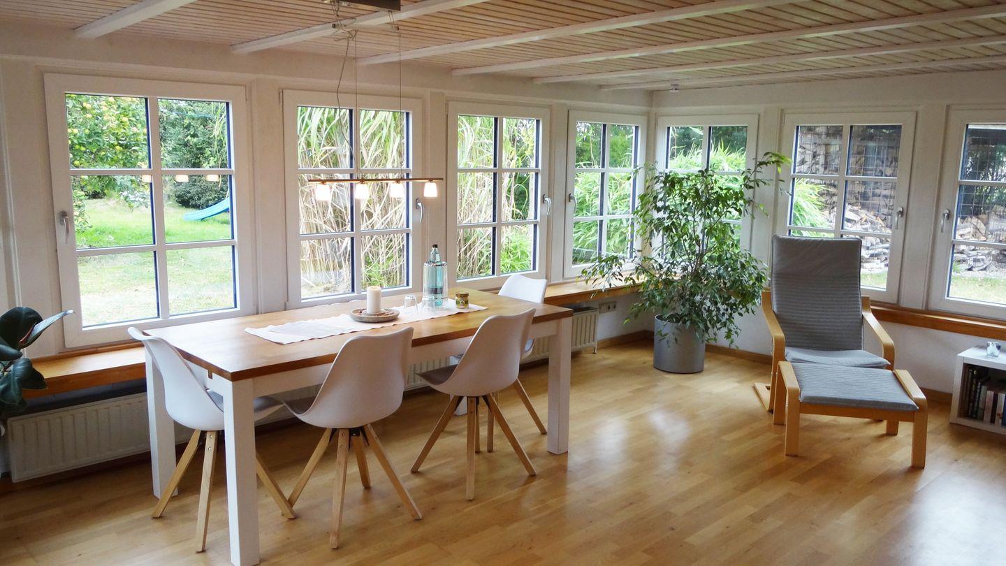 Es erwartet Sie ein geräumiger und lichtdurchfluteter Wintergarten mit angrenzender, komplett ausgestatteter Wohnküche und großem Essplatz. Ebenso können Sie im Wohnraum auf der gemütlichen Couch und Recamiere entspannen. Im liebevoll angelegten Garten können Sie der Natur lauschen und für die kleinen Gäste haben wir jetzt auch ein tolles Klettergerüst.