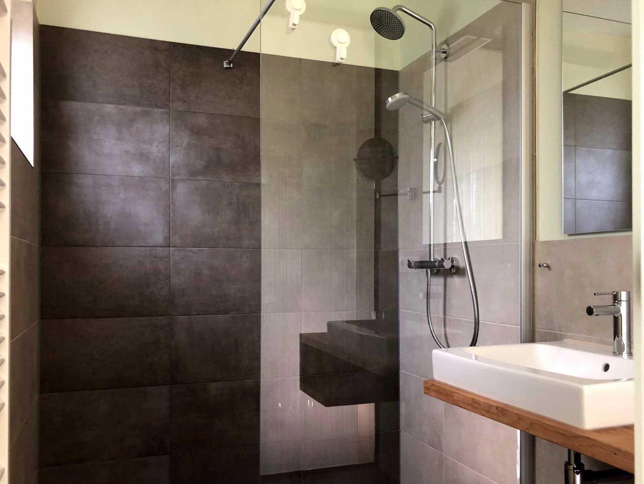 Sanitär: Bademantel, bodenebene Dusche, Föhn, Handtuchheizkörper, Schminkspiegel, Walk-In Dusche.