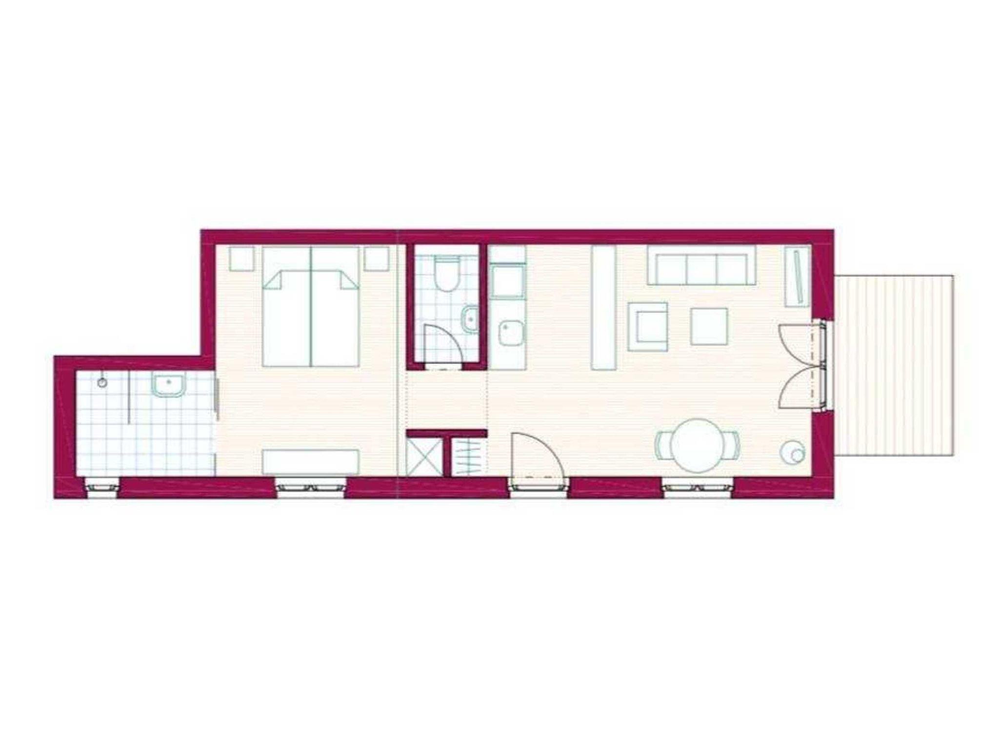 Raumaufteilung: 1 Schlafraum (1 Doppelbett), 1 Wohnraum, 1 Flur, 1 Küchenzeile, 1 Badezimmer mit Dusche, 1 zusätzliches WC.