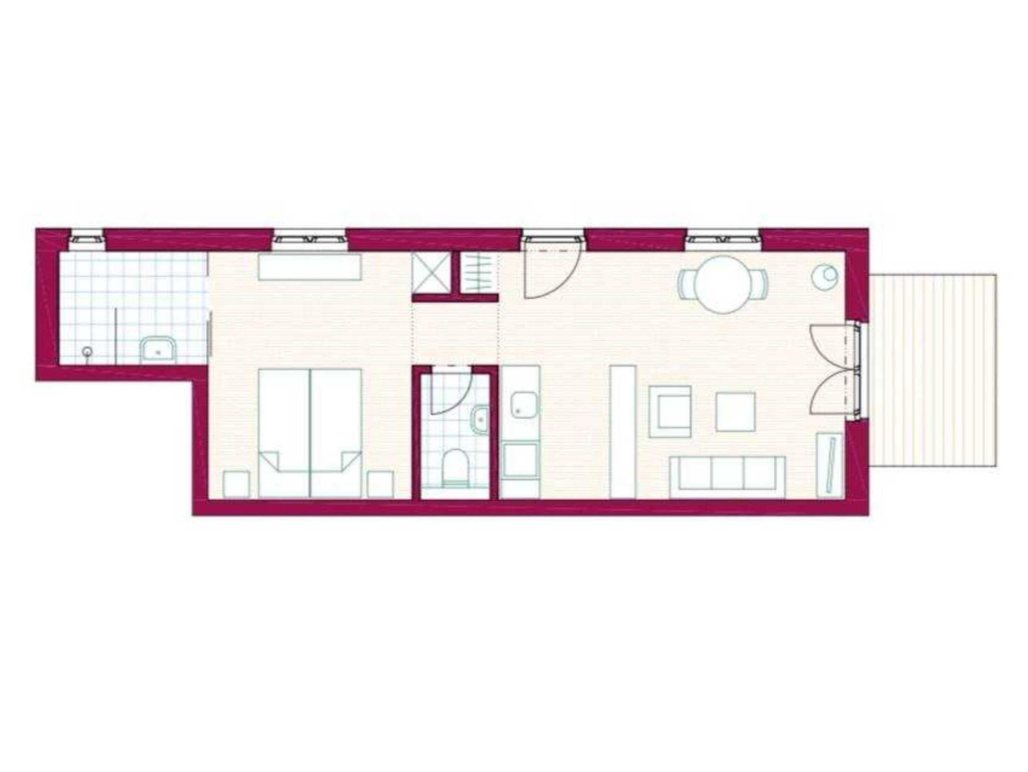 Raumaufteilung: 1 Schlafraum (1 Doppelbett), 1 Wohnraum, 1 Flur, 1 Küchenzeile, 1 Badezimmer mit Dusche, 1 zusätzliches WC.