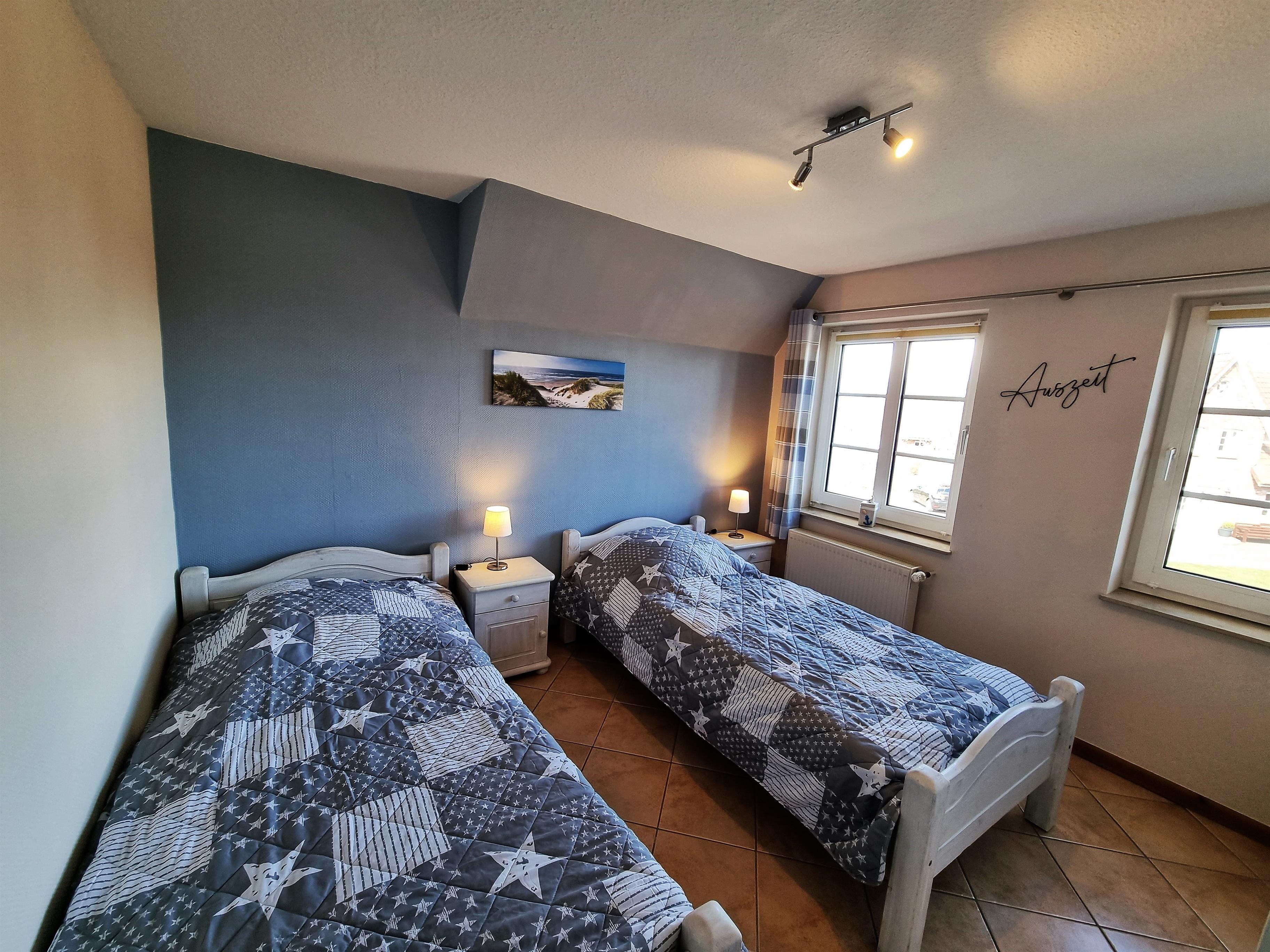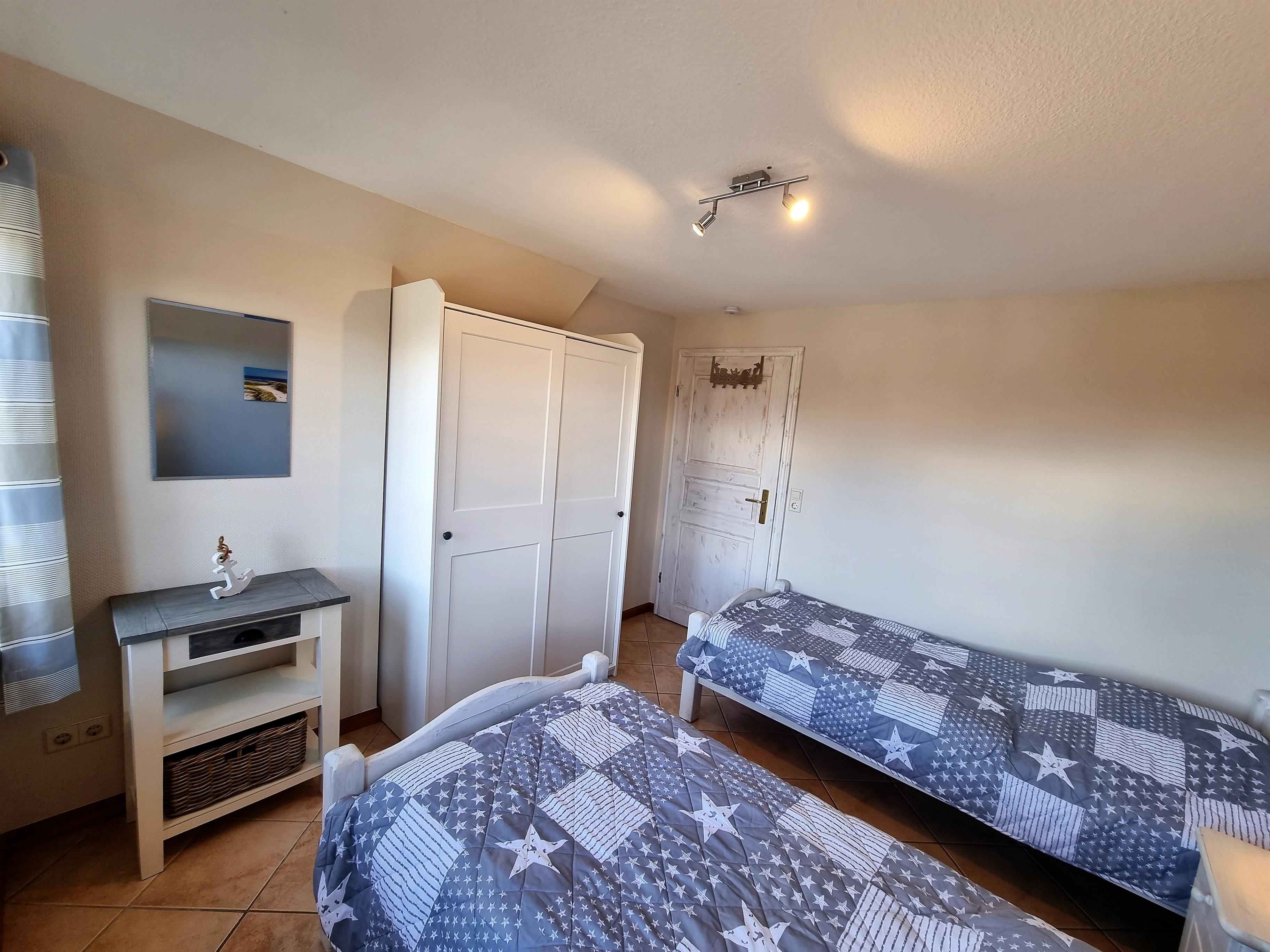 Das zweite Schlafzimmer verfügt über zwei Einzelbetten (je 0,90 × 2,00 m) sowie ebenfalls über einen Kleiderschrank.
