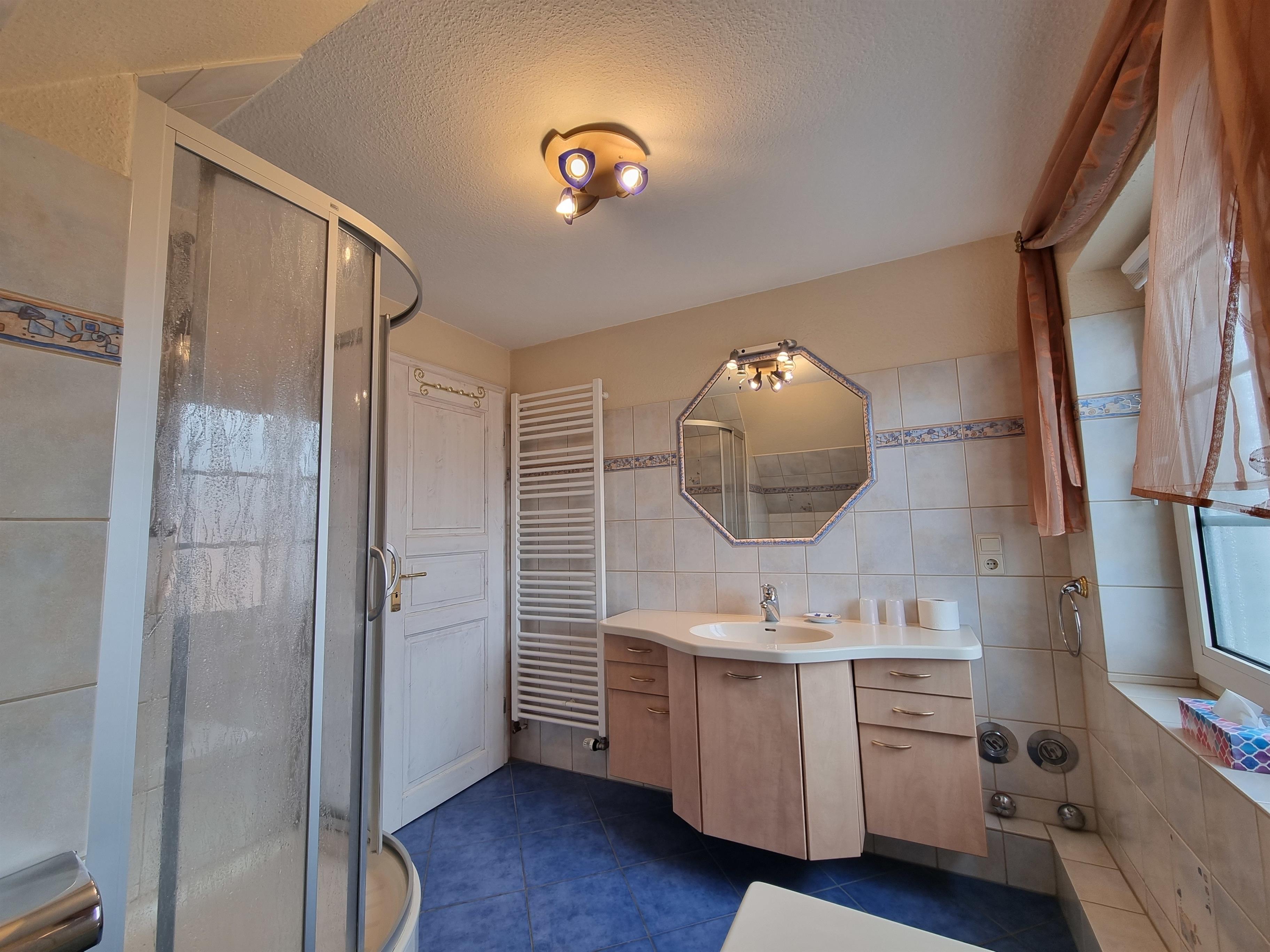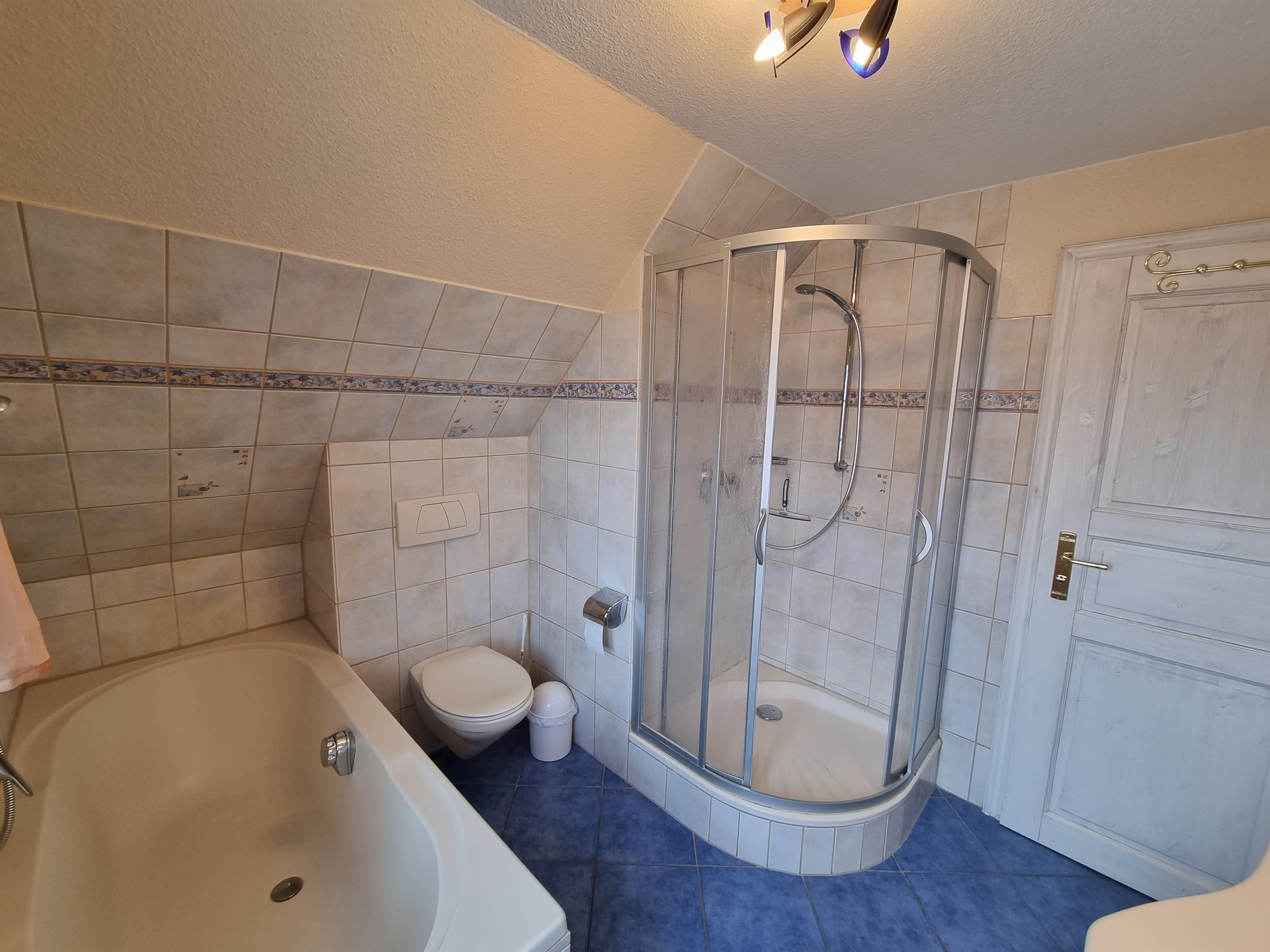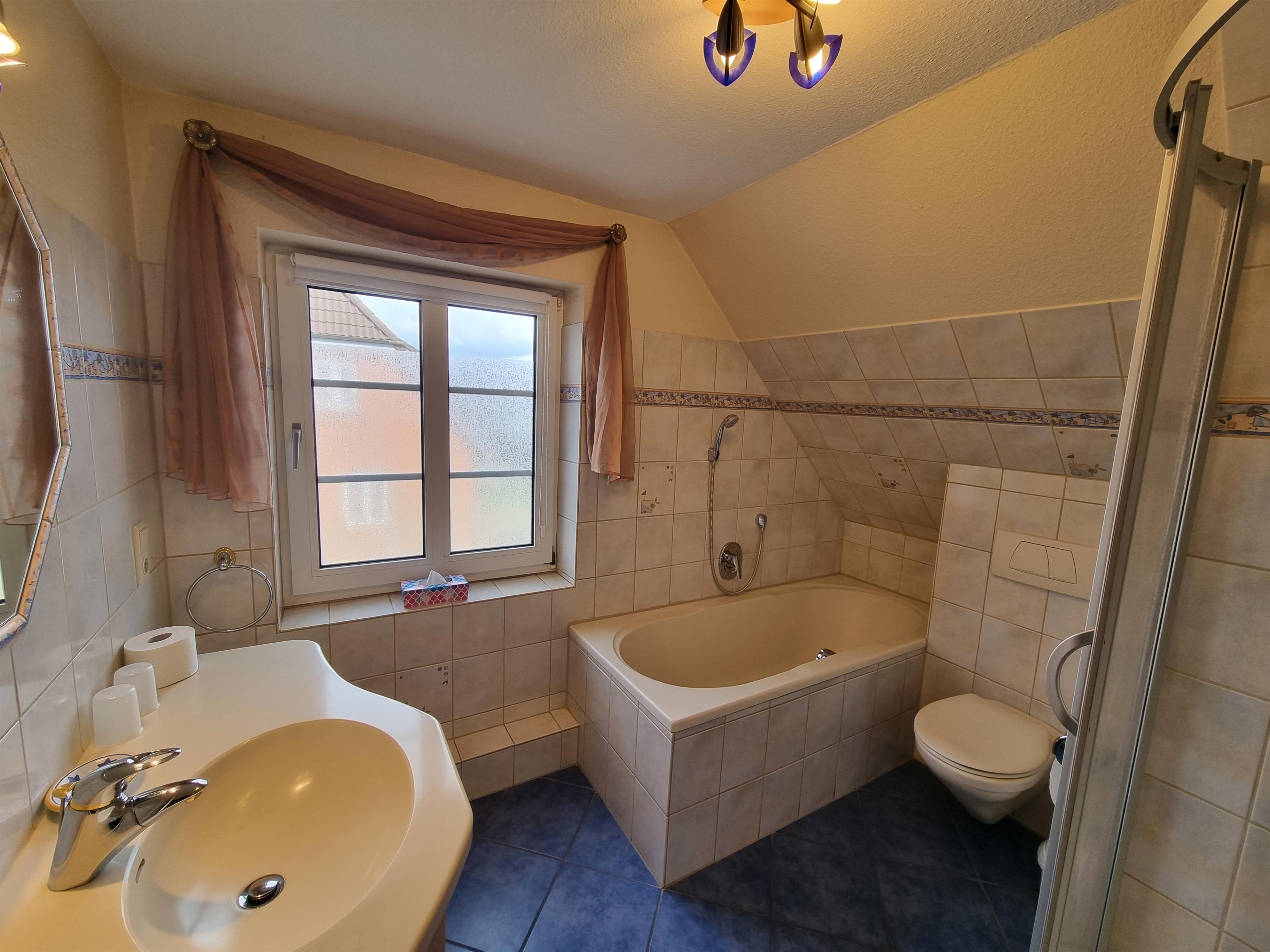 Im geräumigen Badezimmer haben Sie die Wahl zwischen Badewanne und Dusche. Ein Föhn ist ebenfalls vorhanden.