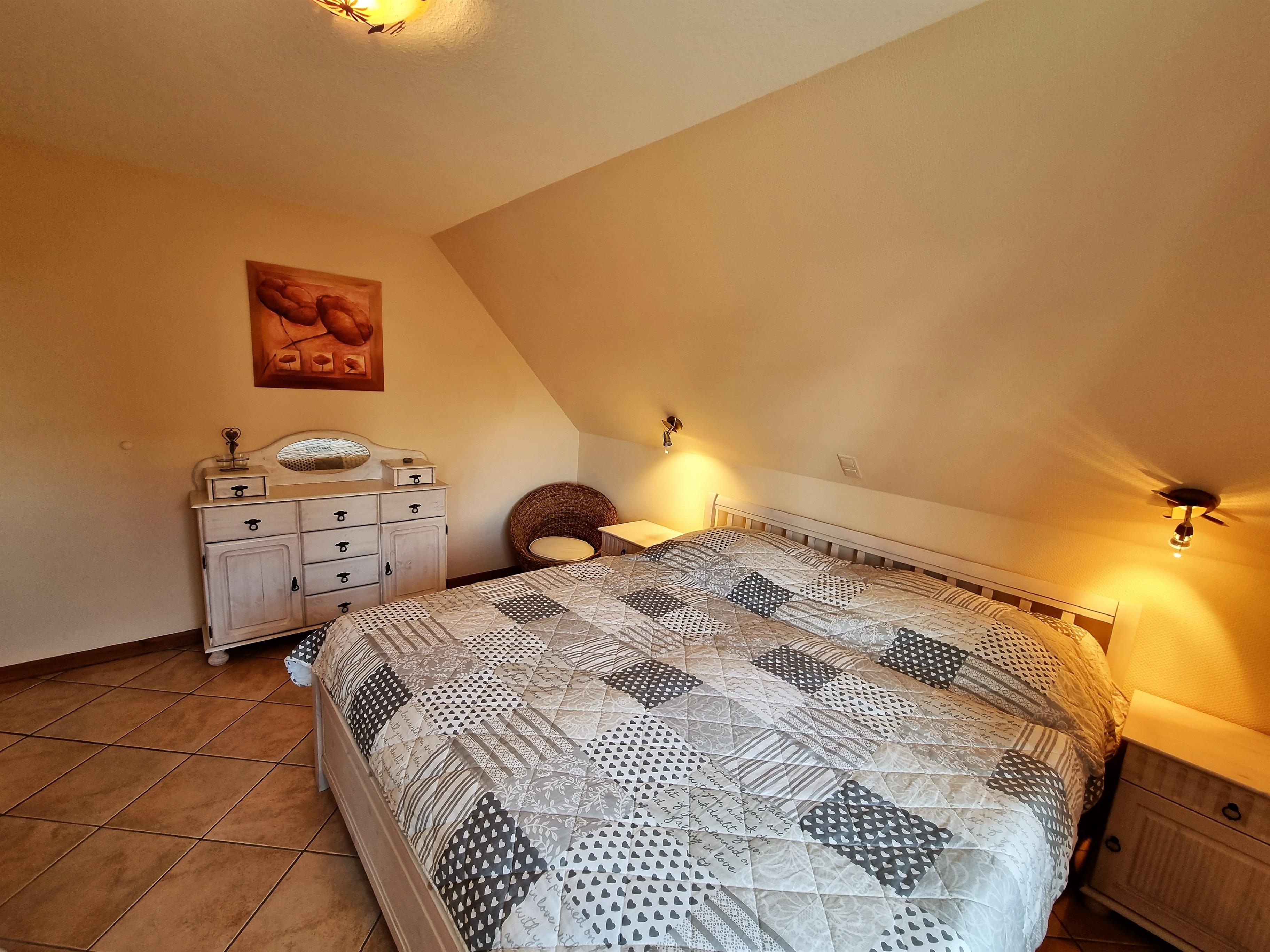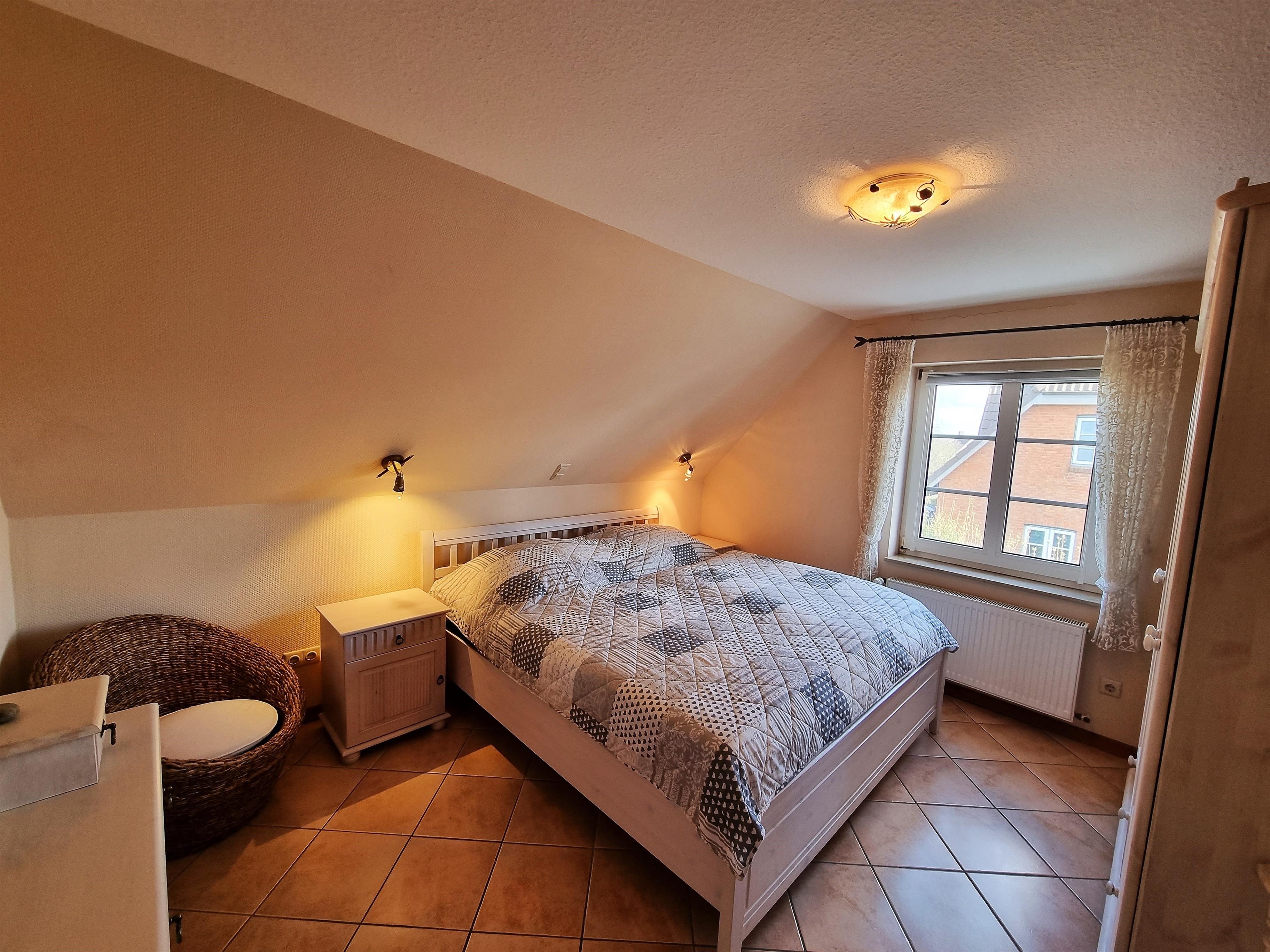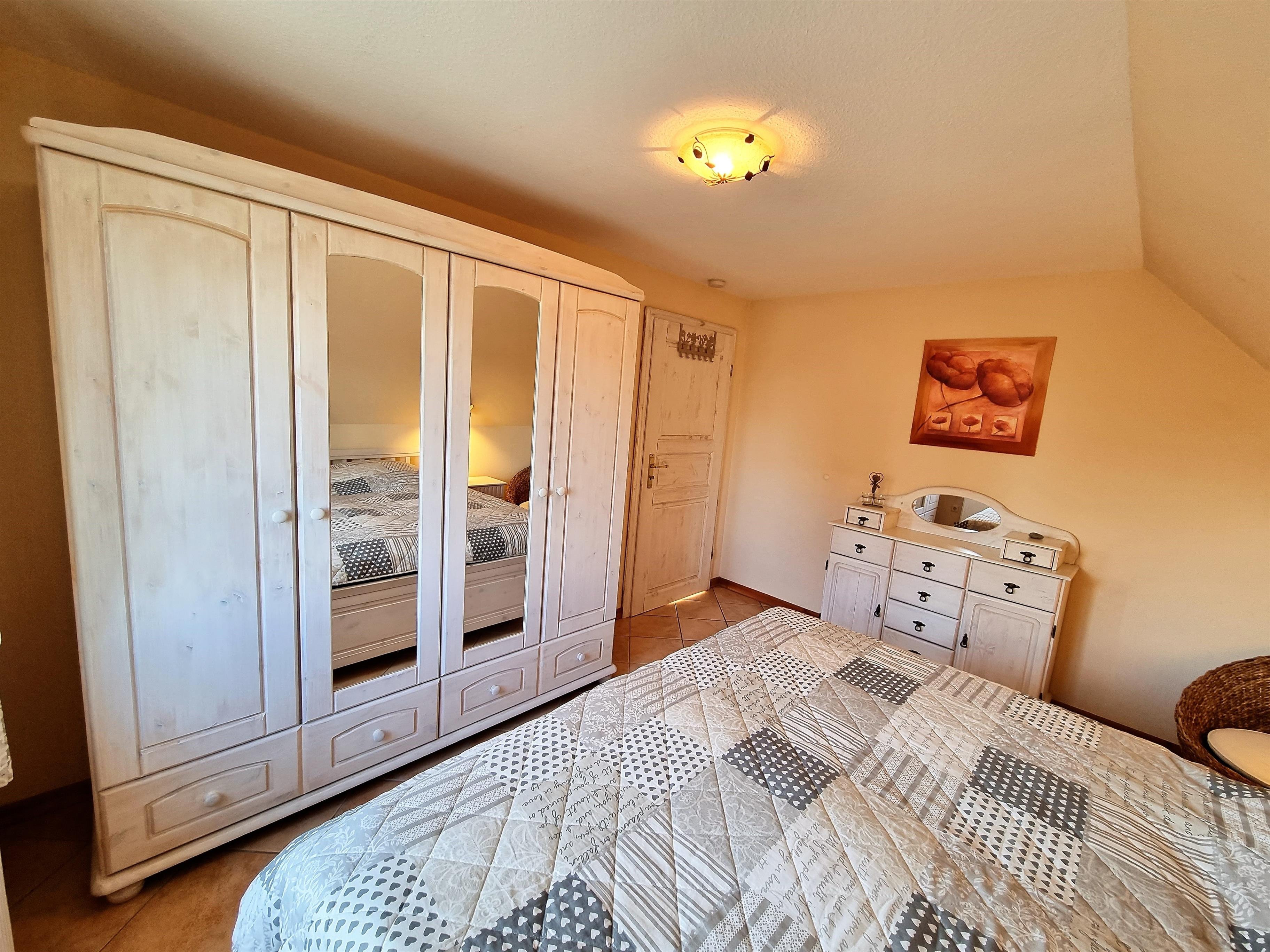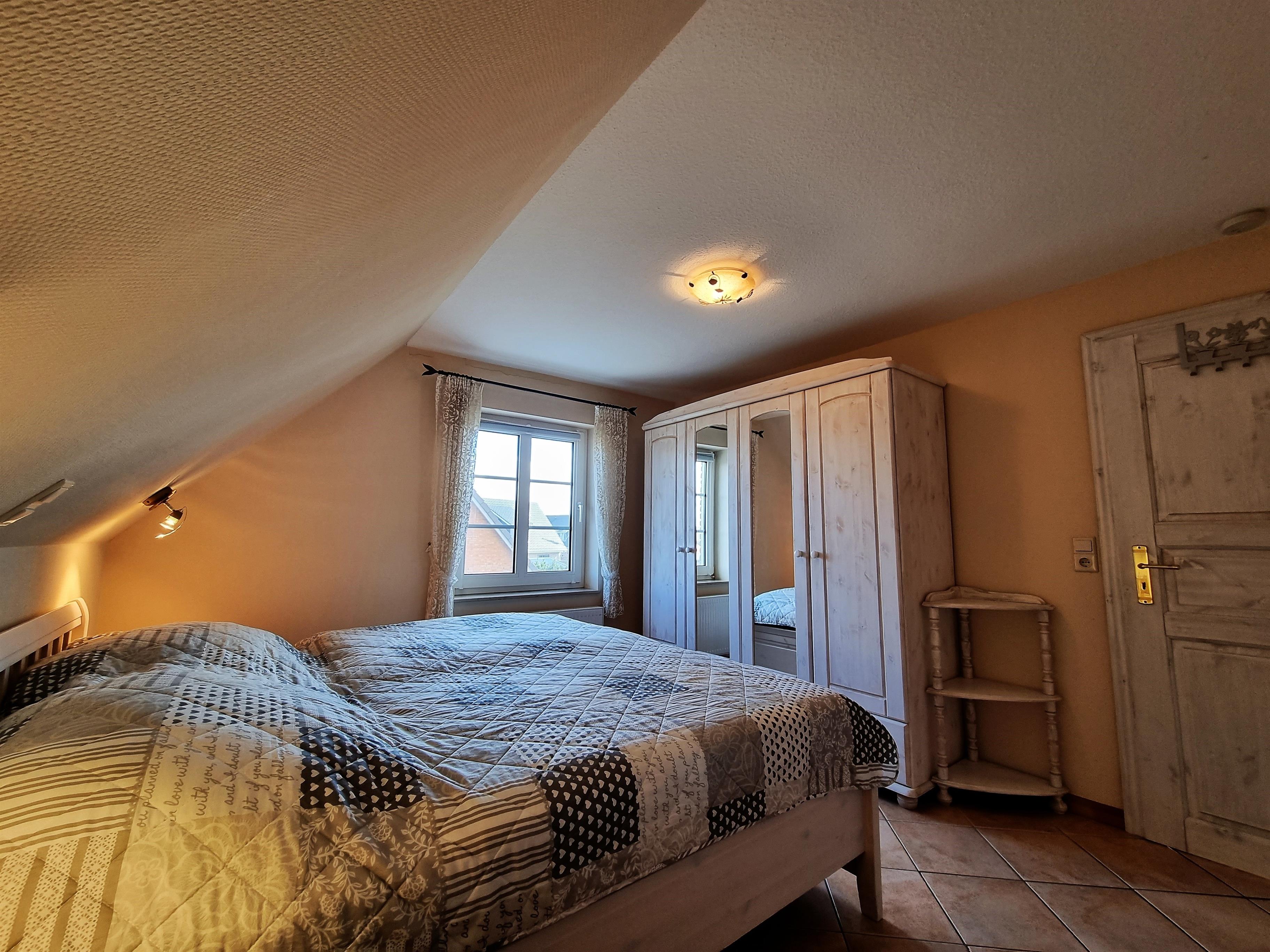 Ein Schlafzimmer ist mit einem Doppelbett (1,80 × 2,00 m) sowie einem Kleiderschrank ausgestattet.