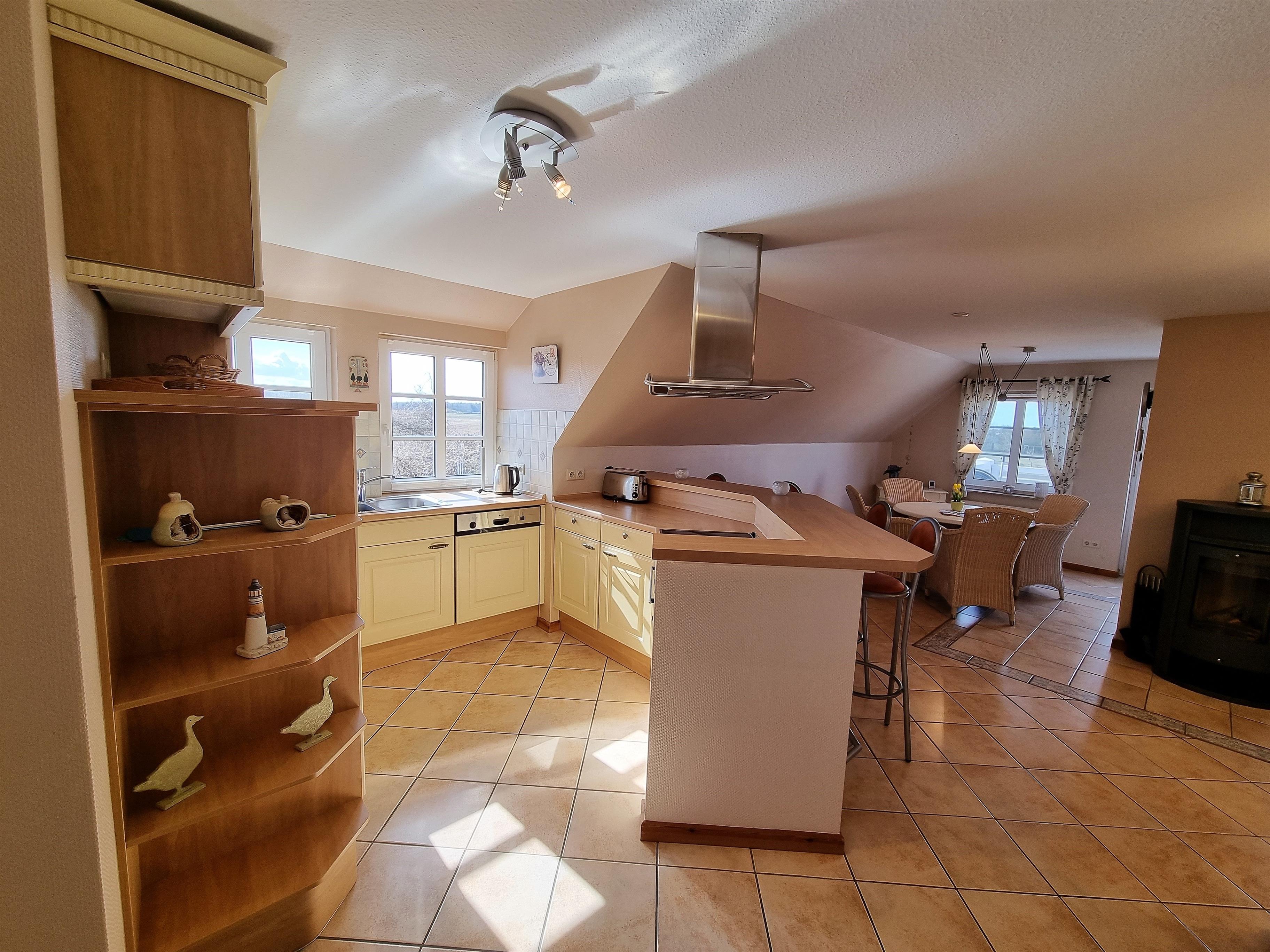 Die Wohnung verfügt über eine offene Landhausküche mit Theke, die sehr gut ausgestattet ist. Der großzügige Wohn- und Essbereich mit Kamin lädt zu gemütlichen Stunden ein.