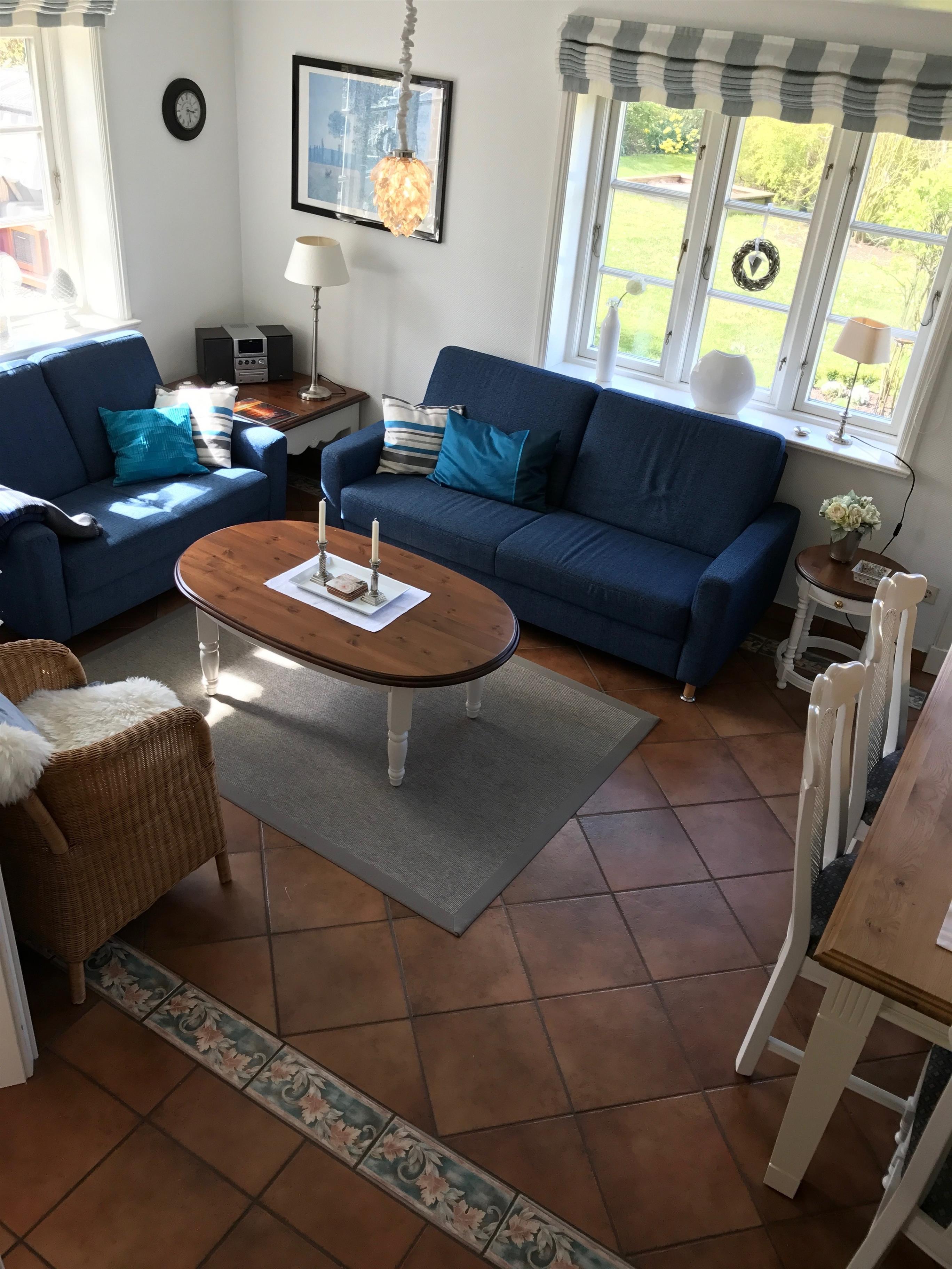 Der helle Wohnbereich bietet Ihnen zwei gemütliche Sofas und einen Sessel. Für Unterhaltung sorgen Kabel-TV, DVD-Player, HiFi-Anlage, auch ein Telefon ist hier vorhanden.