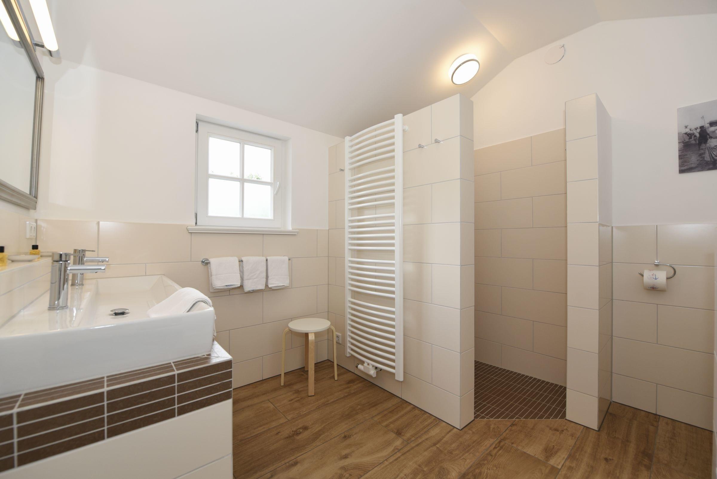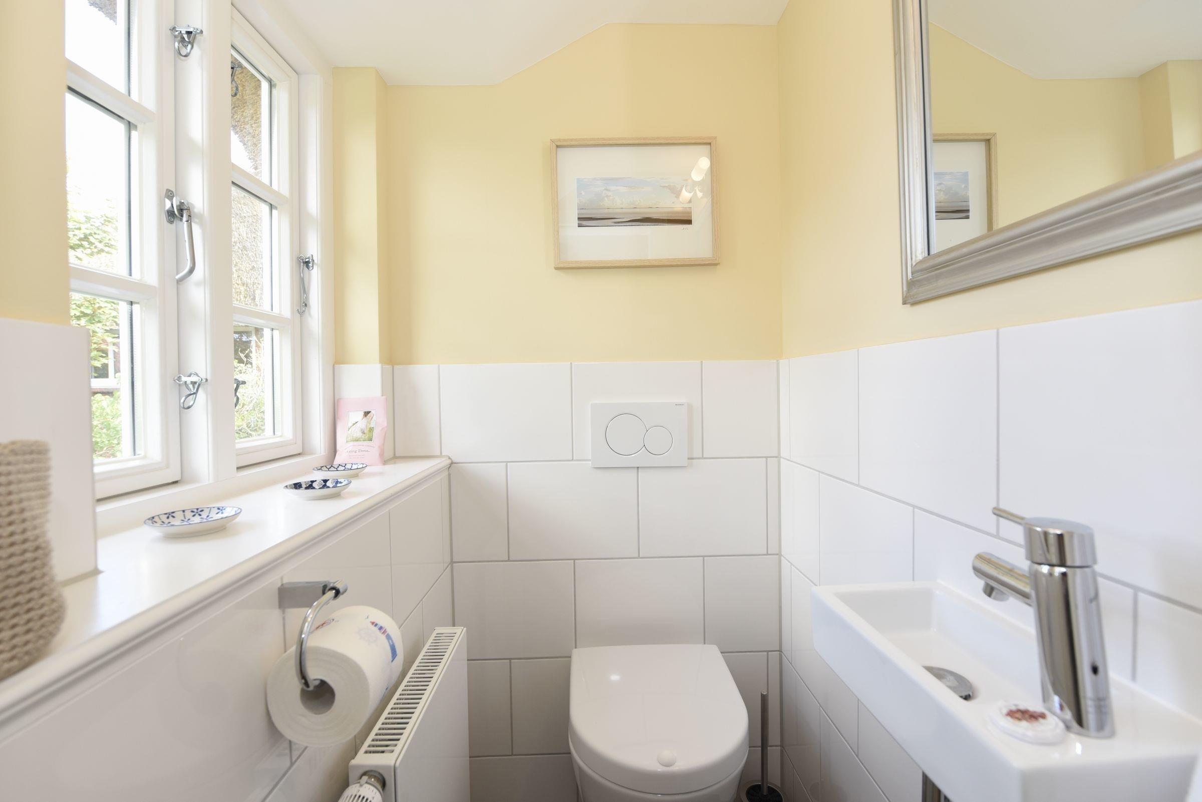 Ein weiteres Highlight des Erdgeschosses ist das stilvolle Dusch-Wannenbad im hinteren Hausteil, das mit besonderen Details wie antiken gußeisernen Stallfenstern begeistert. Diese liebevollen Akzente finden sich im gesamten Haus und machen den Aufenthalt zu etwas ganz Besonderem.