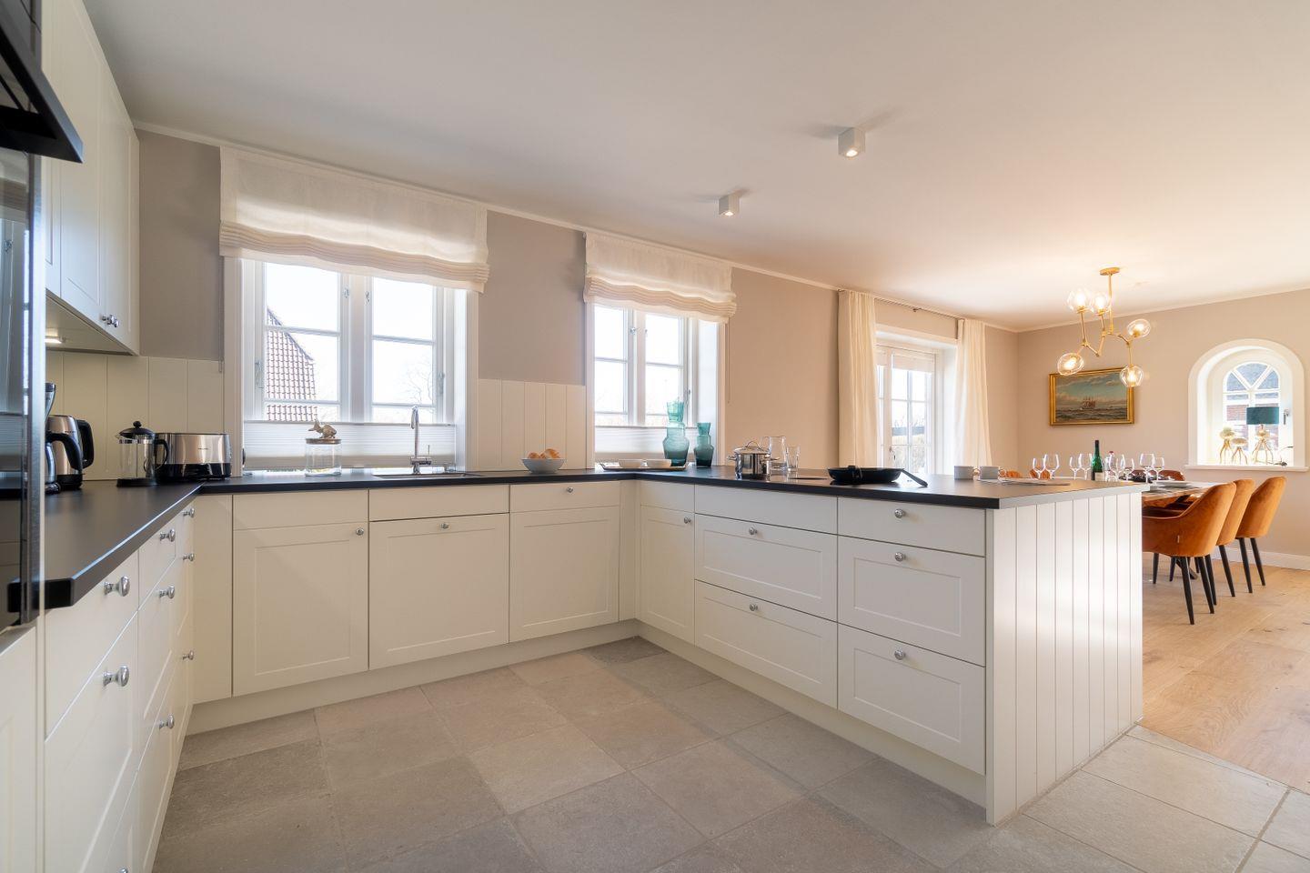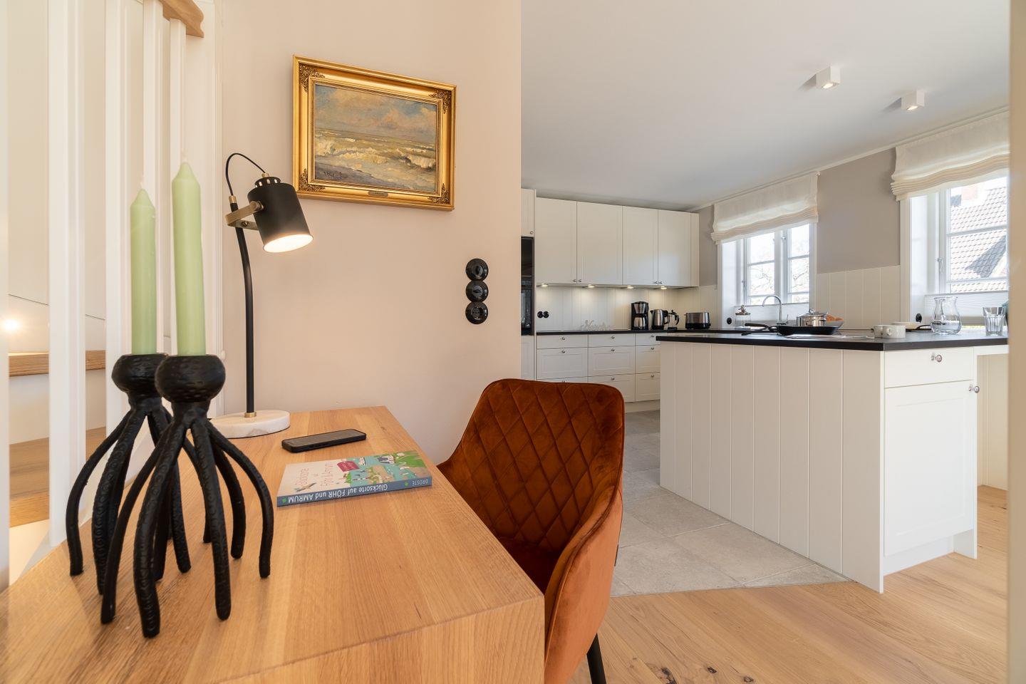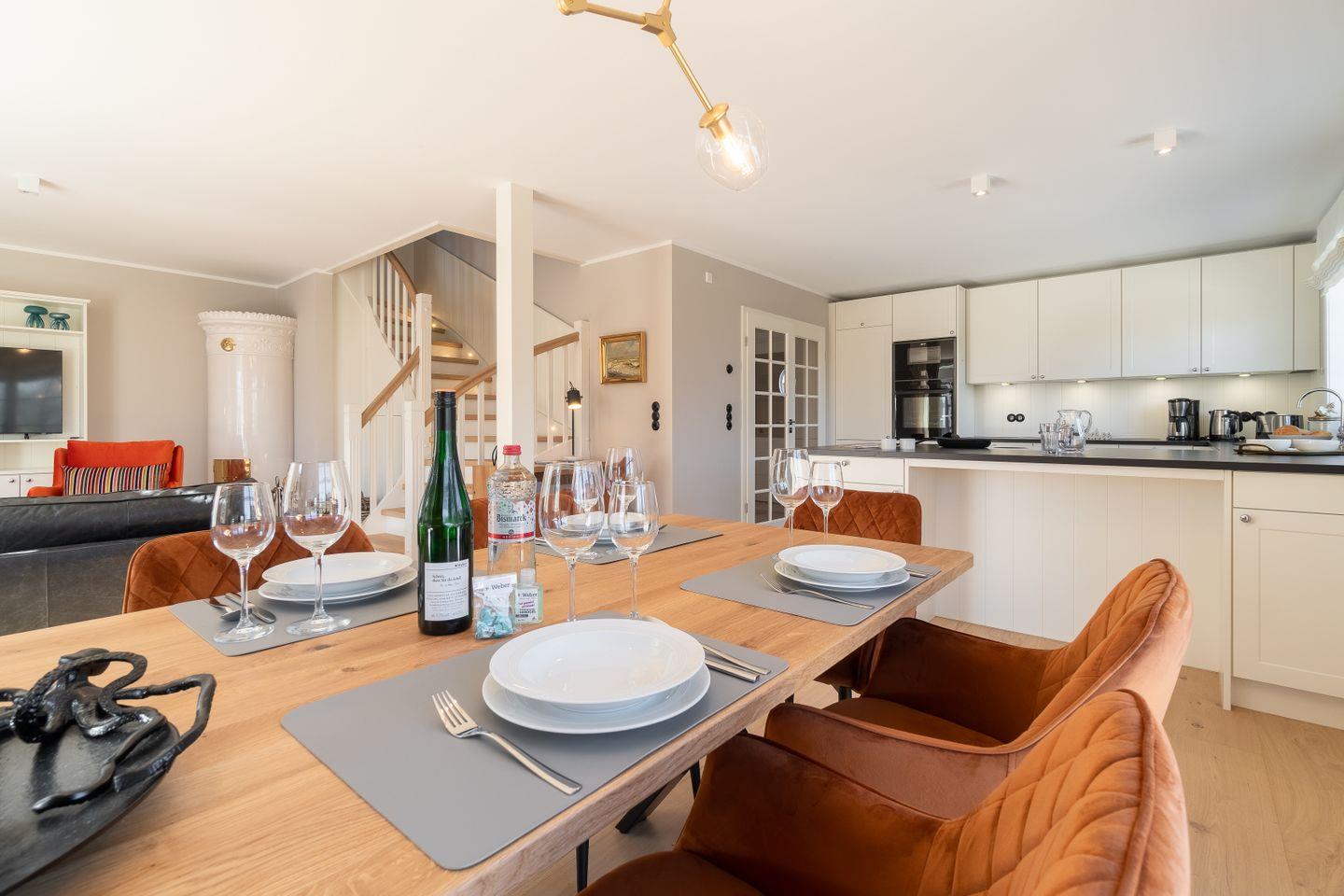 Im Erdgeschoss befinden sich der großzügige Wohn- und Essbereich mit offener Küche, ein Duschbad sowie ein Hauswirtschaftsraum mit Waschmaschine und Trockner. Über den Wohnbereich haben Sie direkten Zugang auf die eigenen Terrassen mit traumhaften Marschblick. Der Original Mylin-Kachelofen sorgt auch an kühleren Tagen für eine wohlige Atmosphäre.