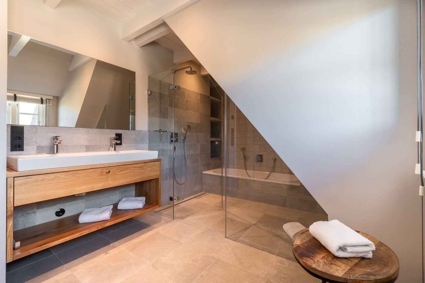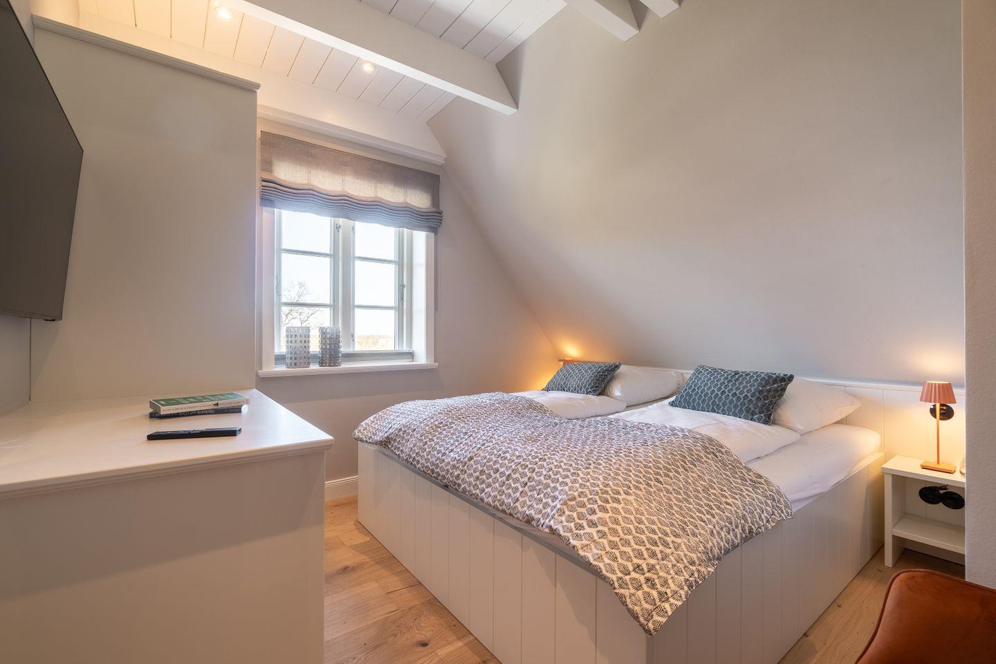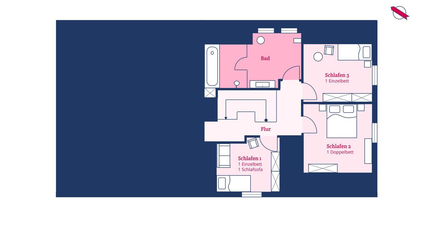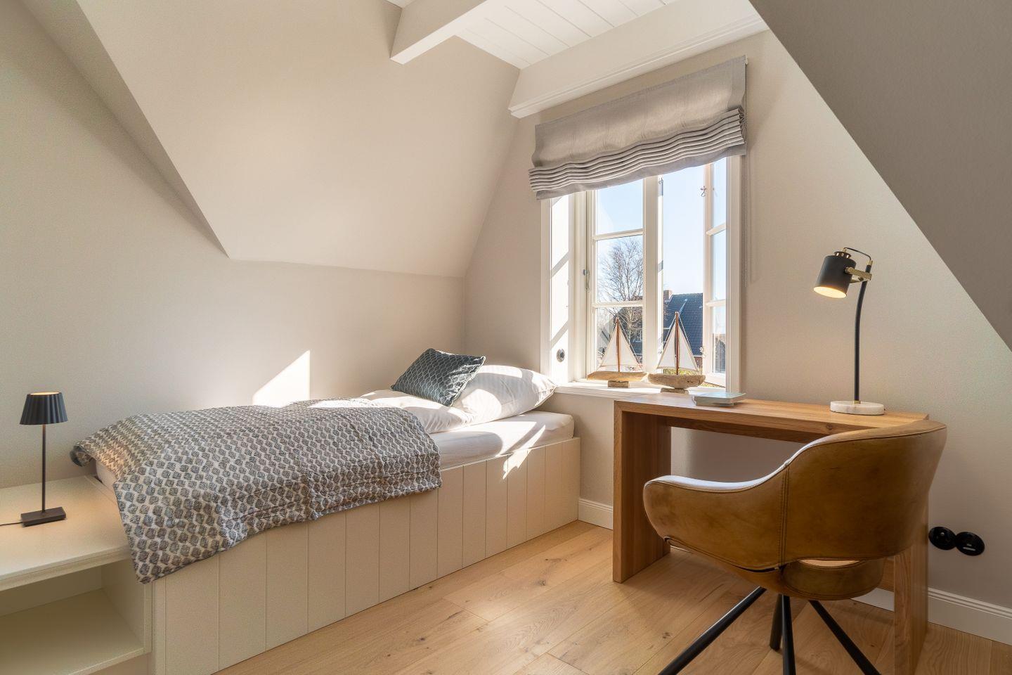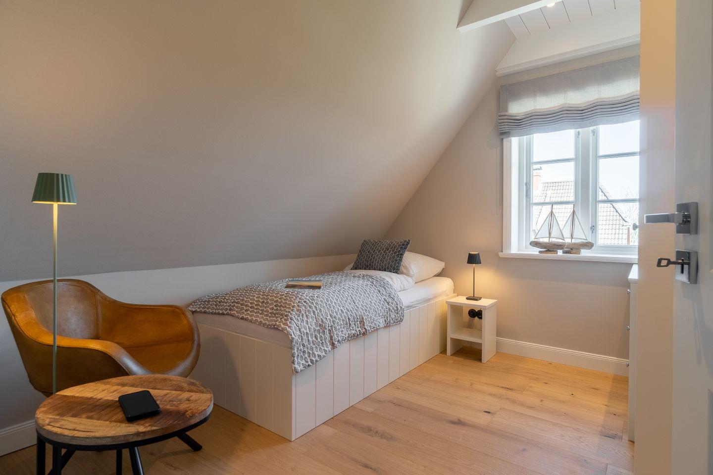 Im Obergeschoss befinden sich die drei Schlafzimmer - eins mit einem Doppelbett und zwei mit je einem Einzelbett. Zudem ist eines der Einzelbettzimmer mit einem Schlafsessel ausgestattet. Im Obergeschoss befindet sich außerdem ein Vollbad mit Dusche und Badewanne.