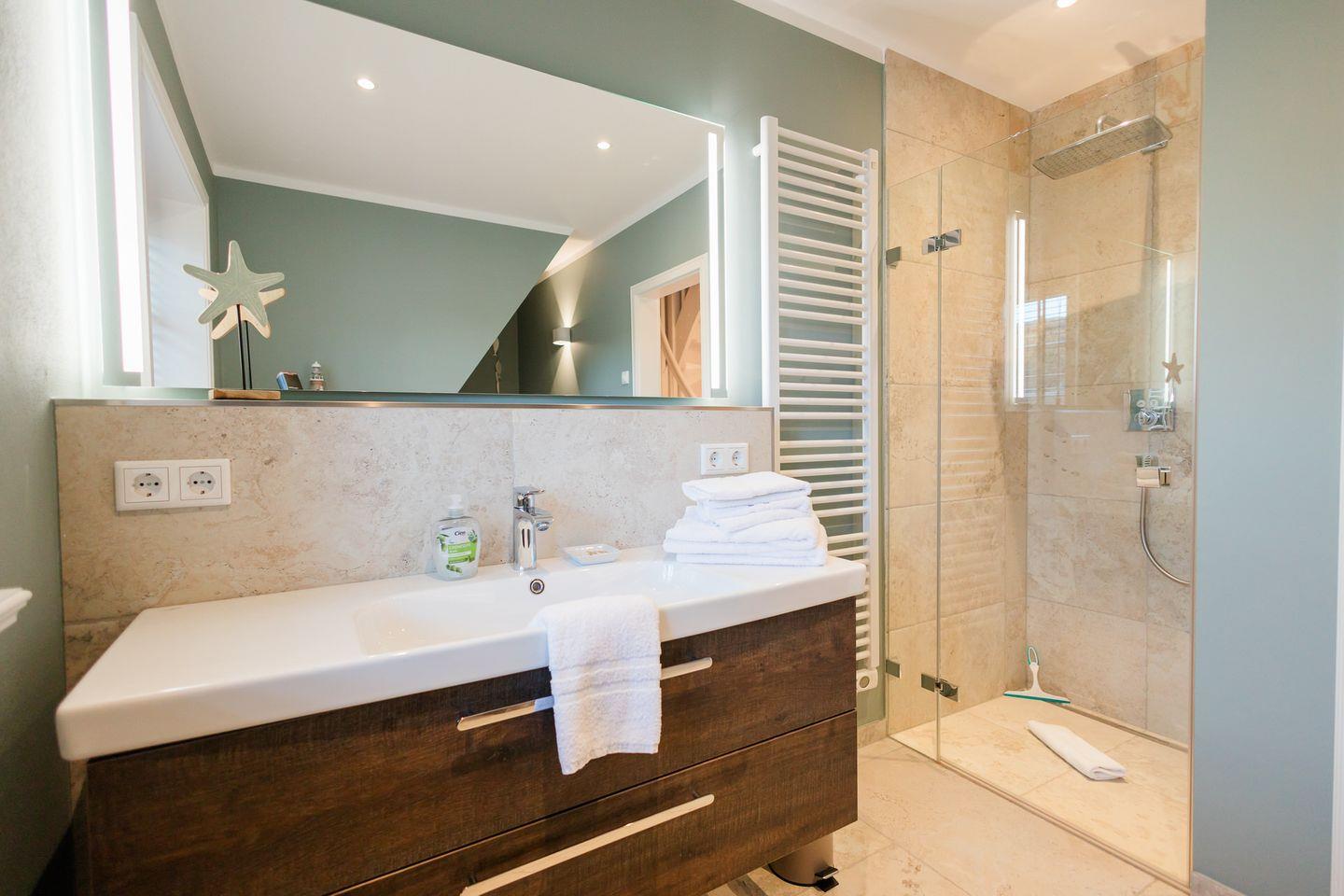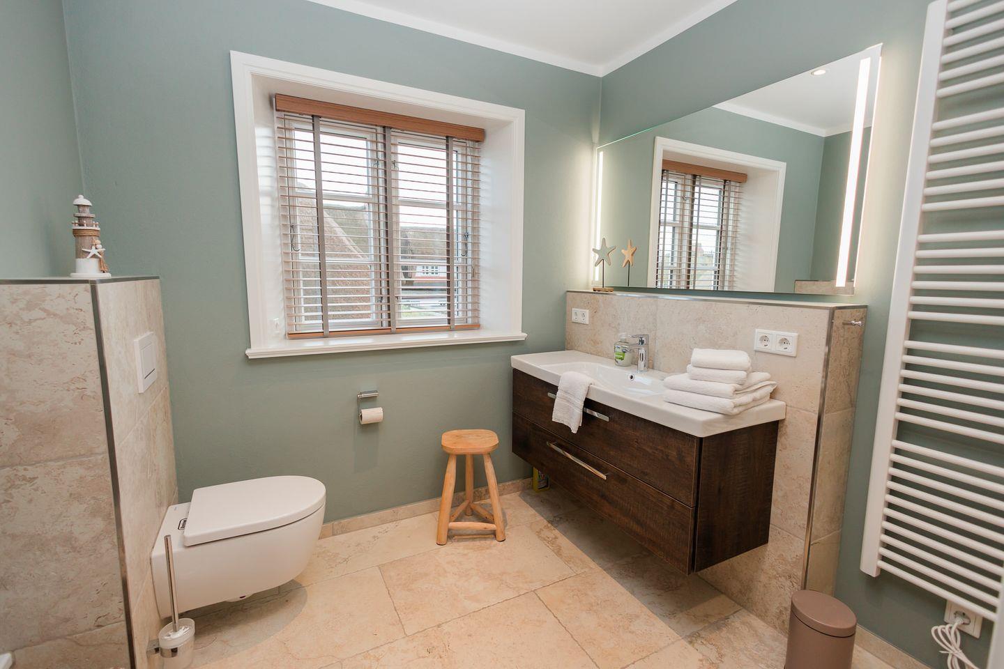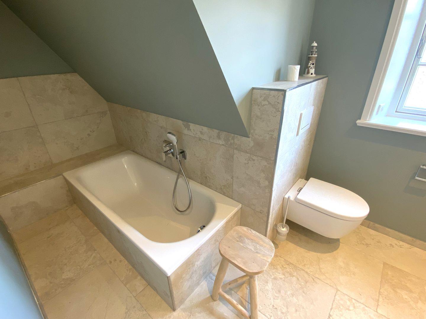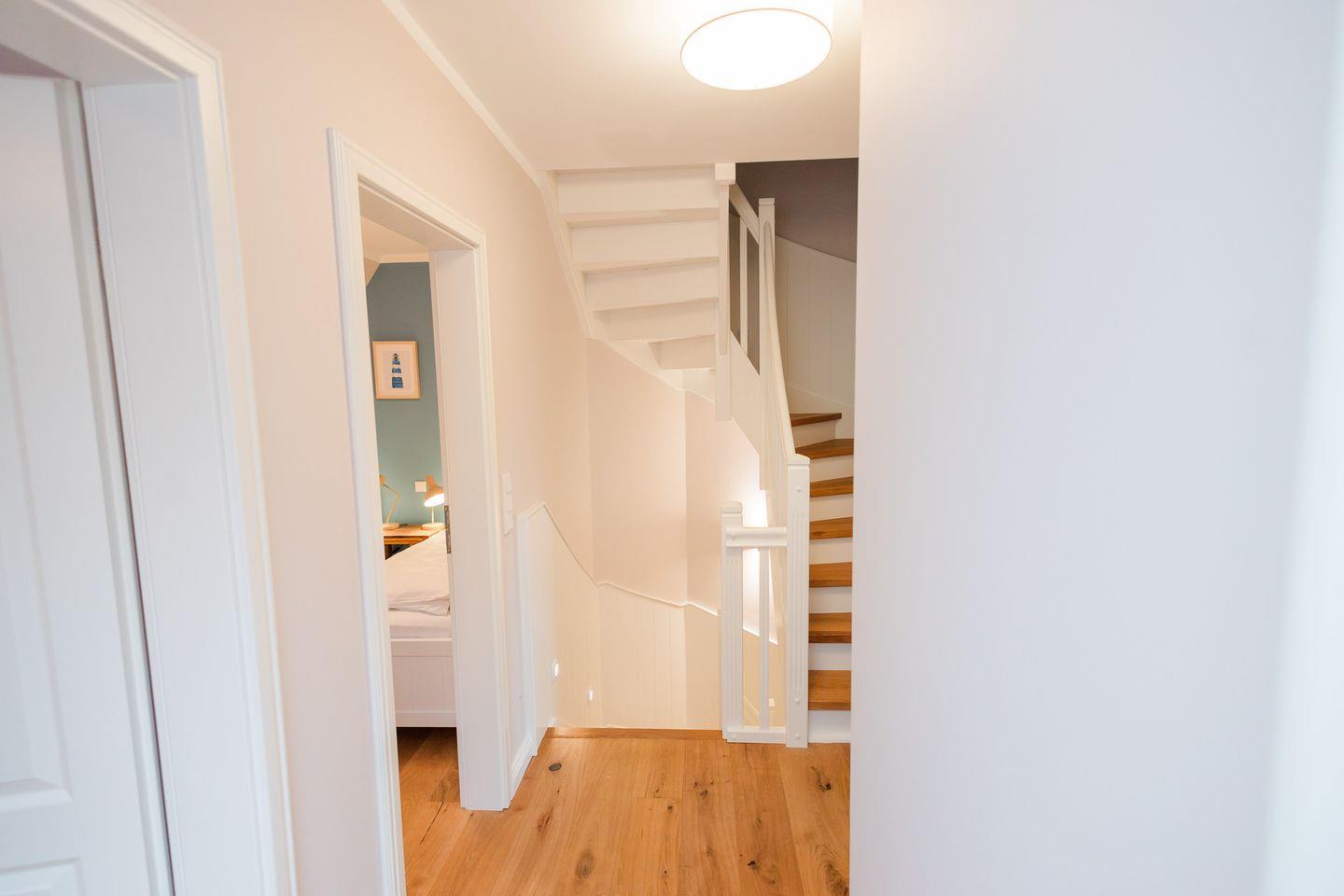 Im Obergeschoss sind die drei Schlafzimmer und ein Vollbad gelegen. Zwei Schlafzimmer sind jeweils mit einem Doppelbett ausgestattet, das dritte Schlafzimmer mit zwei Einzelbetten.