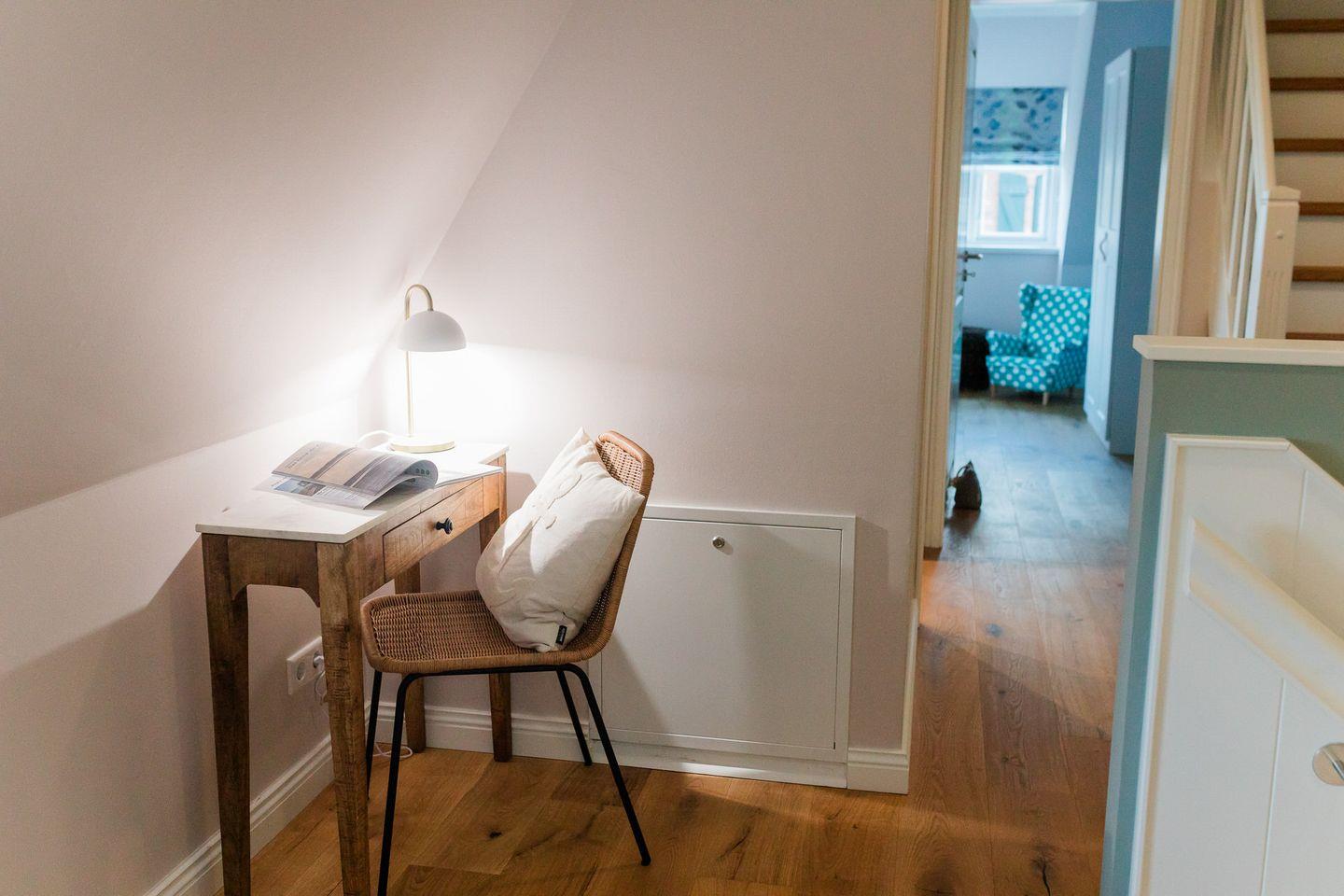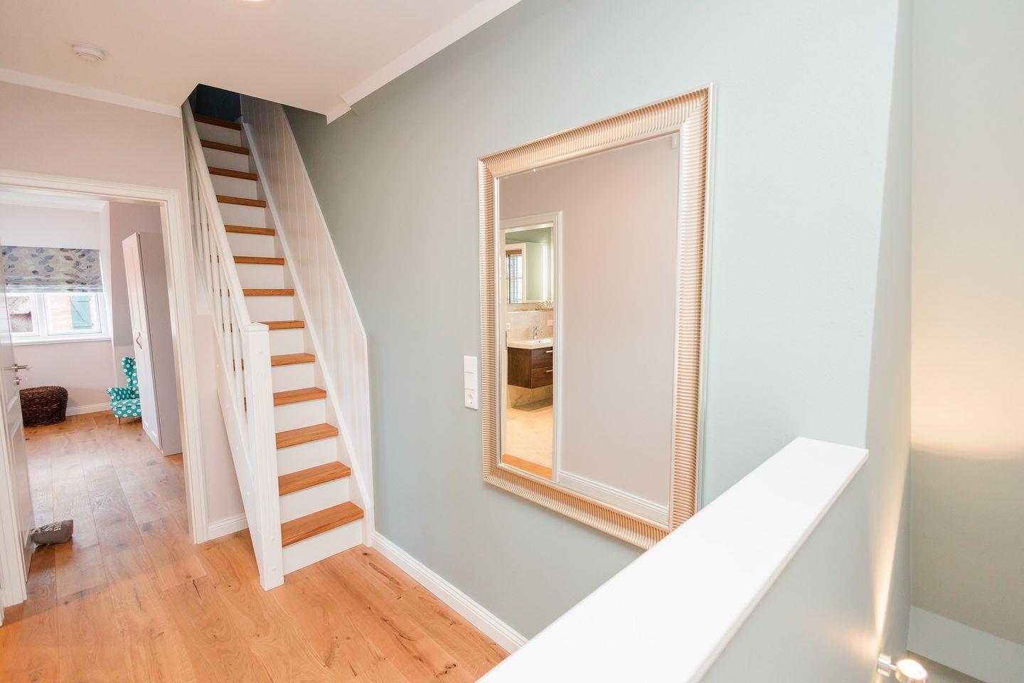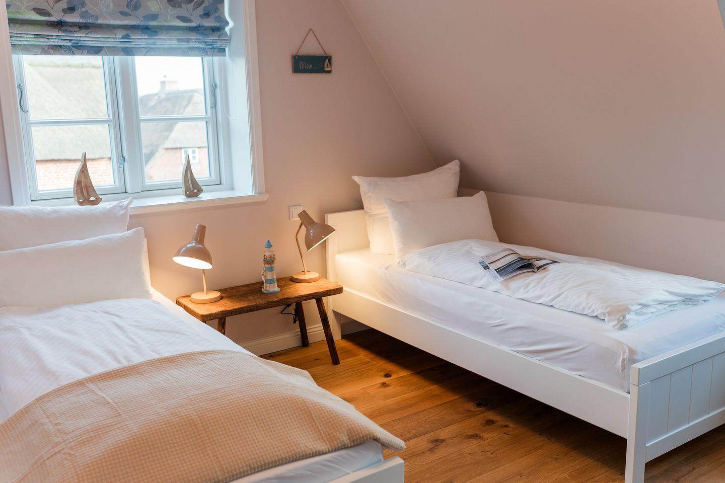 Im Obergeschoss sind die beiden Schlafzimmer und ein Vollbad gelegen. Ein Schlafzimmer ist mit einem Doppelbett ausgestattet, das andere mit zwei Einzelbetten.