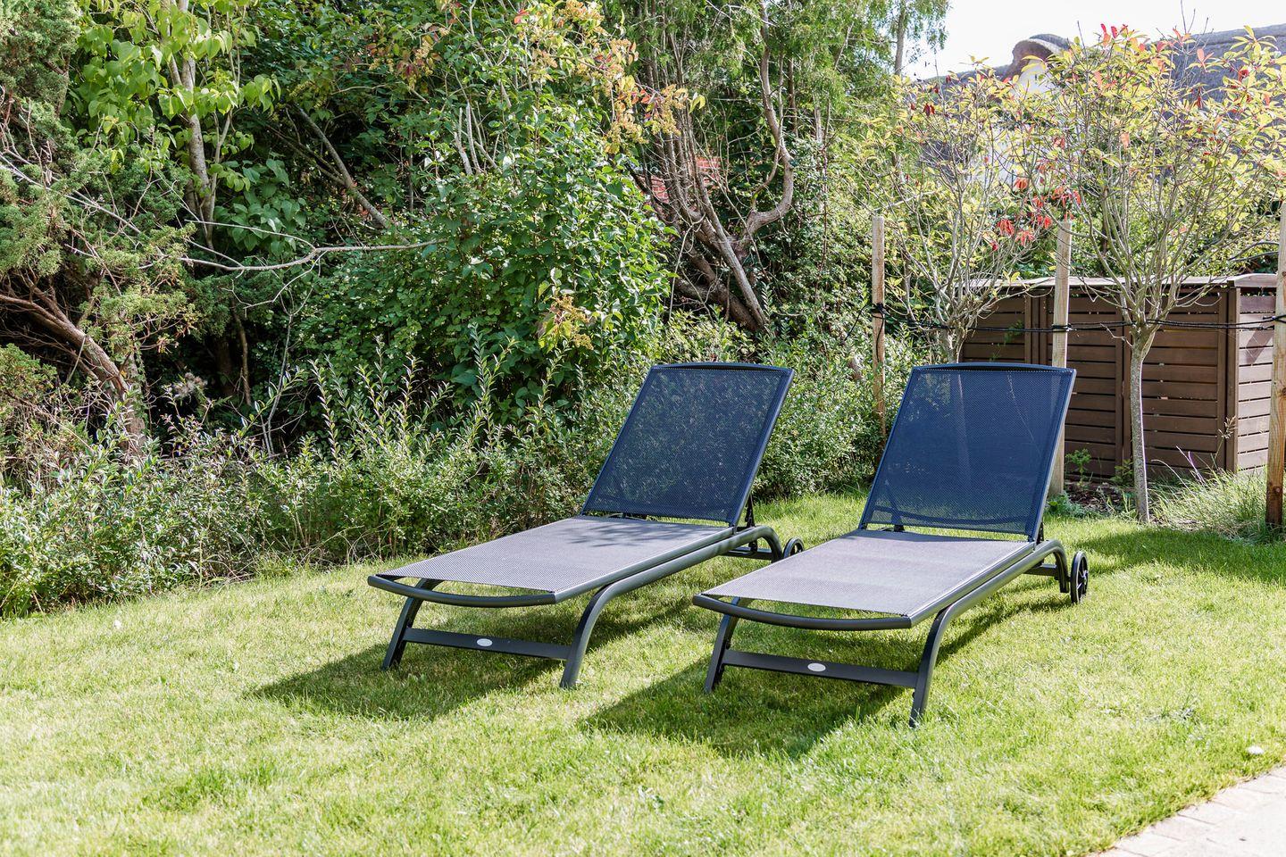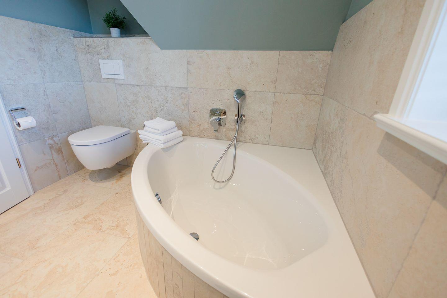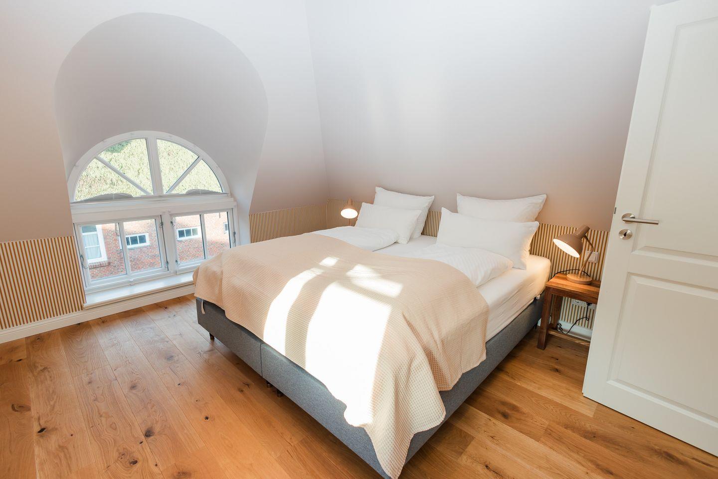 Im Obergeschoss sind die beiden Schlafzimmer und ein Vollbad gelegen. Ein Schlafzimmer ist mit einem Doppelbett ausgestattet, das andere mit zwei Einzelbetten.