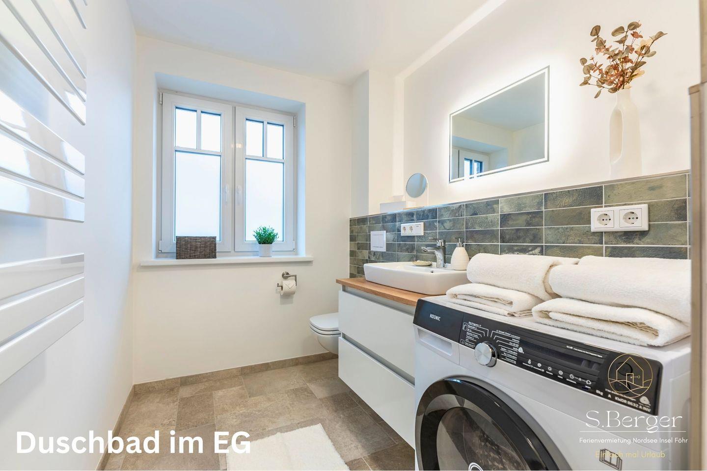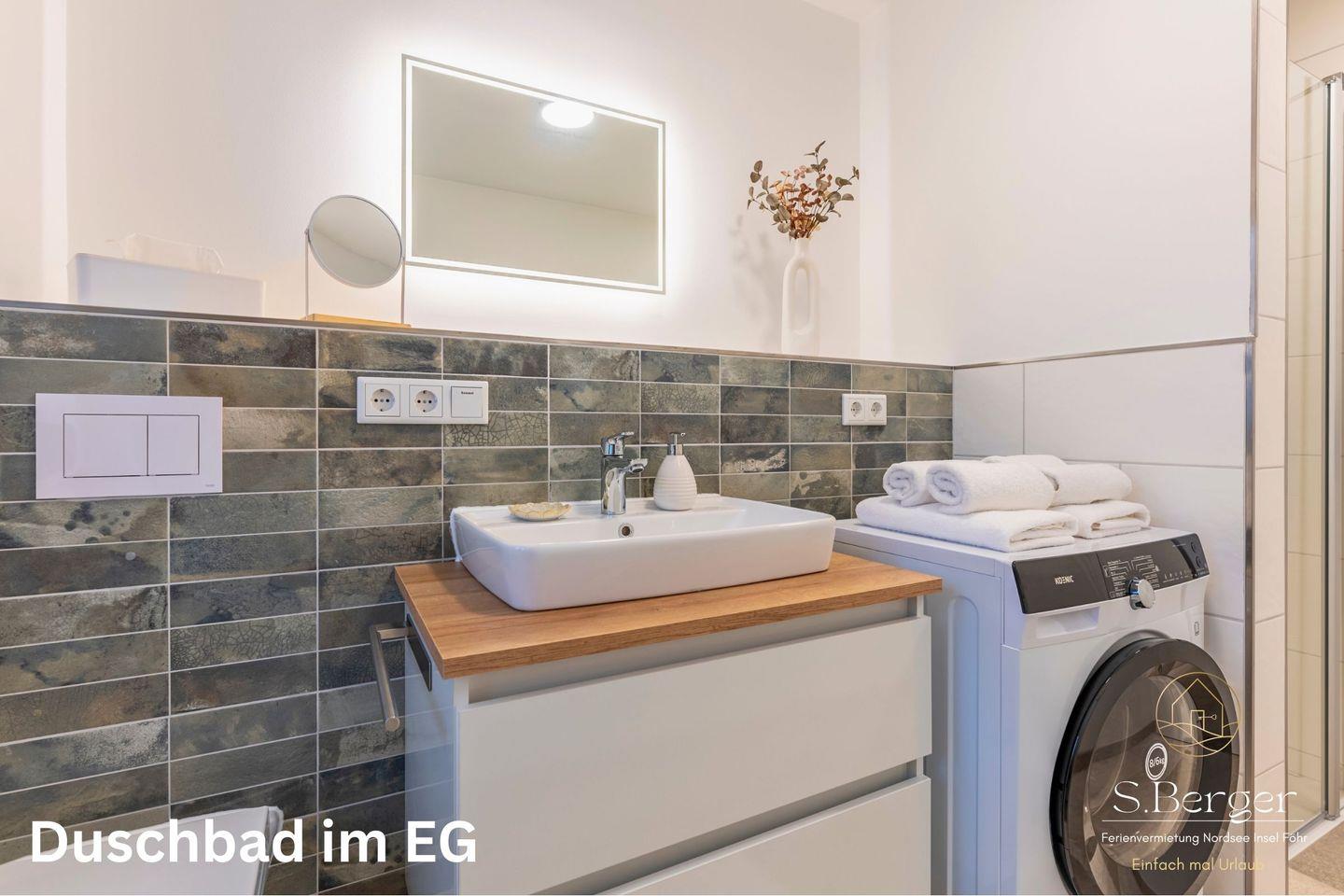 Offener Wohn- und Essbereich mit einer einladenden Sofaecke, einem Esstisch, einem Flachbildfernseher. Die moderne Küche ist ausgestattet mit Herd, Backofen, Geschirrspüler und weiteren Annehmlichkeiten. Das moderne Duschbad verfügt über eine ebenerdige Dusche, eine Waschmaschine, ein Fenster und eine Fußbodenheizung. Ein Schlafzimmer mit Verdunklungsplissees ist ebenfalls vorhanden.