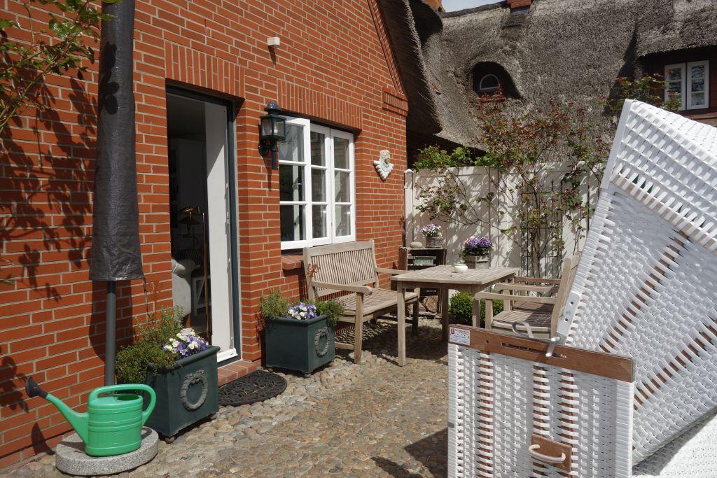 Ein besonderes Highlight der Ferienwohnung Sonnenblume ist die liebevoll gestaltete Terrasse, auf der Sie bei gutem Wetter entspannen können. Der Garten bietet nicht nur einen herrlichen Blick, sondern auch verschiedene Spielmöglichkeiten für die kleinen Gäste. Hier stehen Ihnen ein Sandkasten, eine Schaukel und Gartenmöbel zur Verfügung. Ein Strandkorb und ein Sonnenschirm laden dazu ein, die Sonnenstrahlen in Ruhe zu genießen.