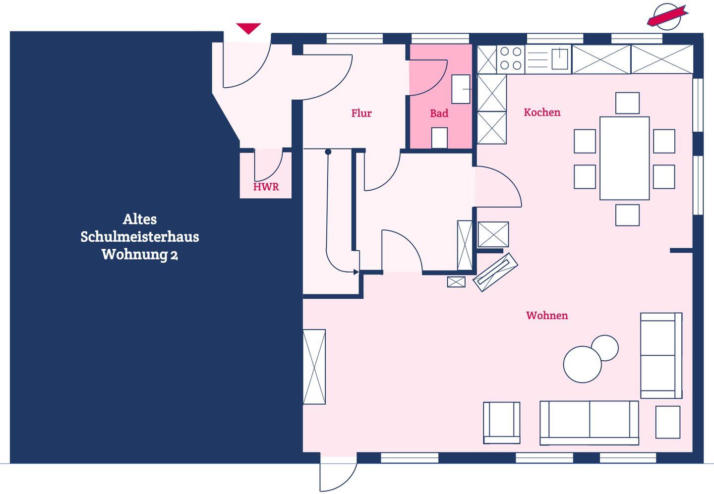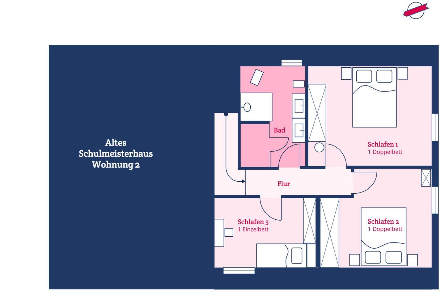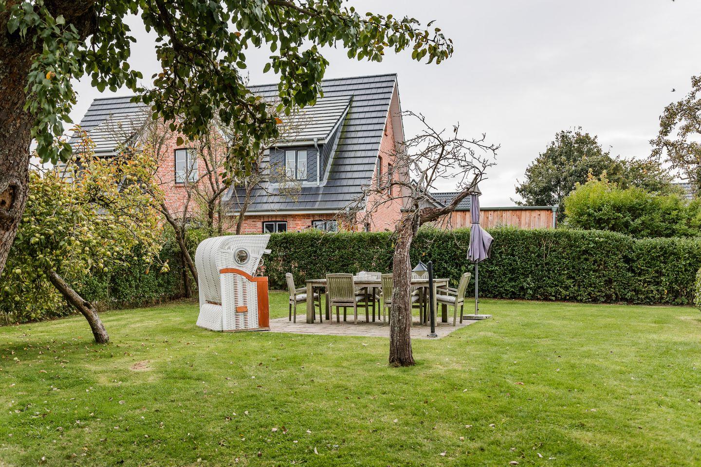 Das Schulmeisterhaus ist aufgeteilt in zwei Ferienwohnungen, die sich jeweils über das Erd- und Obergeschoss erstrecken. Links ist die Ferienwohnung "Große Pause" gelegen und rechts die "Kleine Ferien". Ein wunderschöner Garten mit alten Obstbäumen, von denen Sie sich selbstverständlich bedienen können, rundet das Ambiente ab. Jeder Ferienwohnung ist ein eigener Terrassenplatz zugeordnet, welcher neben dem Gartenmobiliar auch über einen Sonnenschirm und einen eigenen Strandkorb verfügt. Auch ein eigener Wohnungs-PKW-Stellplatz ist direkt am Haus gegeben.