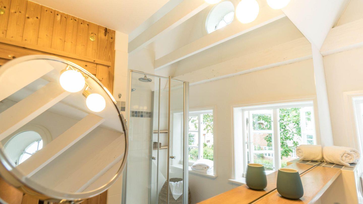 Das Schulmeisterhaus ist aufgeteilt in zwei Ferienwohnungen, die sich jeweils über das Erd- und Obergeschoss erstrecken. Links ist die Ferienwohnung "Große Pause" gelegen und rechts die "Kleine Ferien". Ein wunderschöner Garten mit alten Obstbäumen, von denen Sie sich selbstverständlich bedienen können, rundet das Ambiente ab. Jeder Ferienwohnung ist ein eigener Terrassenplatz zugeordnet, welcher neben dem Gartenmobiliar auch über einen Sonnenschirm und einen eigenen Strandkorb verfügt. Auch ein eigener Wohnungs-PKW-Stellplatz ist direkt am Haus gegeben.