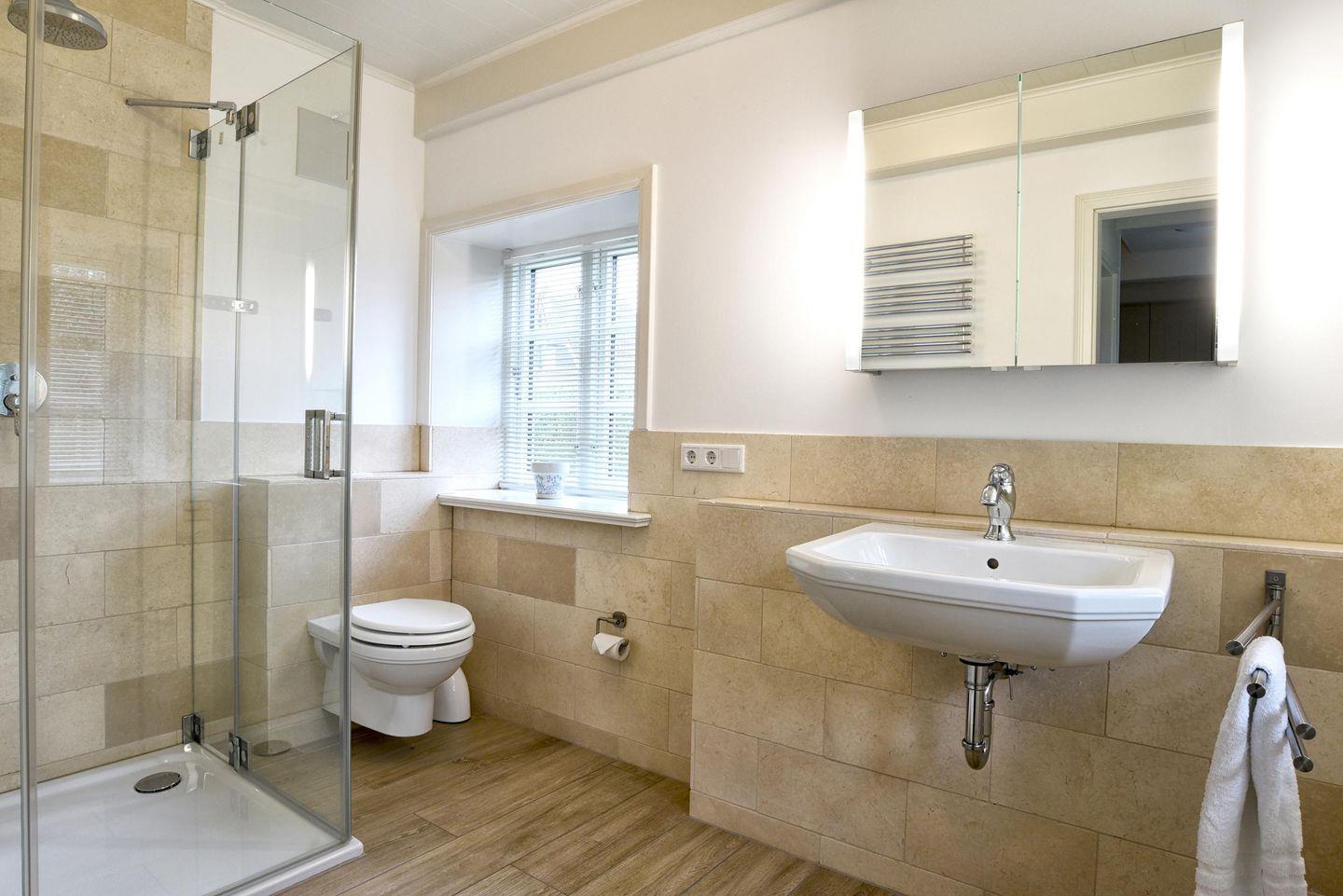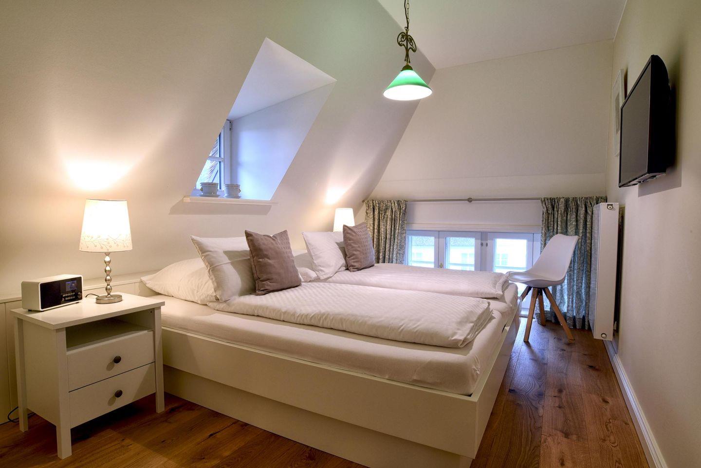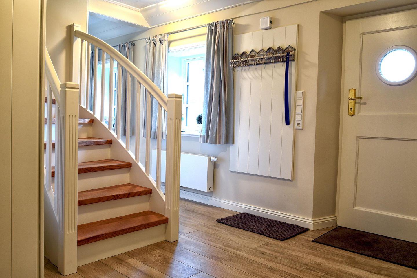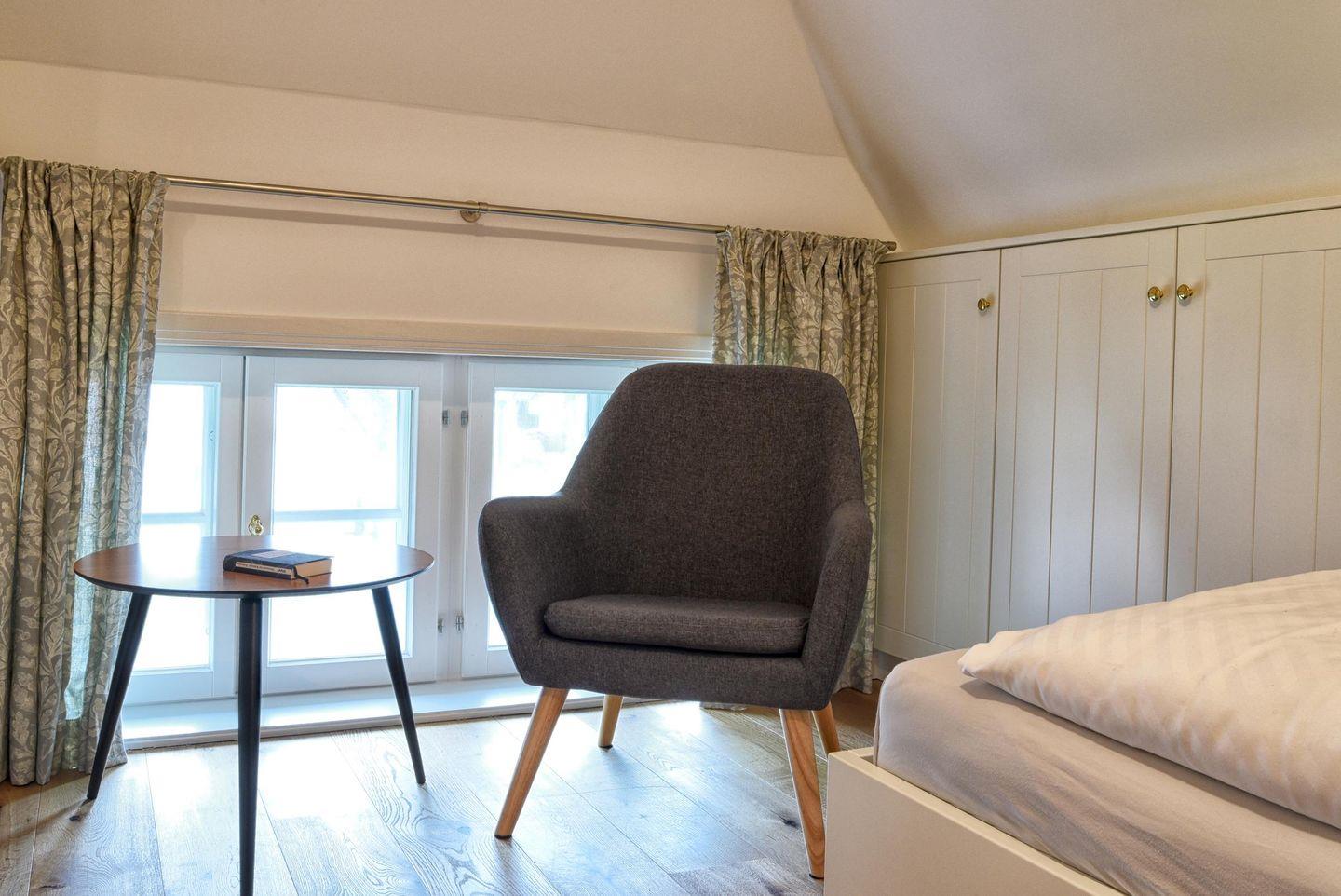 Im Obergeschoss befinden sich alle drei Schlafzimmer sowie ein weiteres Badezimmer. Ein Schlafzimmer ist mit einem Queensize-Bett (140 cm) ausgestattet und die anderen beiden Zimmer mit jeweils einem Doppelbett. Alle drei Schlafzimmer verfügen über einen Smart-TV und einen Kleiderschrank. In dem modern eingerichteten Badezimmer befindet sich eine Regendusche.