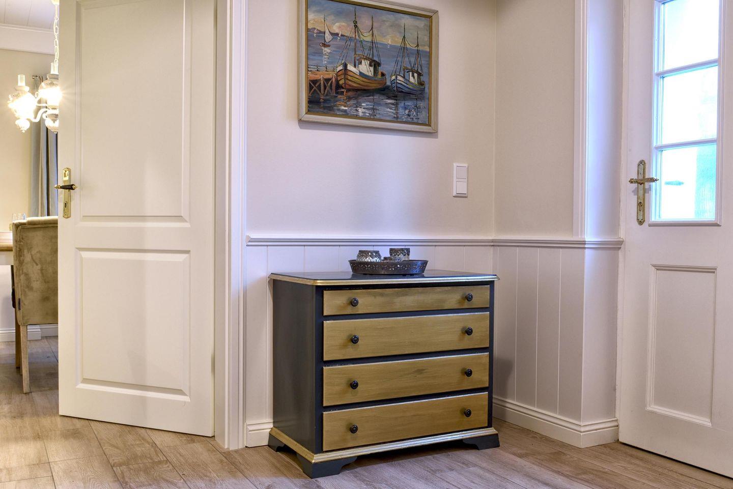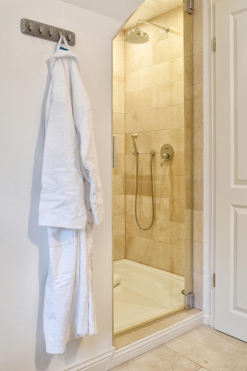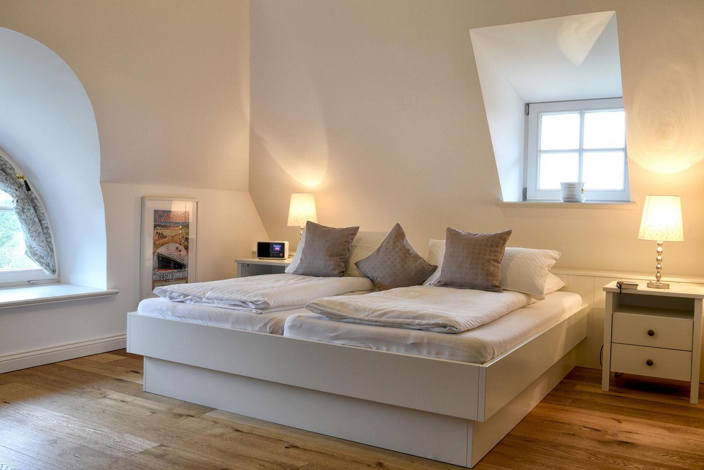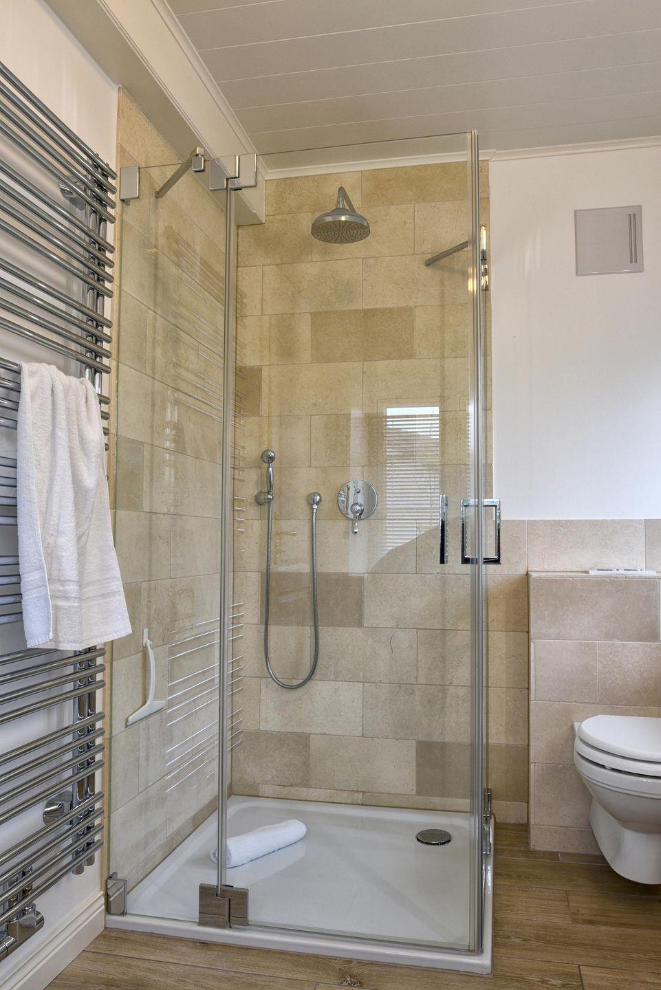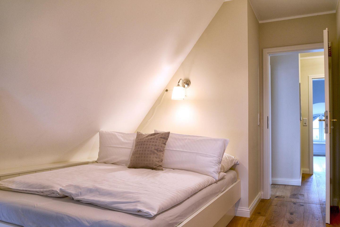 Im Obergeschoss befinden sich alle drei Schlafzimmer sowie ein weiteres Badezimmer. Ein Schlafzimmer ist mit einem Queensize-Bett (140 cm) ausgestattet und die anderen beiden Zimmer mit jeweils einem Doppelbett. Alle drei Schlafzimmer verfügen über einen Smart-TV und einen Kleiderschrank. In dem modern eingerichteten Badezimmer befindet sich eine Regendusche.