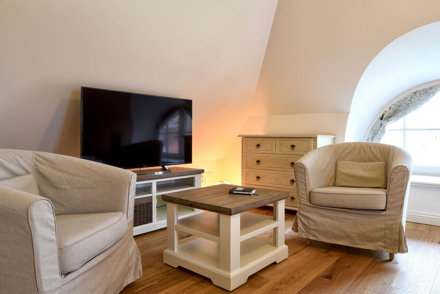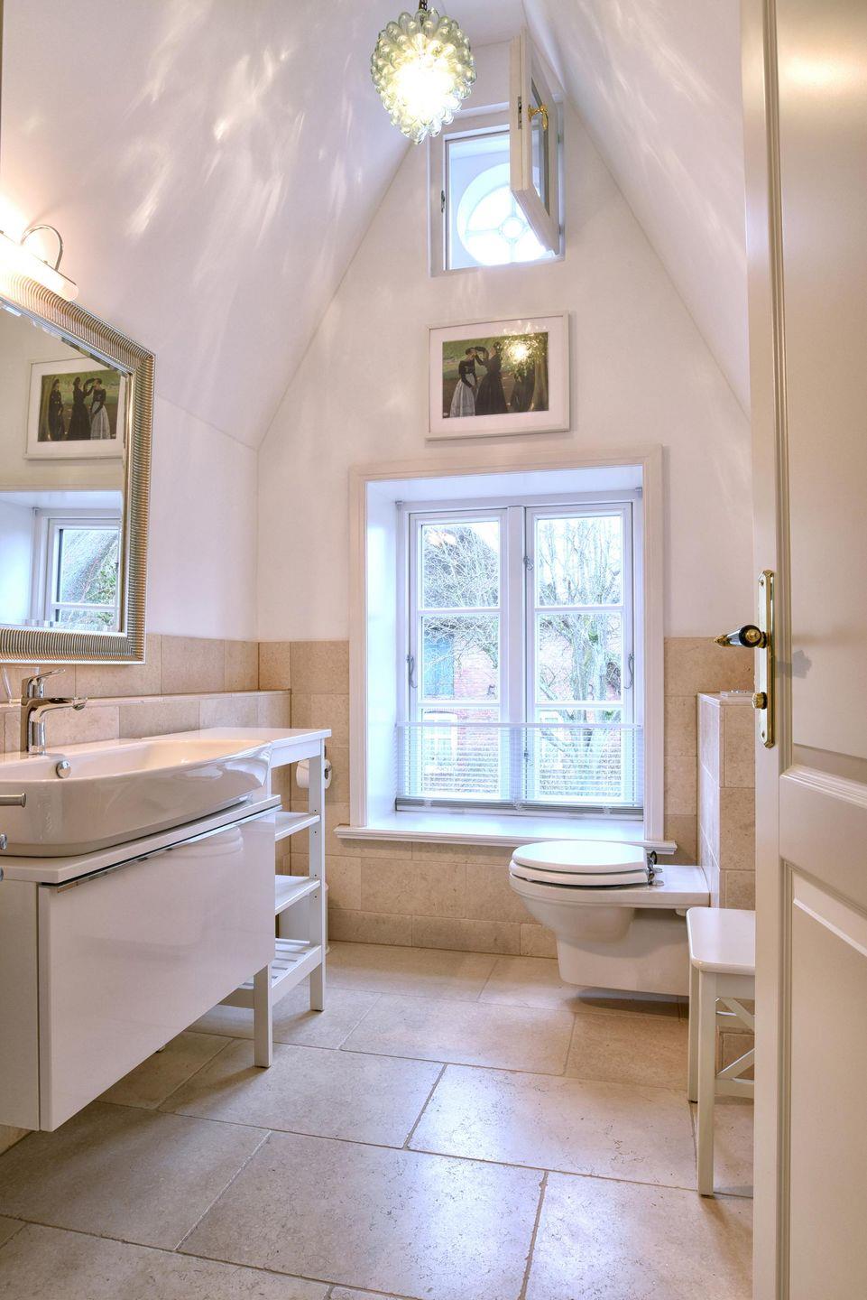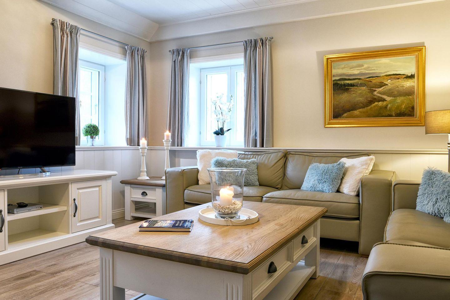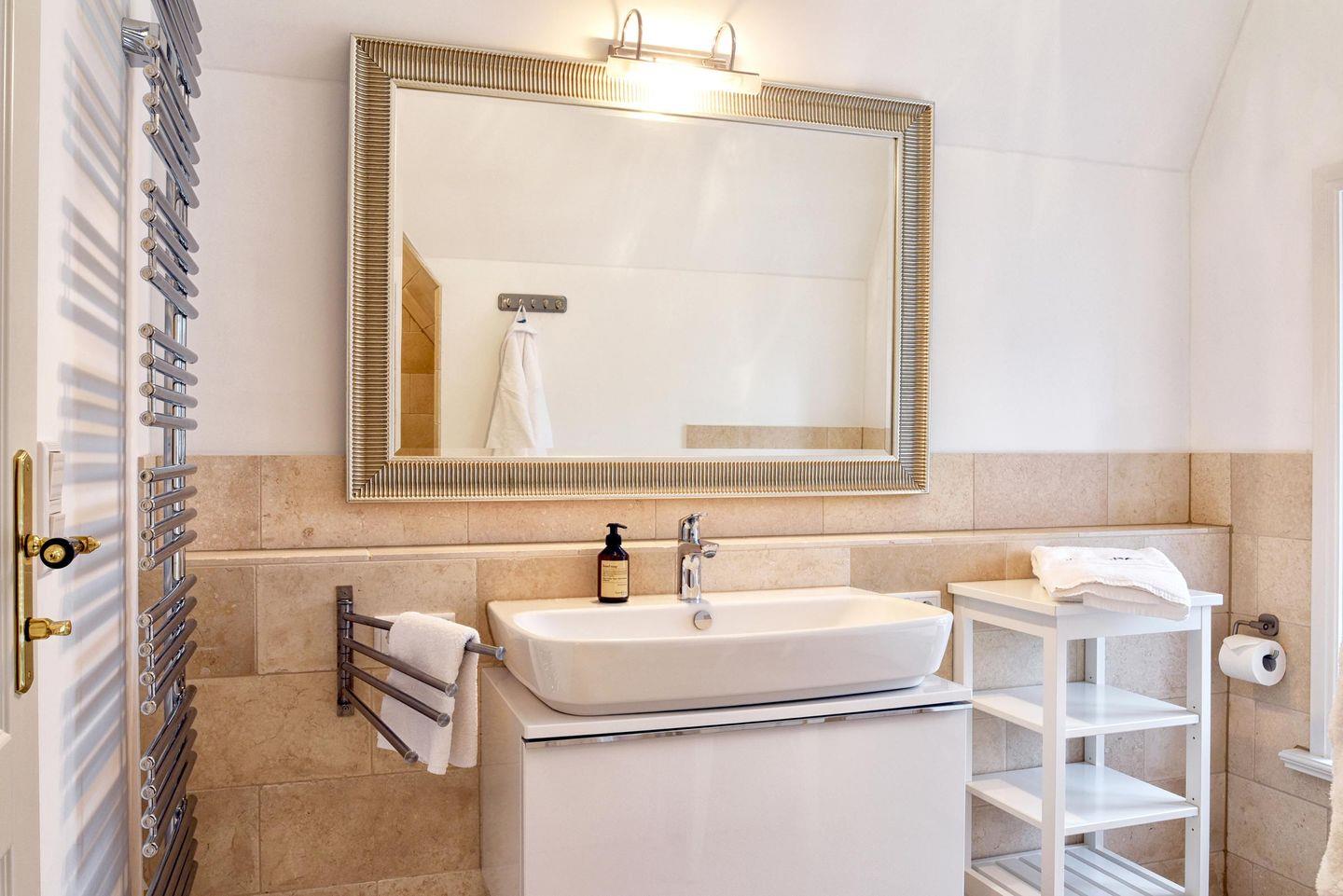 Im Obergeschoss befinden sich alle drei Schlafzimmer sowie ein weiteres Badezimmer. Ein Schlafzimmer ist mit einem Queensize-Bett (140 cm) ausgestattet und die anderen beiden Zimmer mit jeweils einem Doppelbett. Alle drei Schlafzimmer verfügen über einen Smart-TV und einen Kleiderschrank. In dem modern eingerichteten Badezimmer befindet sich eine Regendusche.