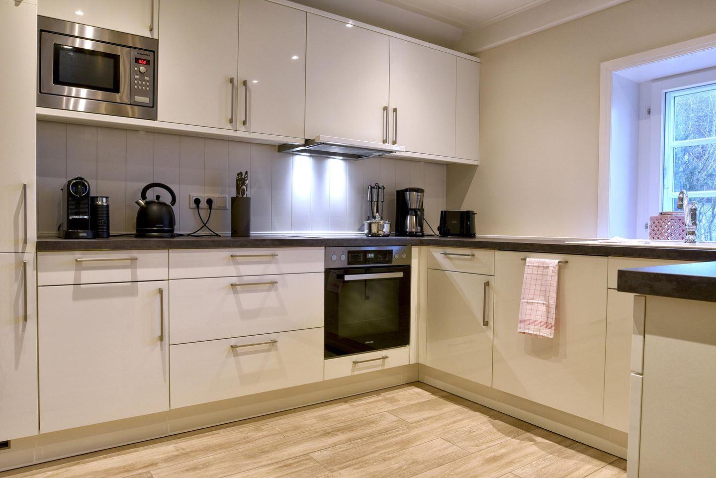 Im Erdgeschoss befindet sich die großzügige Küche, der Wohnbereich, eines der beiden Badezimmer sowie ein Hauswirtschaftsraum. Die Küche ist voll ausgestattet und verfügt über einen Esstisch für bis zu 6 Personen und einen Smart-TV. Außerdem ist in der Küche eine Nespresso Kapselmaschine vorhanden. Das hell eingerichtete Wohnzimmer ist ebenfalls mit einem Smart-TV und einer gemütlichen Sofaecke, sowie einem Internetradio ausgestattet. Das Badezimmer im Erdgeschoss beinhaltet eine bodengleiche Dusche. In dem Hauswirtschaftsraum finden Sie Waschmaschine und Trockner vor. Von dem großzügigen Flur gelangen Sie in den Garten und zur Terrasse. Das Badezimmer, das Wohnzimmer und die Küche werden über eine Fußbodenheizung mit Wärme versorgt.