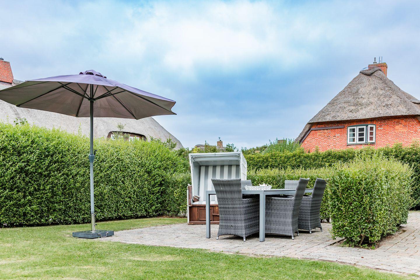 Hochwertiges Reetdachhaus mit einem großen Garten, Terrasse und außenliegender Sauna.