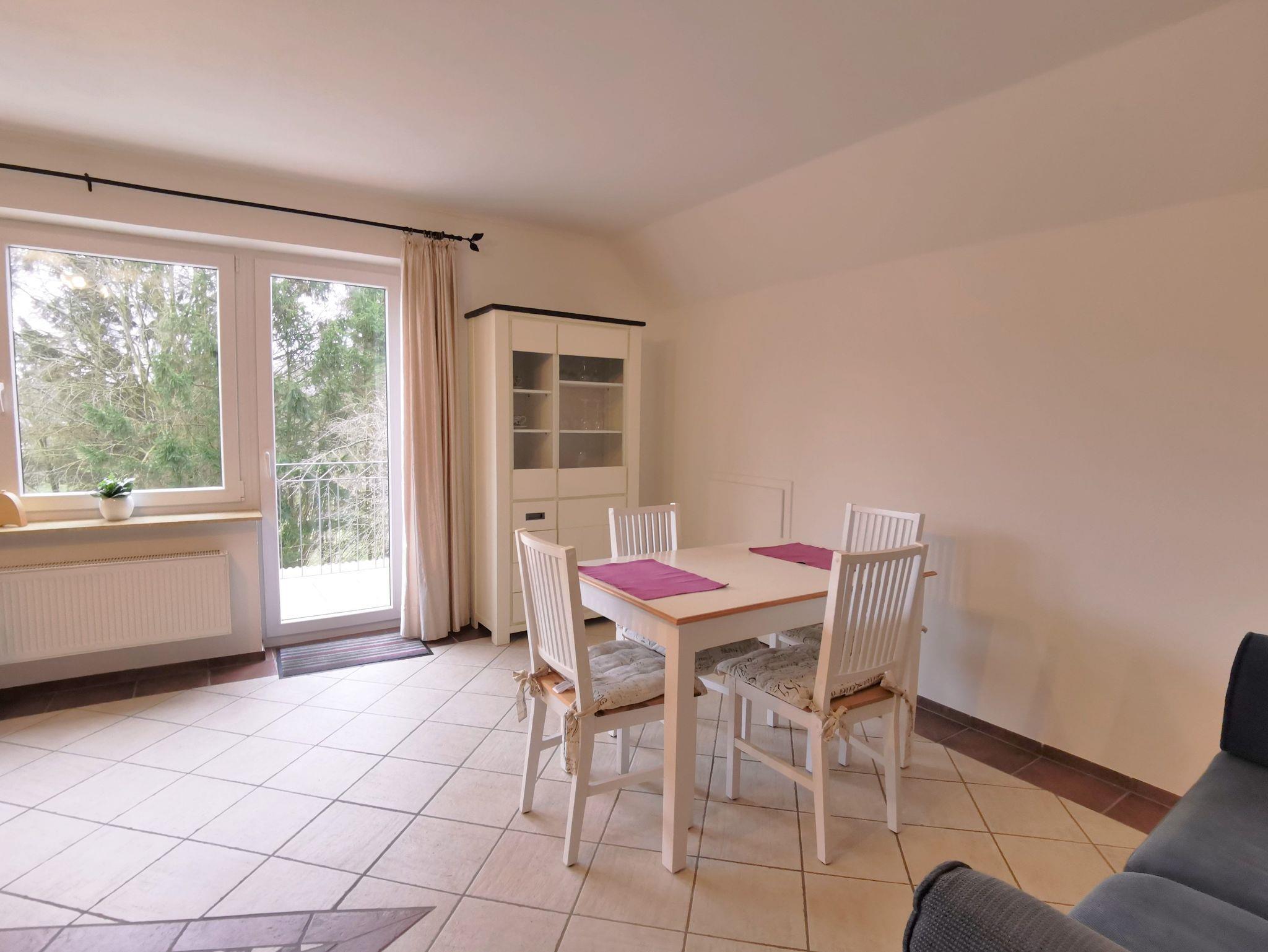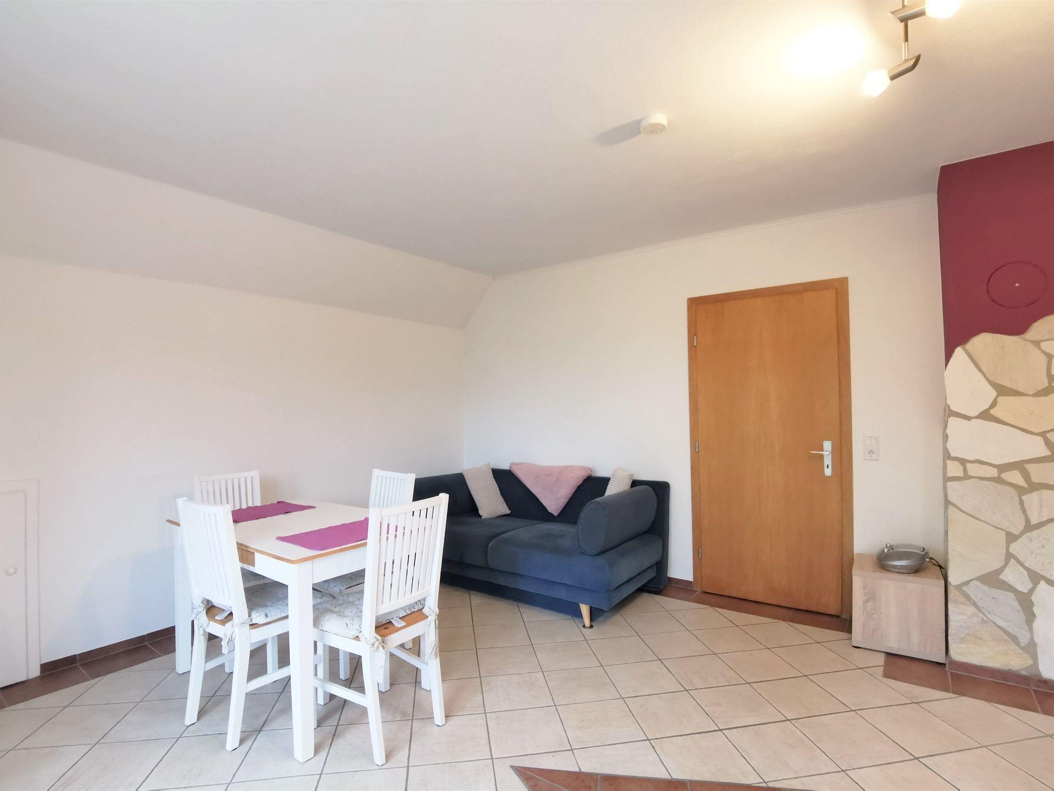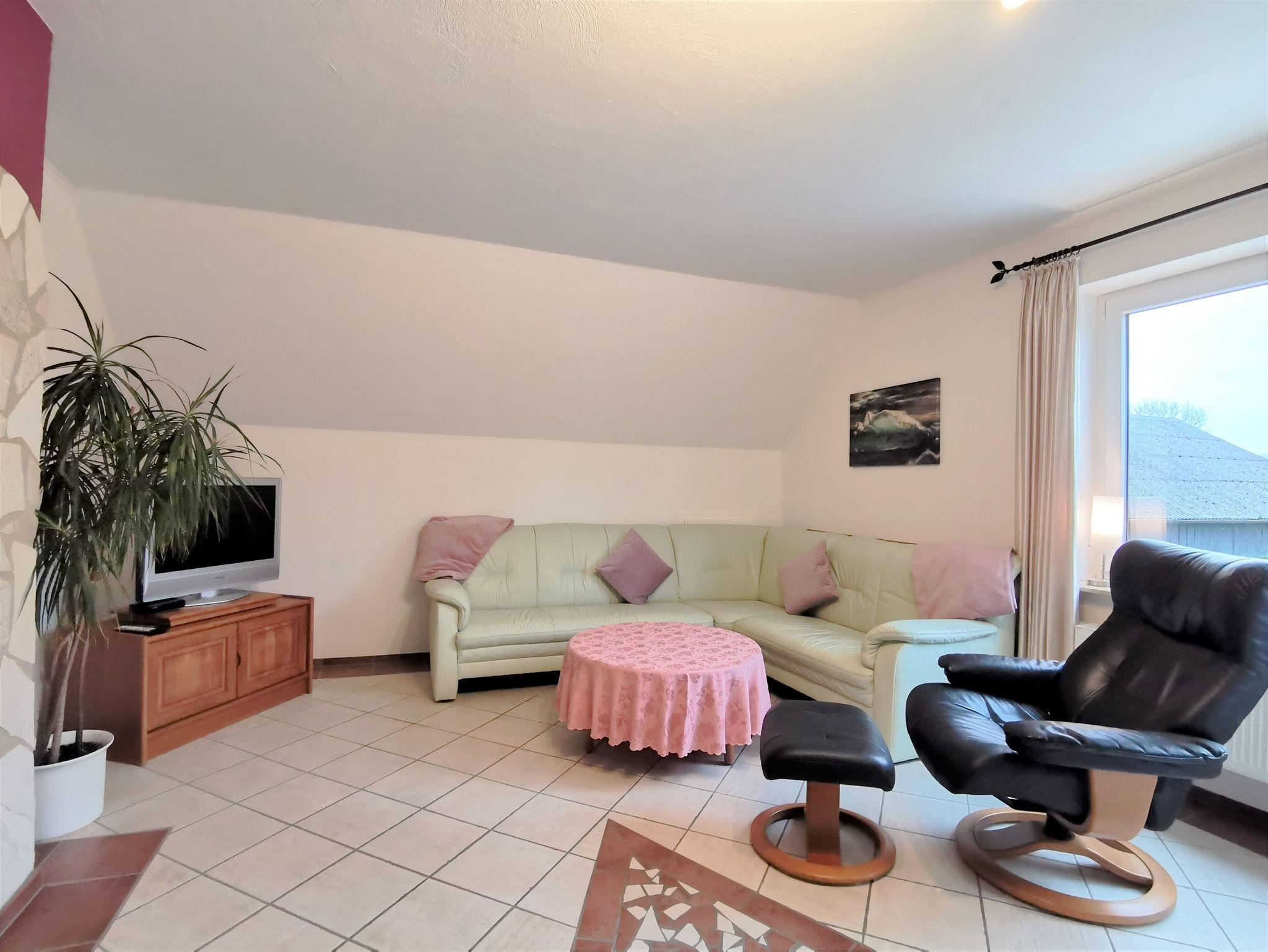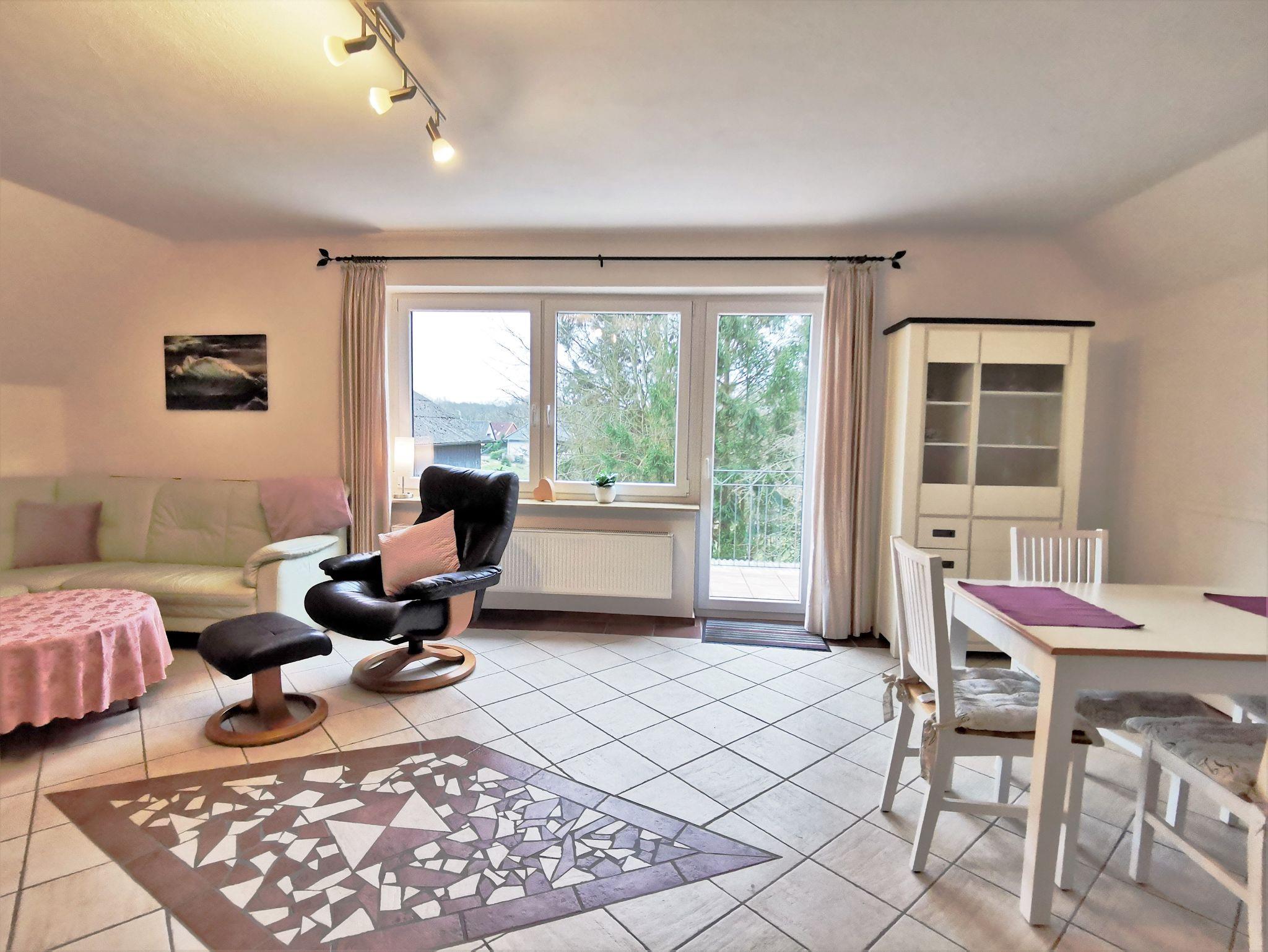 Die geräumige Ferienwohnung bietet ausreichen Platz und ist ansprechend ausgestattet: Das große Wohnzimmer hat eine gemütliche Sofaecke und einen bequemen Ledersessel sowie einen Esstisch und ein weiteres Sofa. Vom Wohnzimmer aus ist der kleine Balkon mit Sitzgelegenheit und Blick in den schönen Garten begehbar.