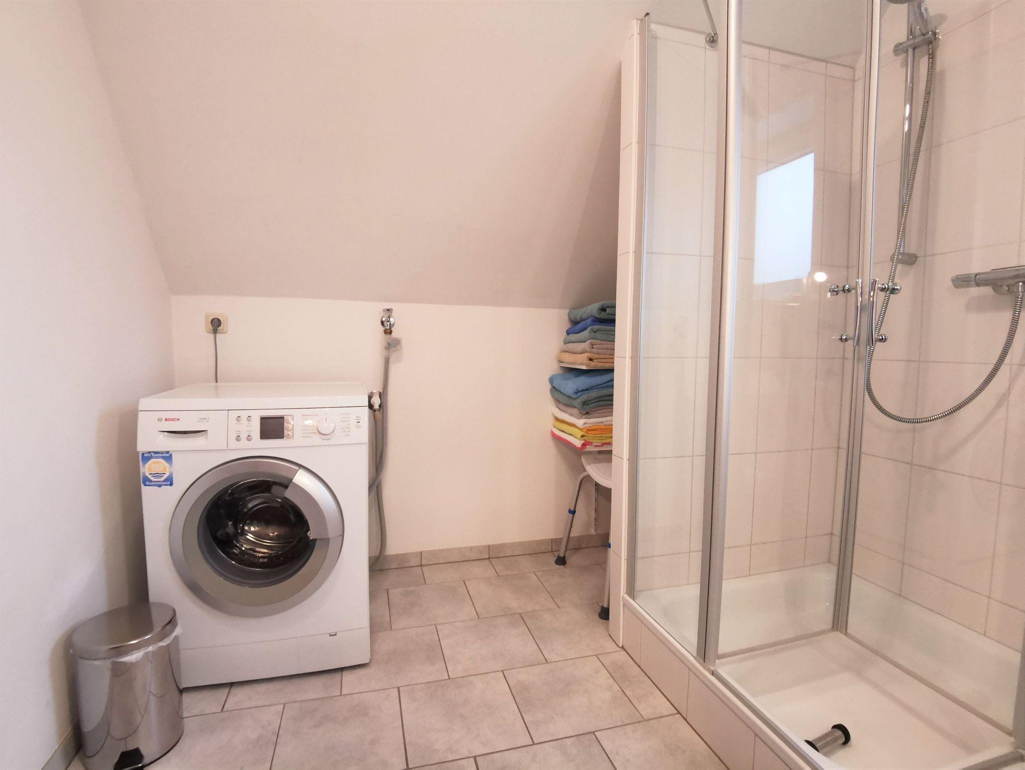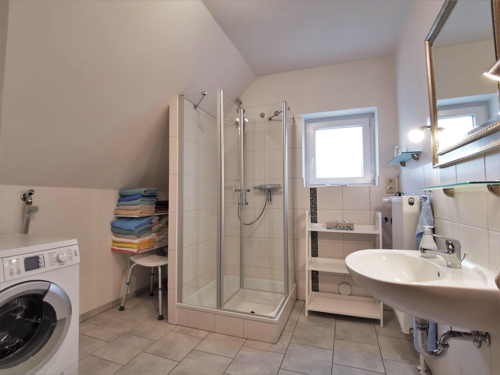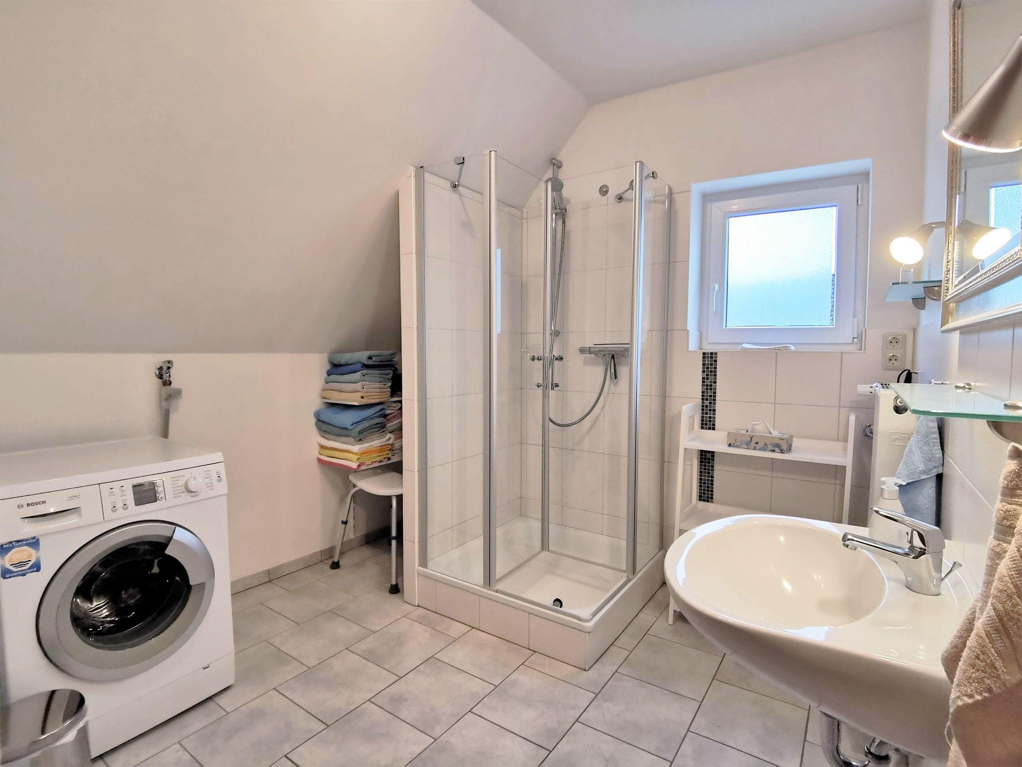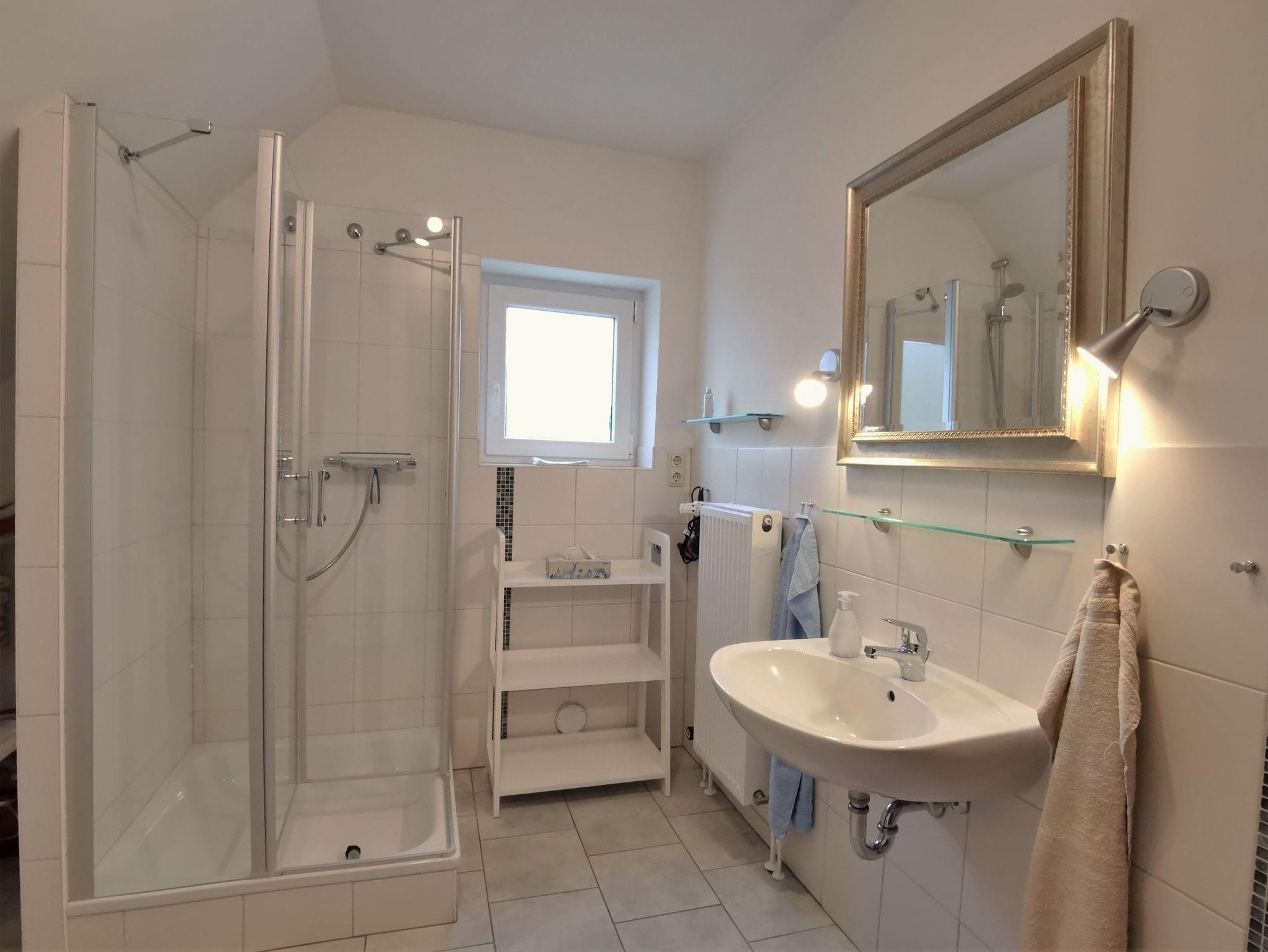 Das geräumige Badezimmer mit Dusche und Waschbecken ausgestattet, die Toilette ist getrennt davon in einem kleinen Bad mit Fenster.