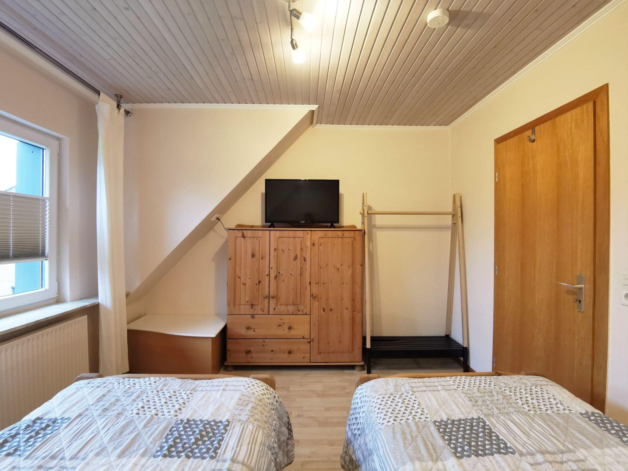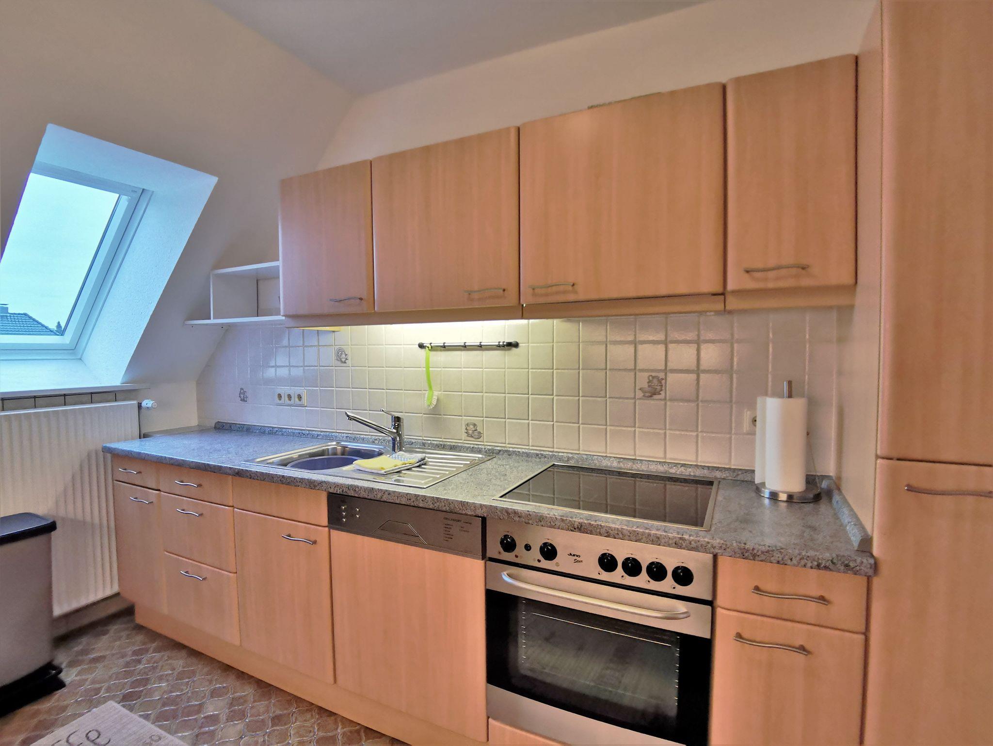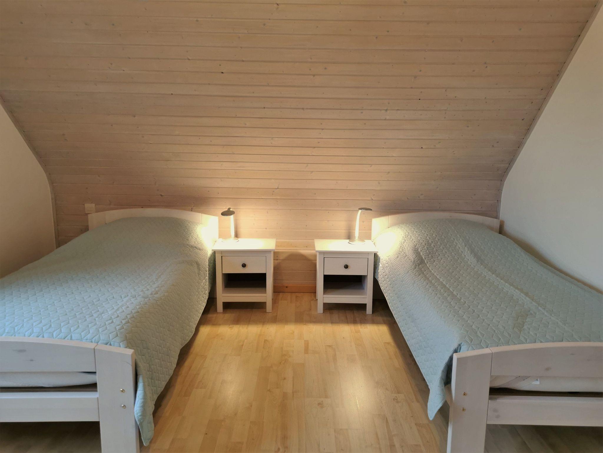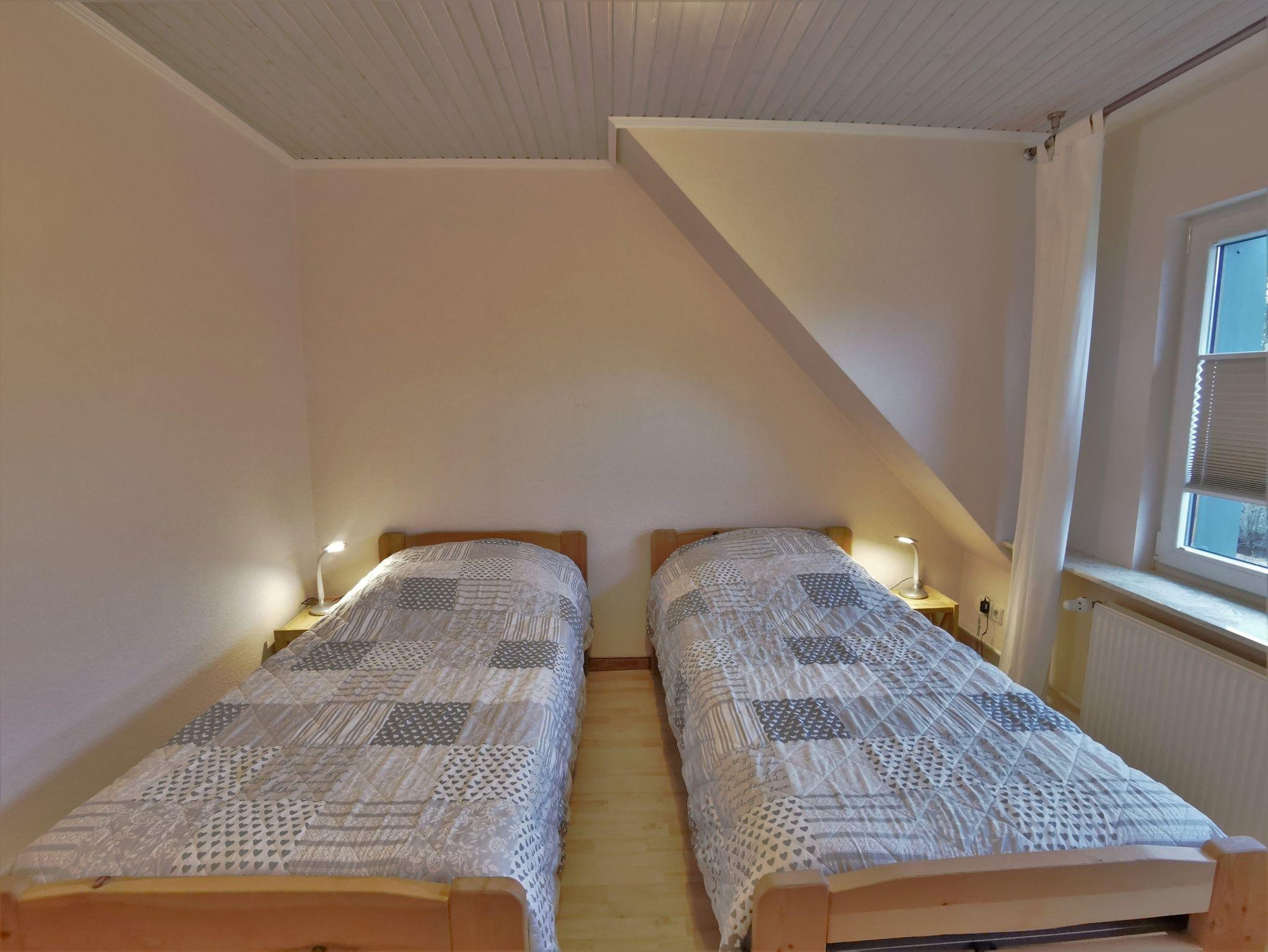 Die größere Ferienwohnung für 4 Personen (plus Aufbettungsmöglichkeit) liegt im Obergeschoss eines anderen Einfamilienhauses (ca. 30m entfernt) und ist etwa 80 qm groß. Sie verfügt über einen separaten Eingang, ein großes helles Wohnzimmer mit Essbereich und kleinem Balkon, einer voll ausgestatteten Küche sowie zwei Schlafzimmer mit zwei Einzelbetten. Das Schlafsofa im Wohnzimmer kann für eine weitere Person aufgebettet werden. Ein großes Duschbad mit Waschbecken und das WC sind getrennt voneinander. Es steht den Gästen kein Außenbereich zur Verfügung.