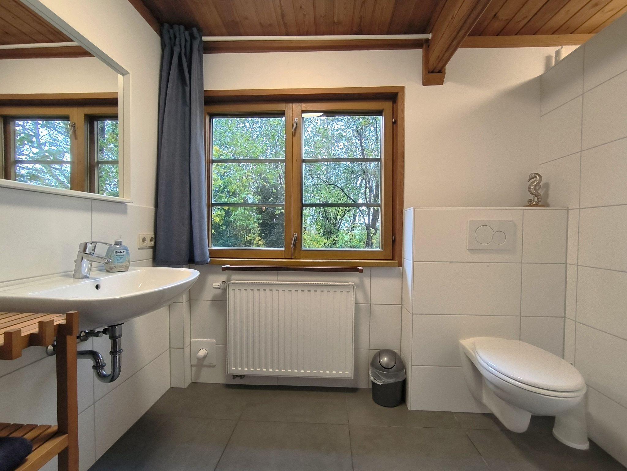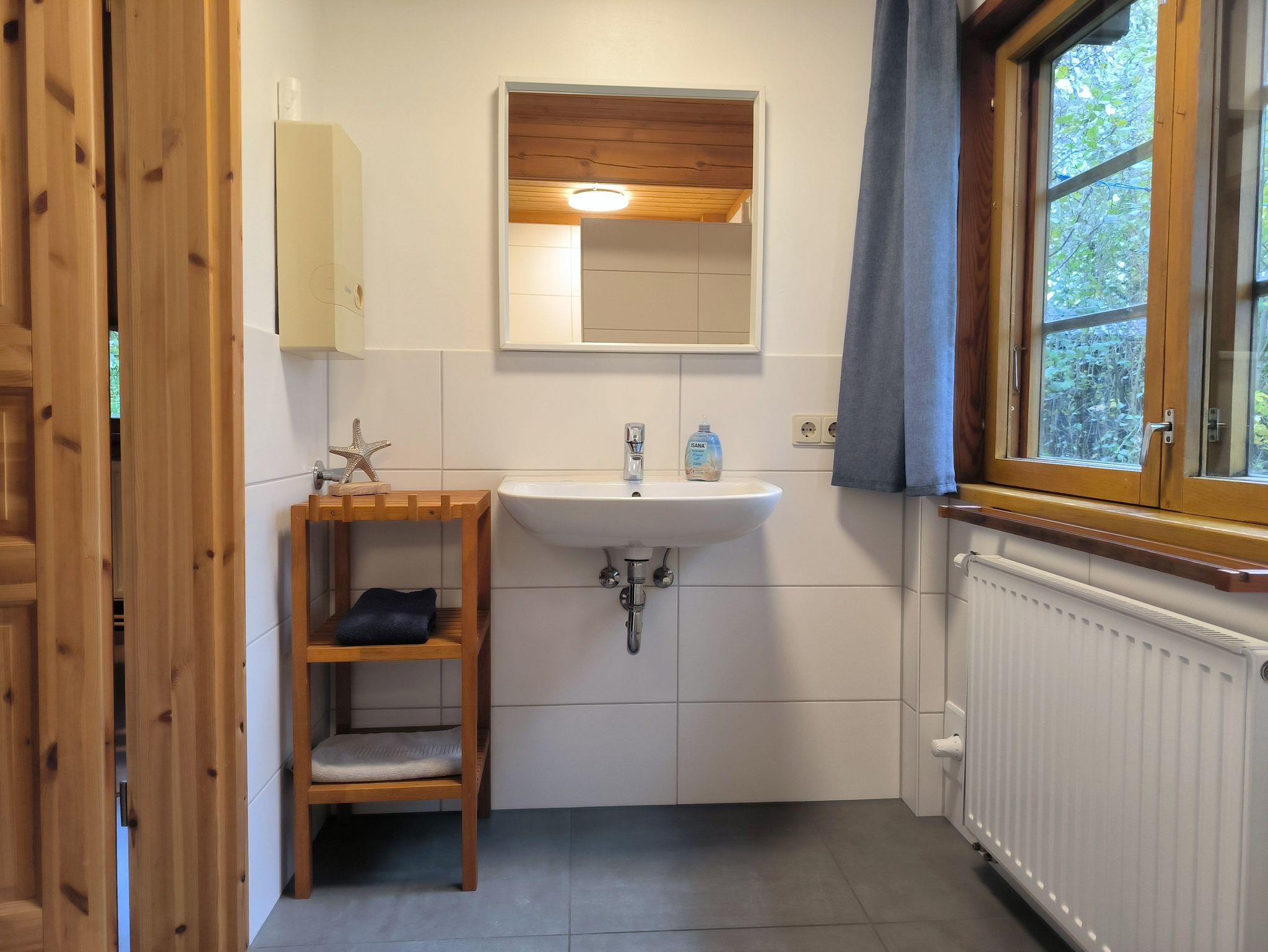Im Erdgeschoss der Wohnung liegt das große Wohn- und Esszimmer mit gemütlicher Couch, Esstisch, Küchenzeile und dem Duschbad. Über eine recht steile Treppe (oben bietet ein Treppengitter Schutz) geht es auf die Empore, die als ein Schlafraum genutzt wird: hier gibt es neben zwei Betten auch Stauraum für Kleider und Gepäck und von diesem Raum gehen zwei Schlafzimmern mit je zwei Schlafplätzen ab: von beiden Zimmern hat man Zugang zu dem geschützten Balkon mit Blick auf den Hof und in die Natur. Die Küchenzeile ist klein, aber fein - sie ist vollständig ausgestattet mit Kühlschrank, Backofen, Kaffeemaschine und Co., nur gespült werden muss von Hand. Das Bad liegt im Erdgeschoss und ist modern gestaltet: neben Waschtisch und Toilette gibt es eine ebenerdige Dusche.