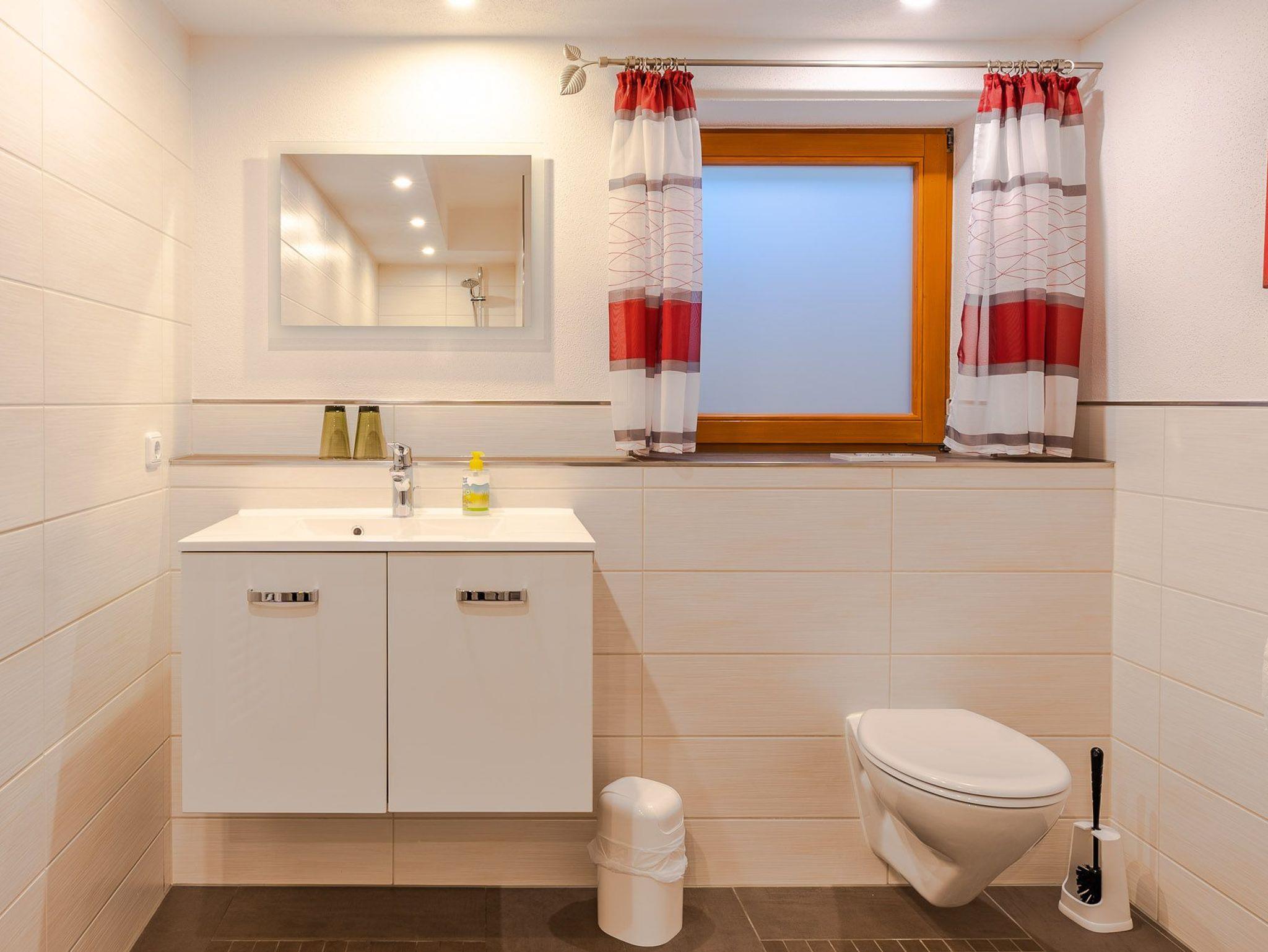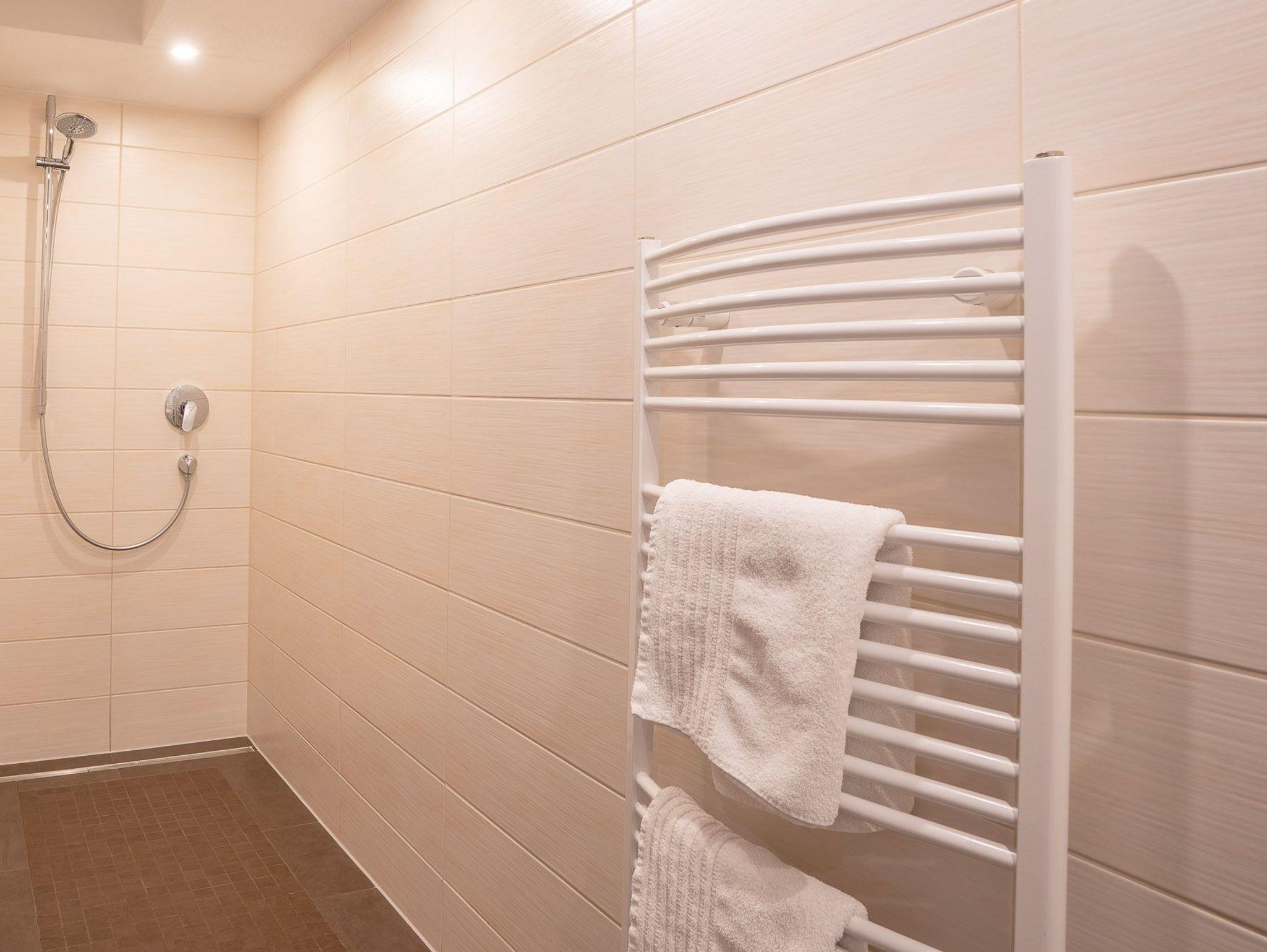 Im großen Tageslichtbad ist ein großer ebener Duschbereich, Handtuchheizkörper, WC, Waschtisch und Haarföhn vorhanden.