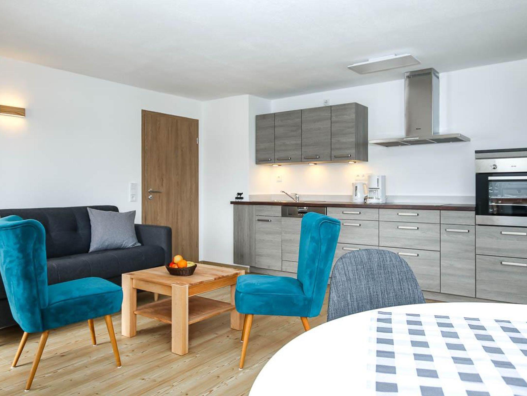 Das gemütliche Wohnzimmer mit Wohlfühlcouch (hier kann auch noch jemand schlafen) und einem Erker mit großem Esstisch bietet viel Platz und eine helle Atmosphäre. Hier befindet sich auch die voll ausgestattete Küchenzeile die keine Wünsche offen lässt.