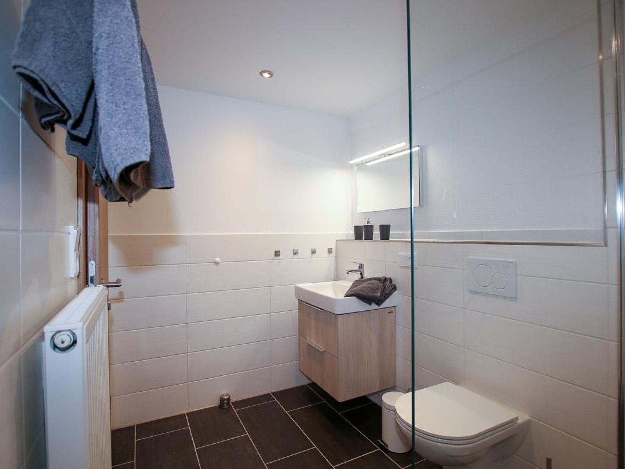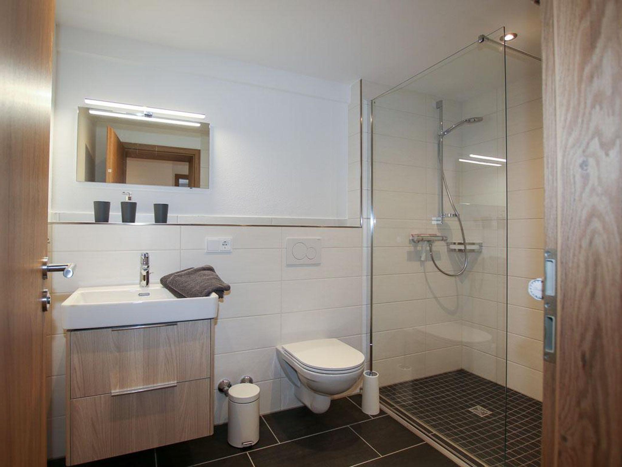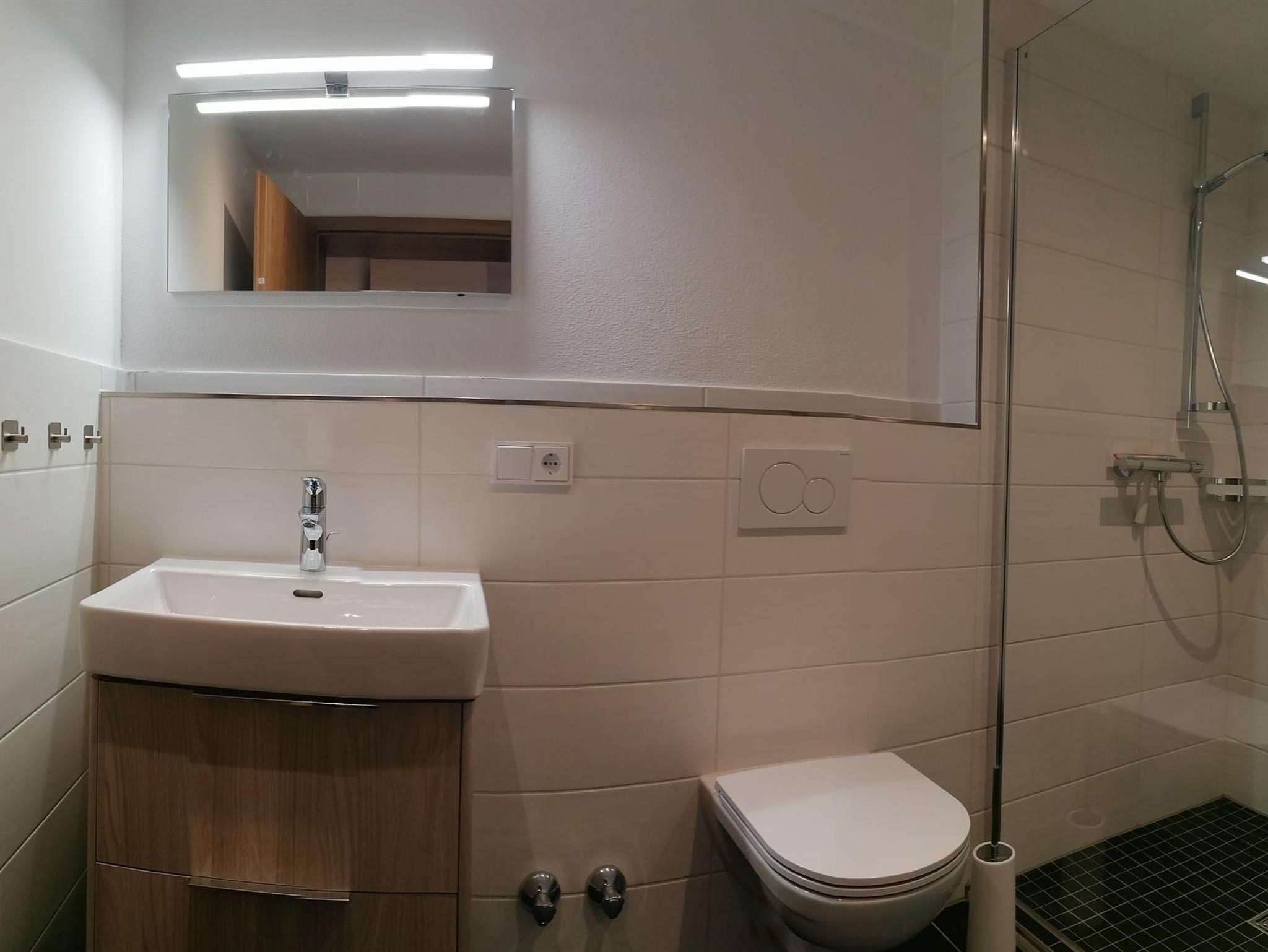 Das große Badezimmer besticht mit seinen hellen Farben und mit einer großenmit begehbarer Dusche.
