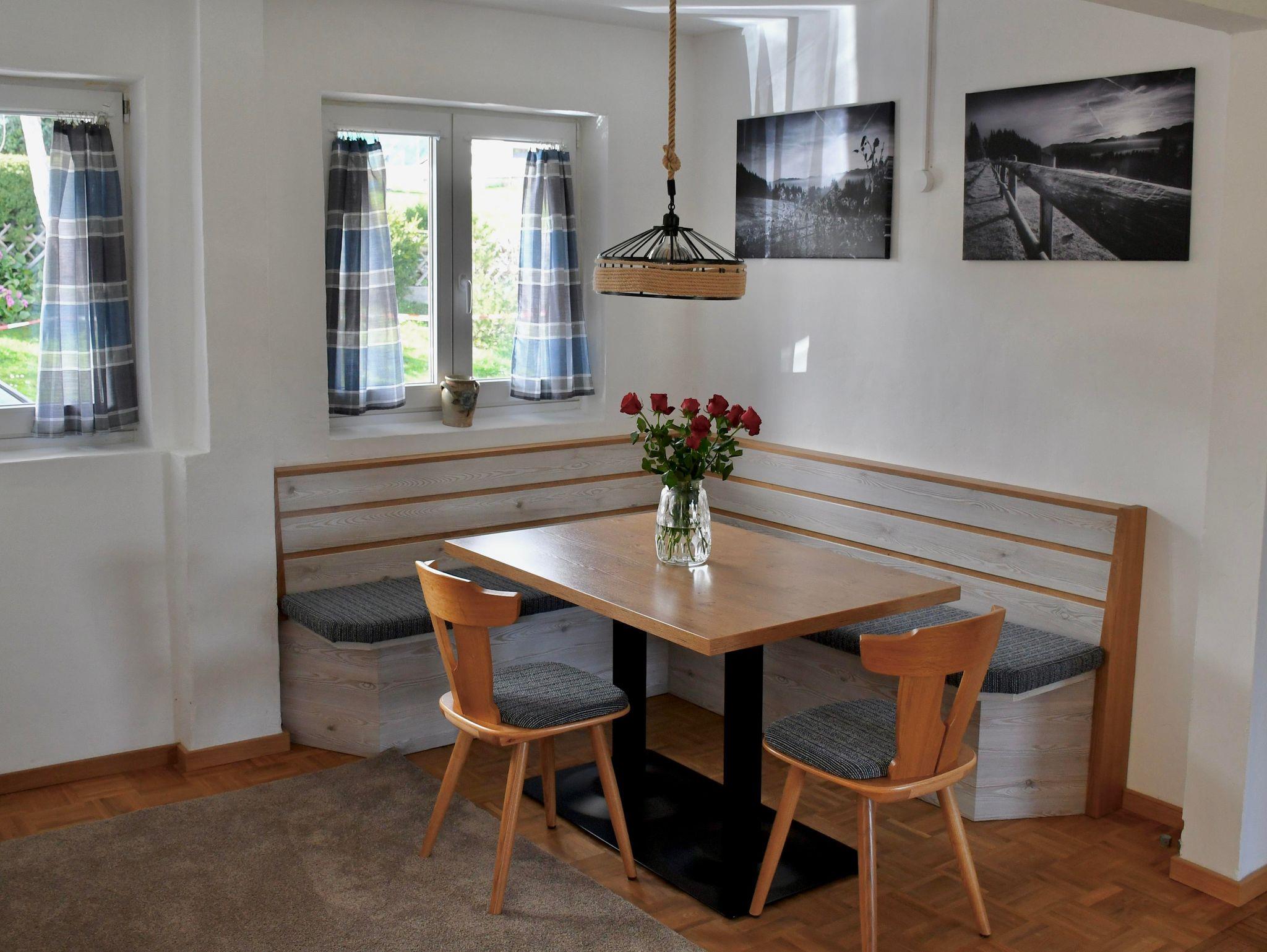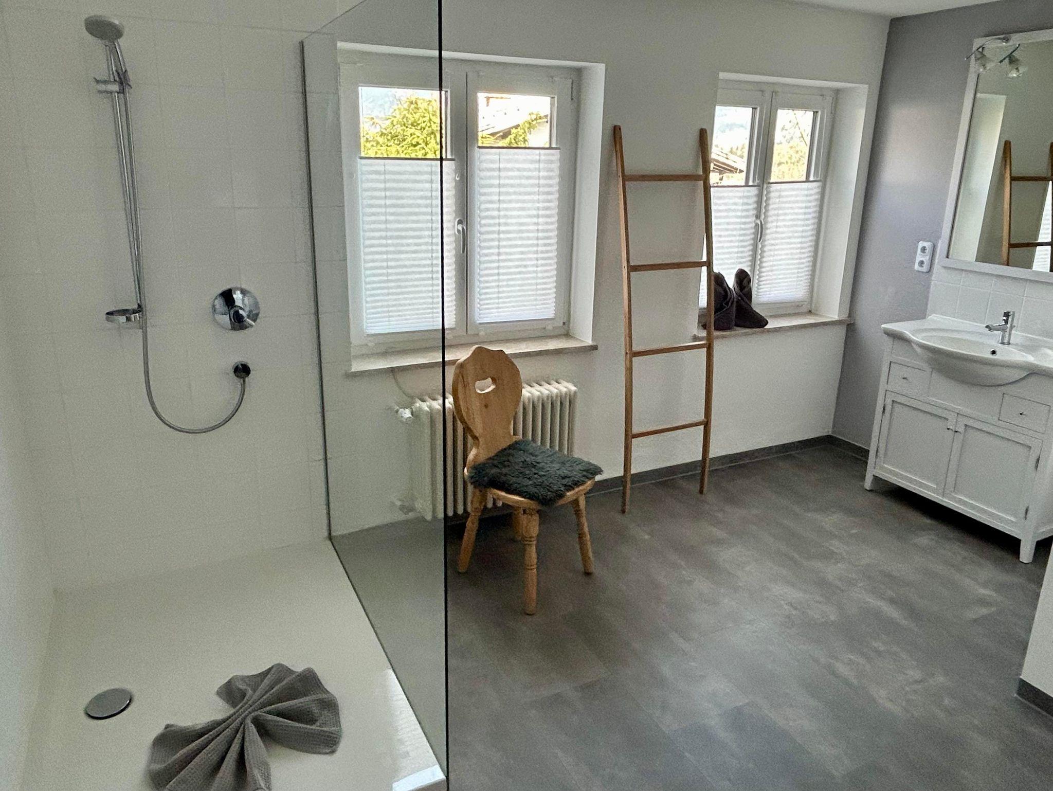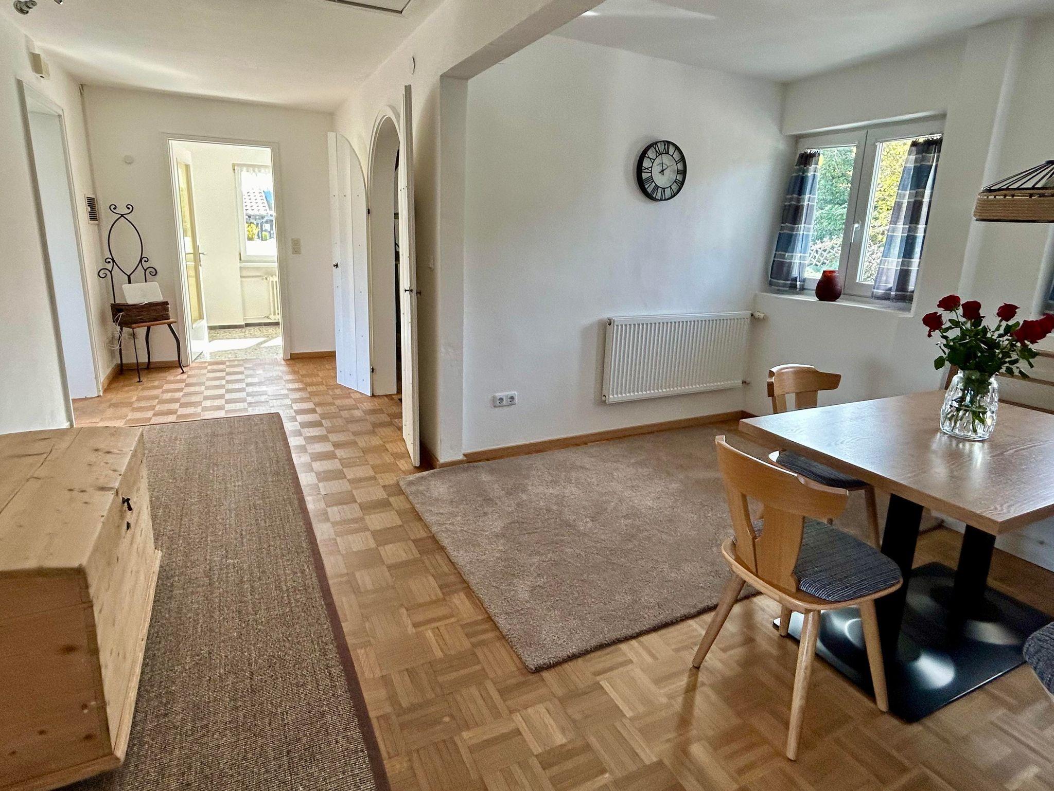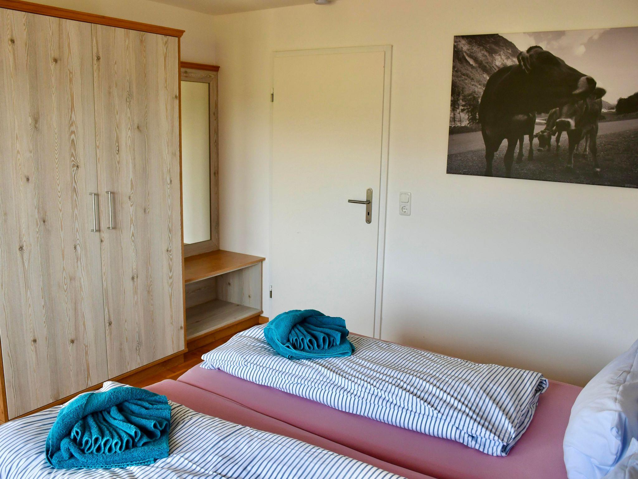 Die obere Wohnung ist ca 120qm groß und hat zwei getrennte Schlafzimmer für 2-4 Personen. Das Wohnzimmer verfügt über einen Kachelofen und ein großes Panoramafenster mit freiem Blick auf das Tal und die umliegenden Berge.