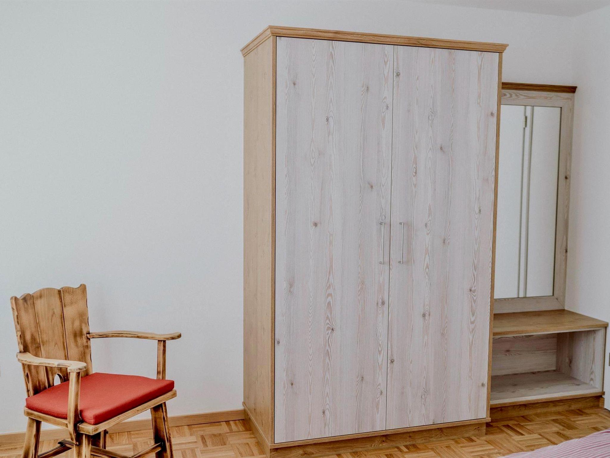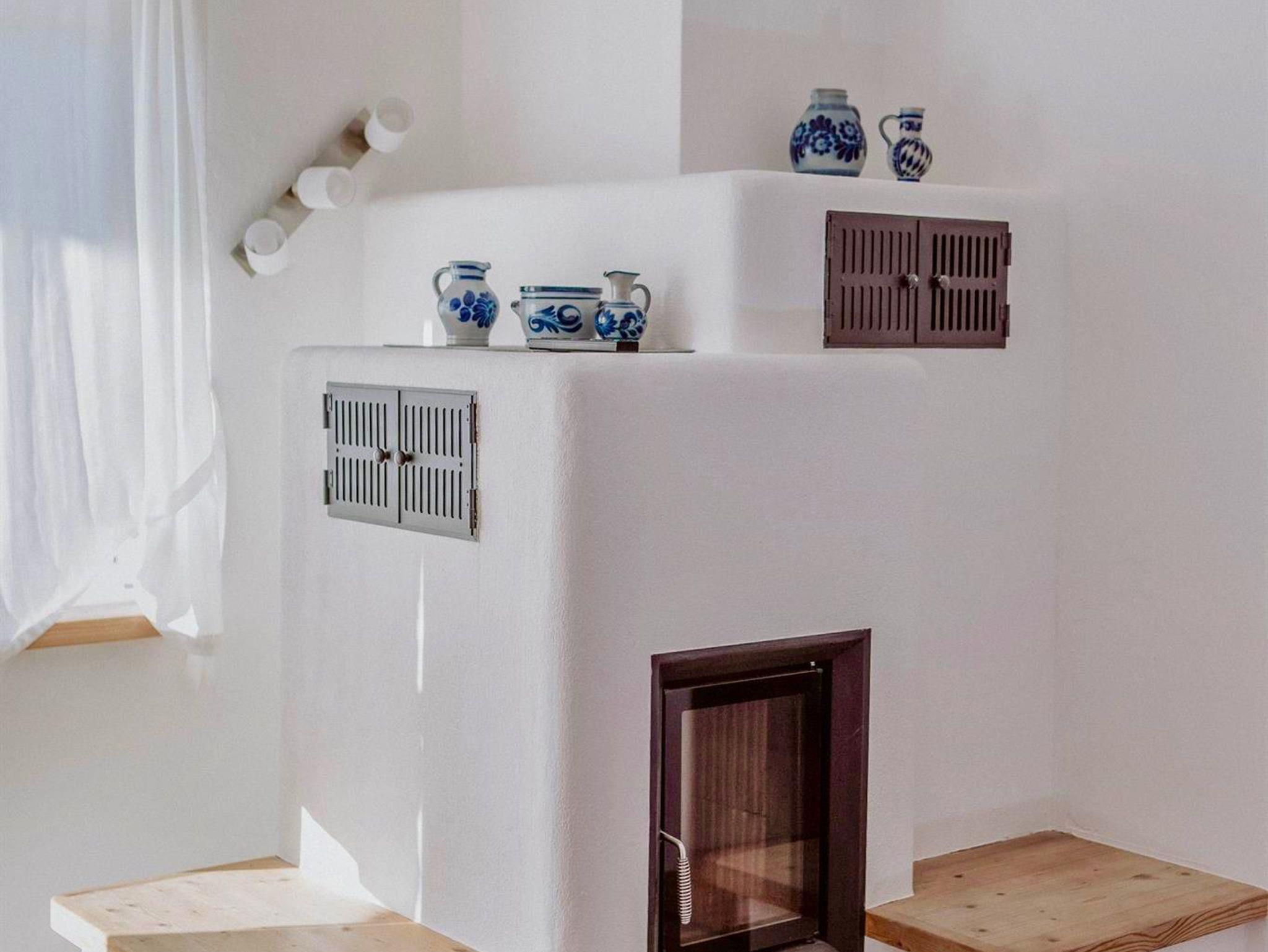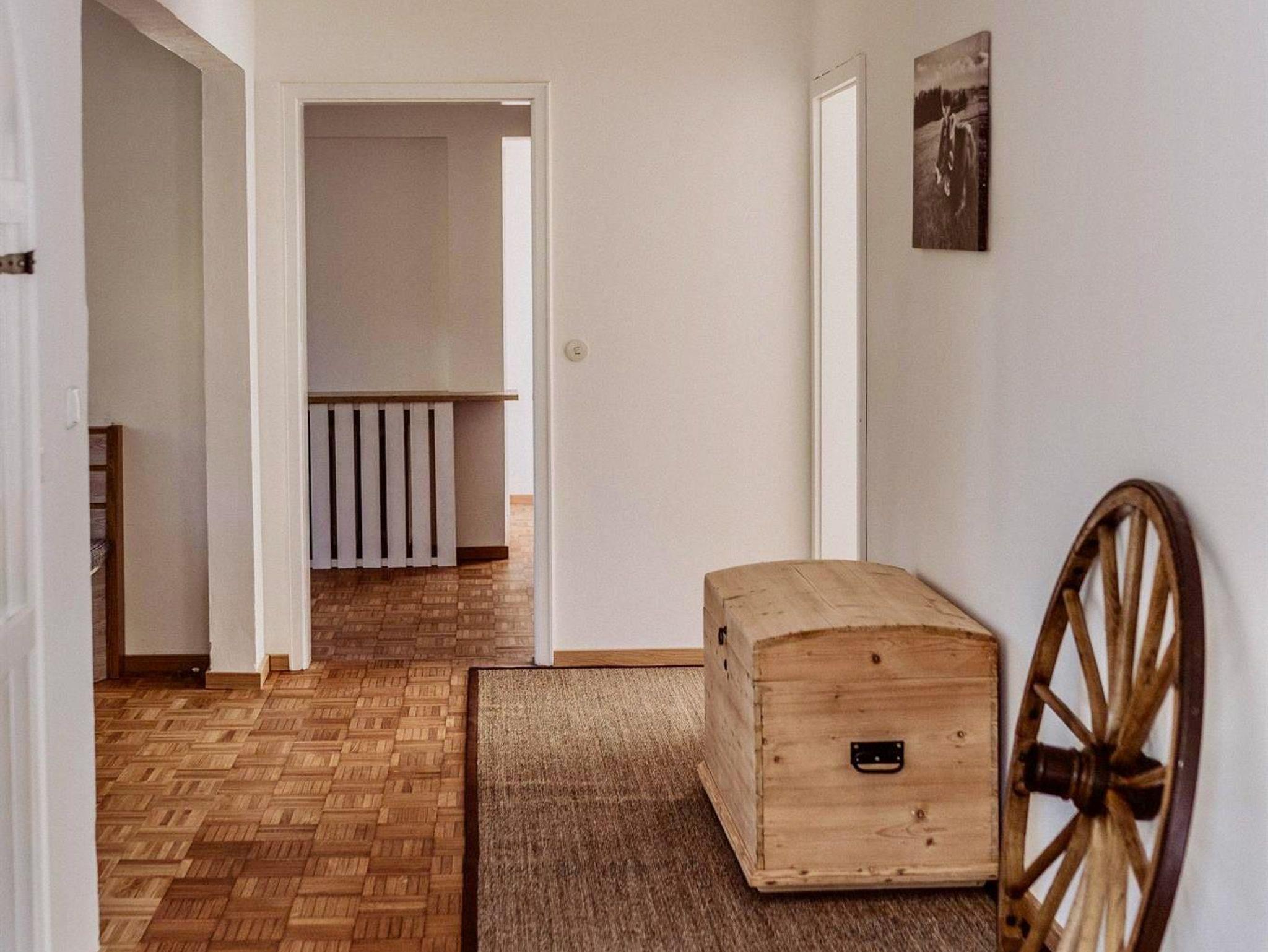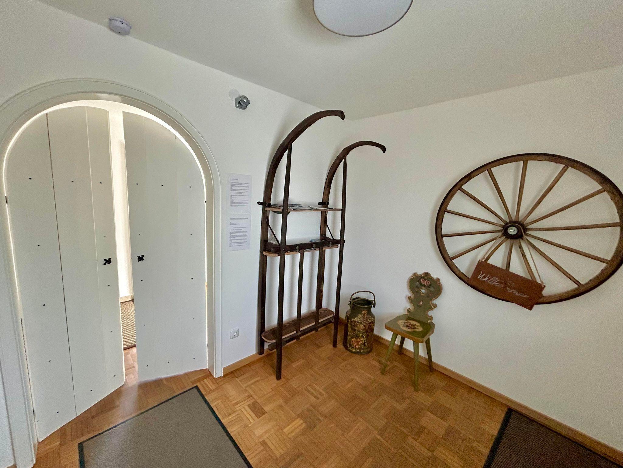 Die obere Wohnung ist ca 120qm groß und hat zwei getrennte Schlafzimmer für 2-4 Personen. Das Wohnzimmer verfügt über einen Kachelofen und ein großes Panoramafenster mit freiem Blick auf das Tal und die umliegenden Berge.