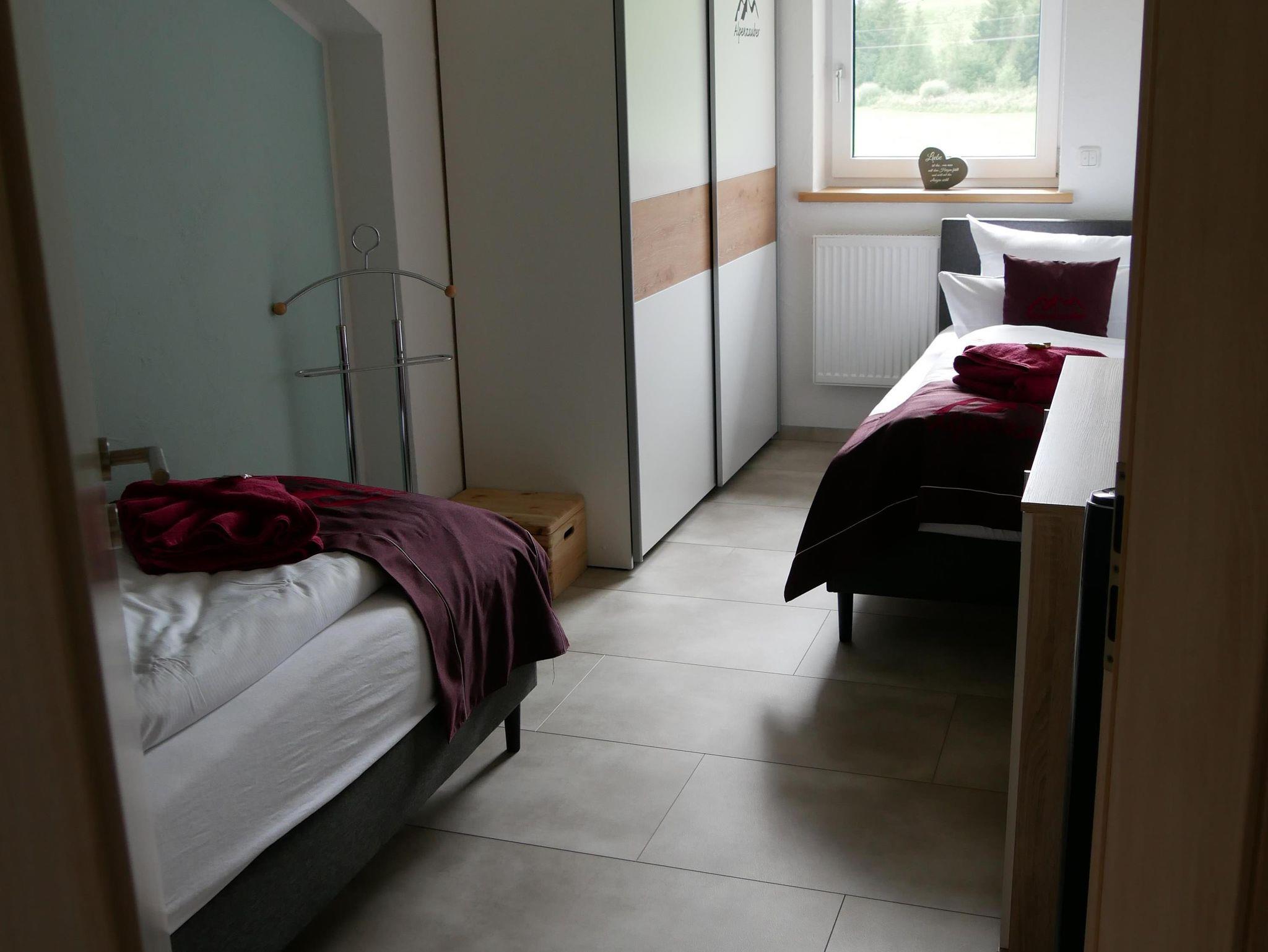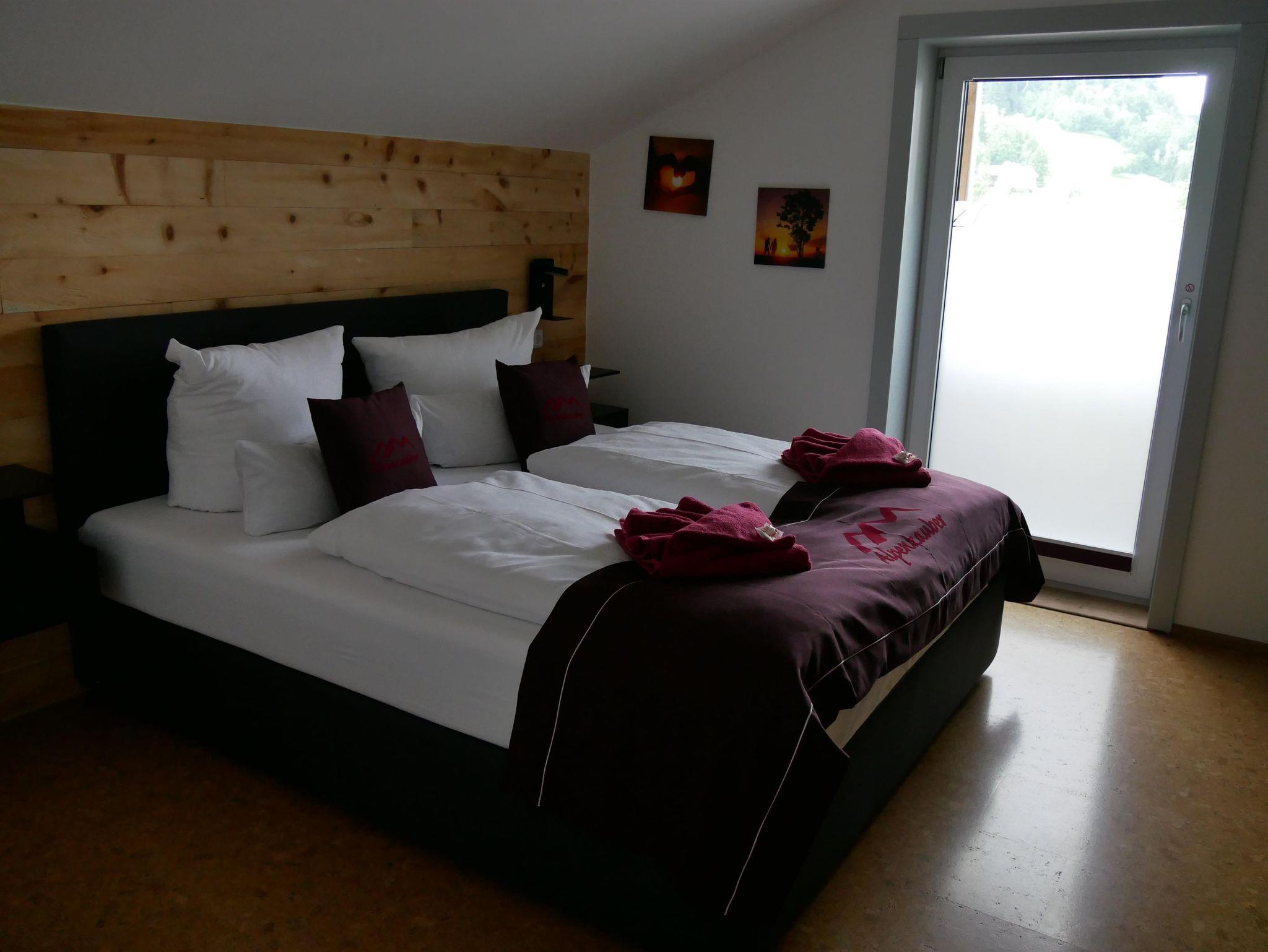 • zwei Schlafzimmer mit Boxspringbetten und Zirbenholzwänden