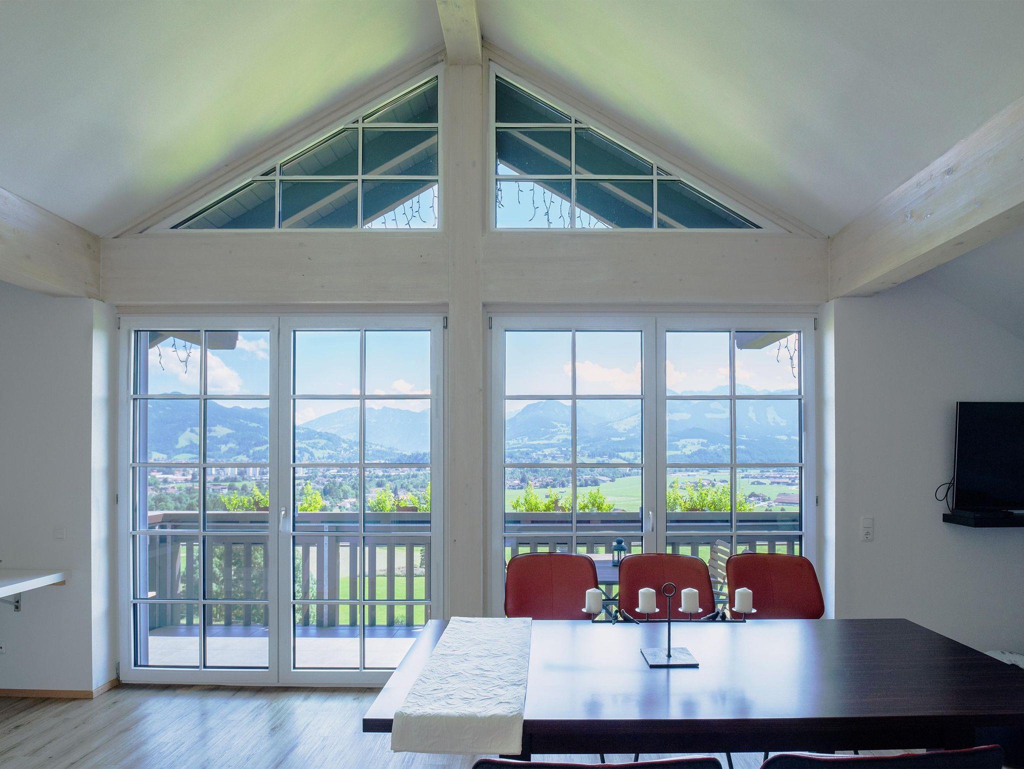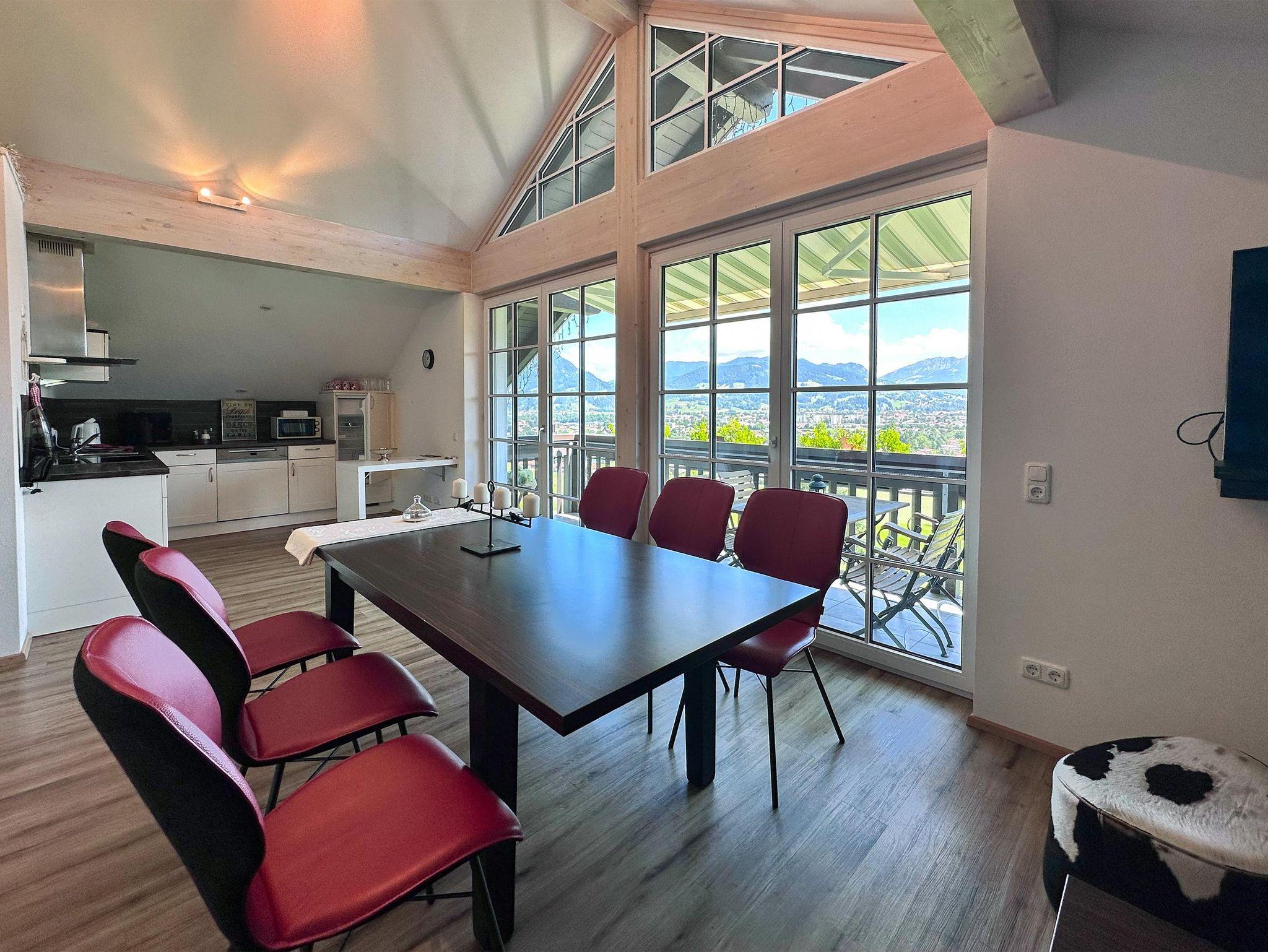 Die Dachgeschoßwohnung im Alpenlodge Allgäu heißt AlpenTraum und ist mit 120 qm die größte Wohnung, gehalten in dunkelbraun mit einem roten Sofa ist der Wohn/Essbereich ein Hingucker. Hier sagen sich Hirsch und Steinbock gute Nacht. Eine Studioverglasung gibt ein Panorama frei das einem den Atem stocken lässt und man möchte nie wieder weg. Die Besonderheit sind 3 Schlafzimmer.