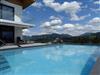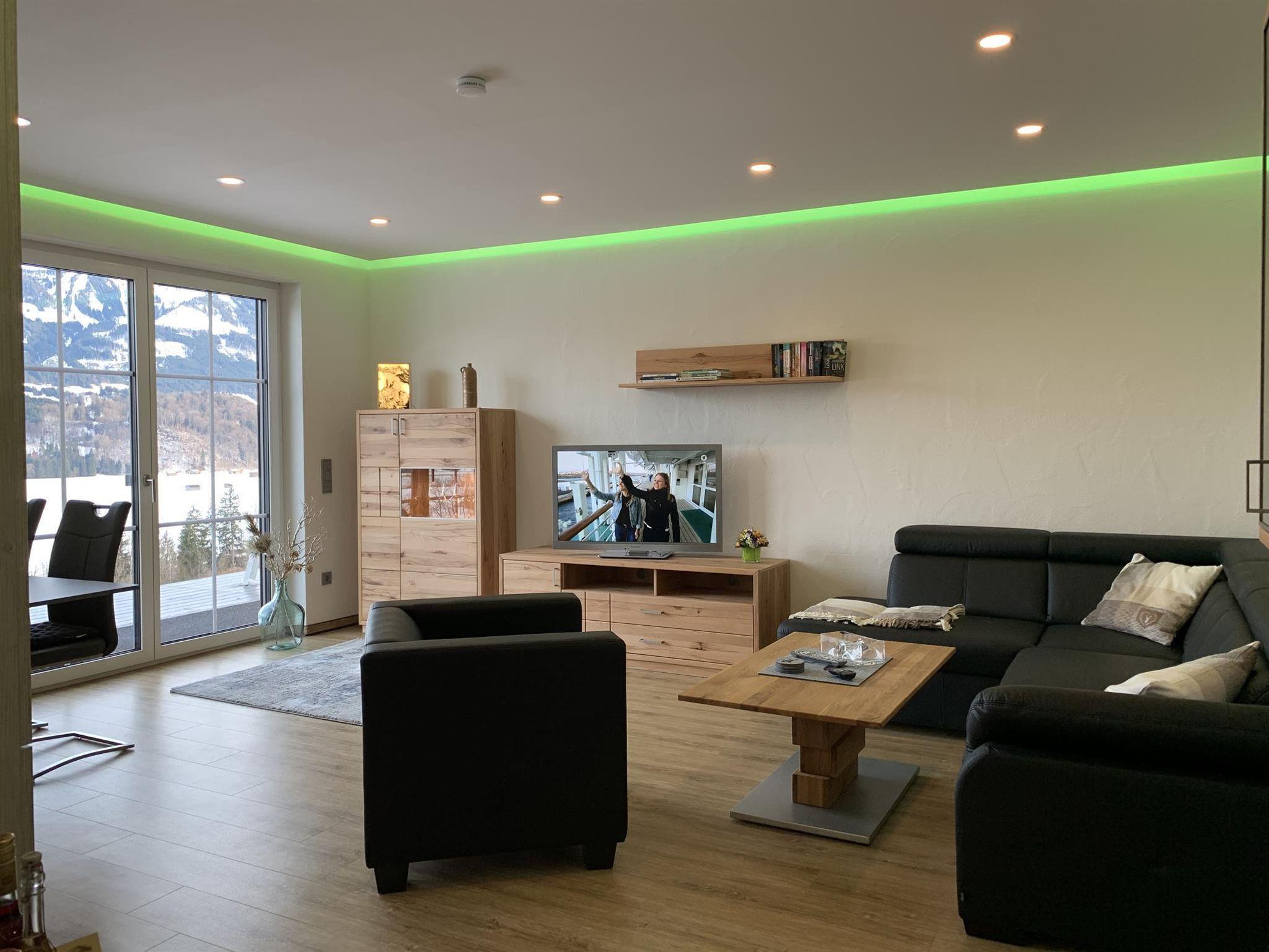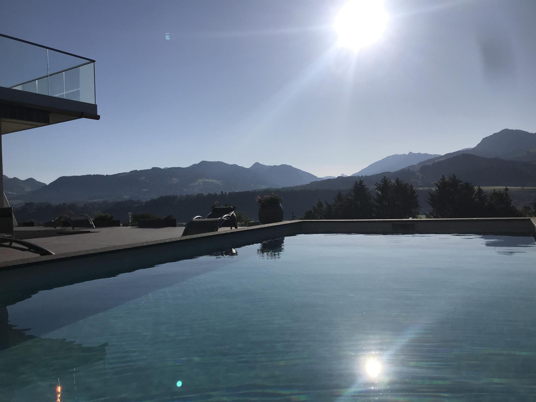 Vom geräumigen Flur mit Garderobe gelangen Sie in das lichtdurchflutete Wohnzimmer mit geschickt integrierter Küchenzeile und Essbereich. Wohn- und Schlafzimmer sind nach Osten ausgerichtet und bieten einen unverbauten und atemberaubenden Blick auf den Hauptalpenkamm. Vom Wohnzimmer aus betreten Sie die große Süd-/Ostterrasse mit gemütlicher Panoramaschaukel und haben davon auch direkten Zutritt zum Pool und der Sauna.
