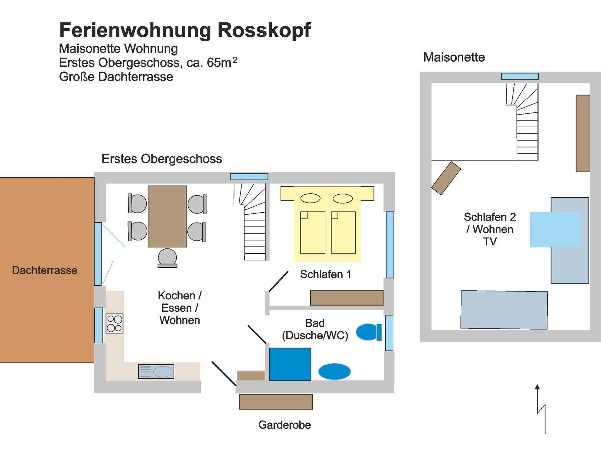 Die Ferienwohnung Rosskopf ist eine Maisonette Wohnung im 1. Stock mit Dachterrasse (15m²) Infrarotsauna mit einem offenen Wohn- / Ess- / und Küchenbereich, 1 Schlafzimmer mit Doppelbett und ein Bad mit Dusche.