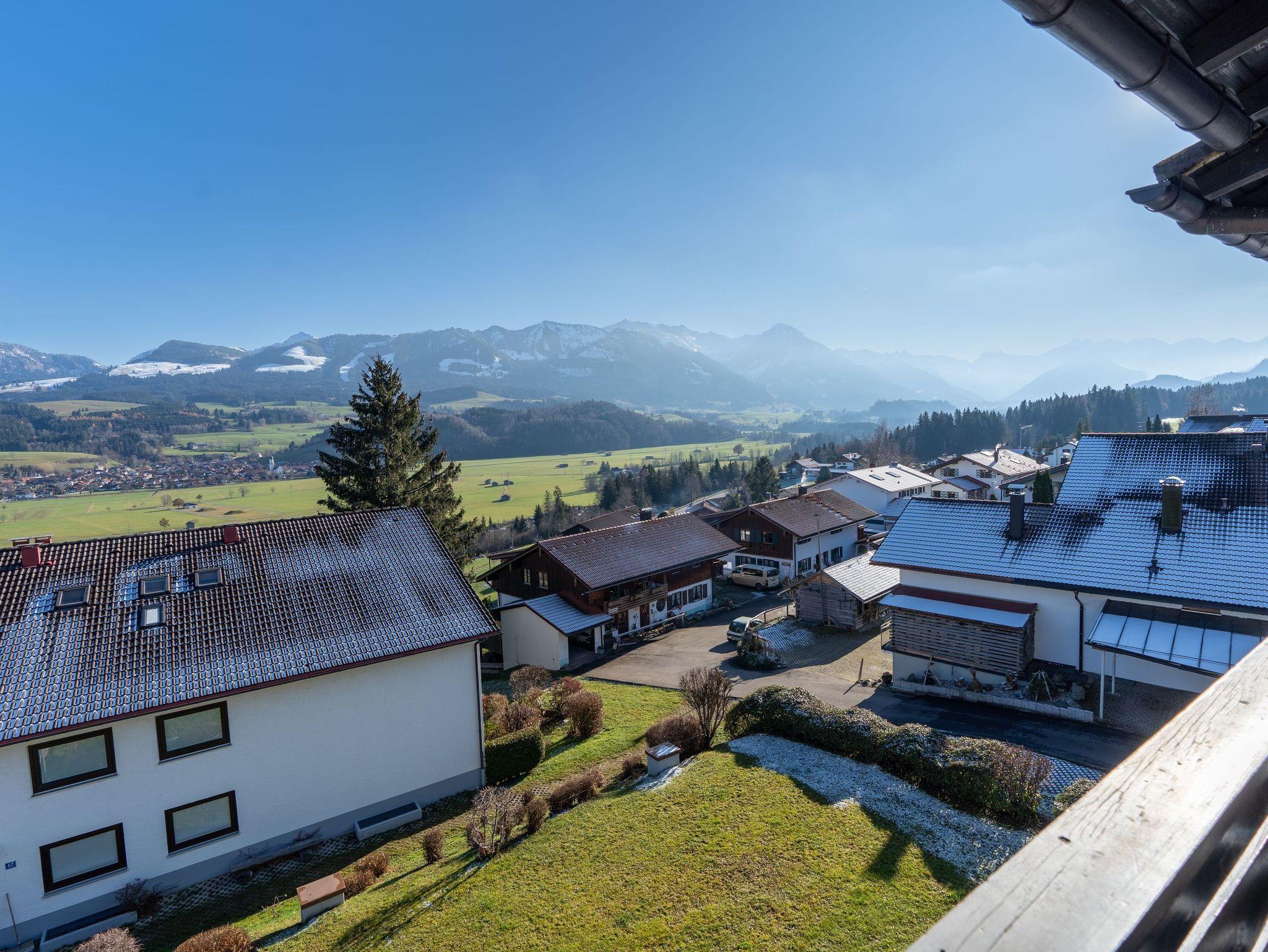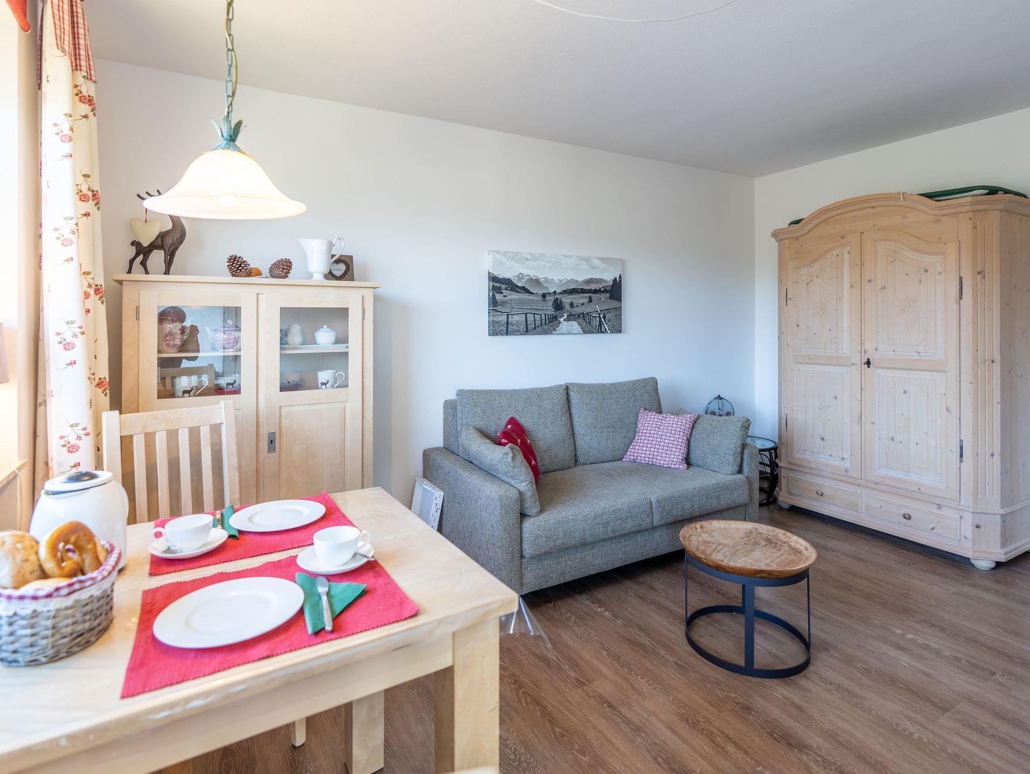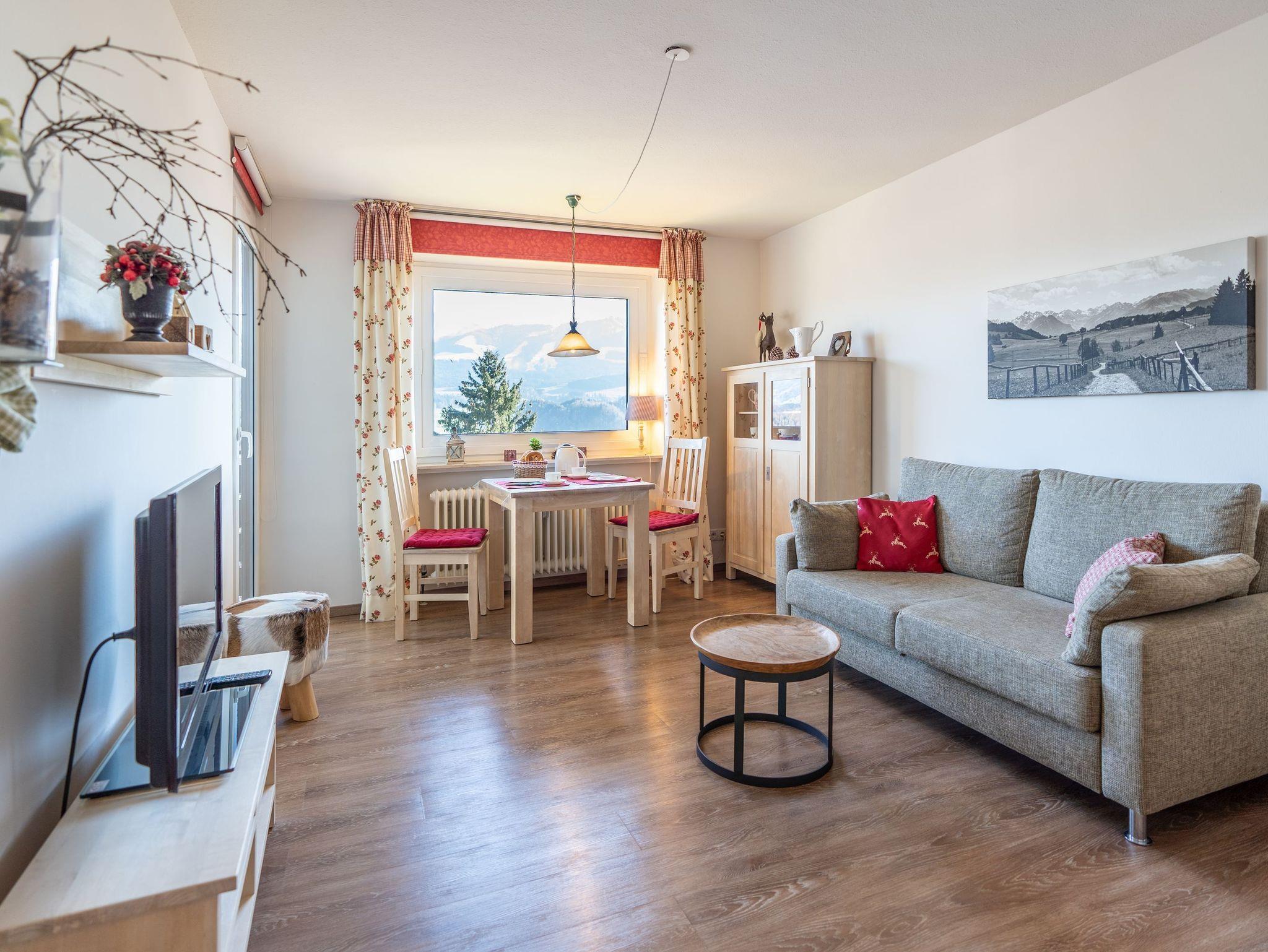 Diese liebevoll eingerichtete 2 Zimmerwohnung bietet Ihnen einen herrlichen Blick in die Allgäuer Berge und befindet sich im 2. OG eines Mehrfamilienhauses. Das Wohnzimmer ist mit einem gemütlichen Sofa, TV und einem Esstisch ausgestattet.