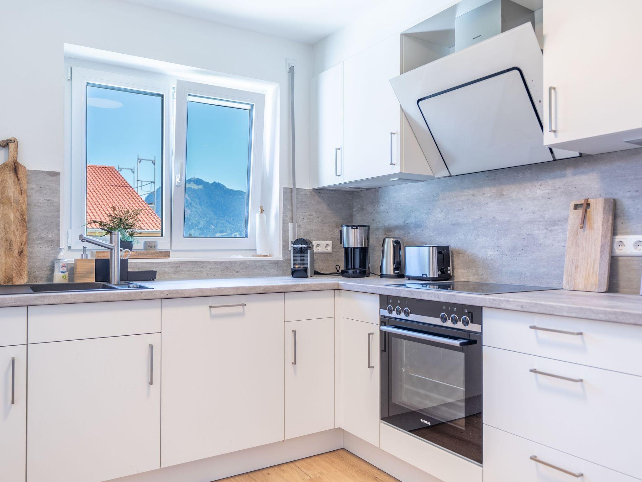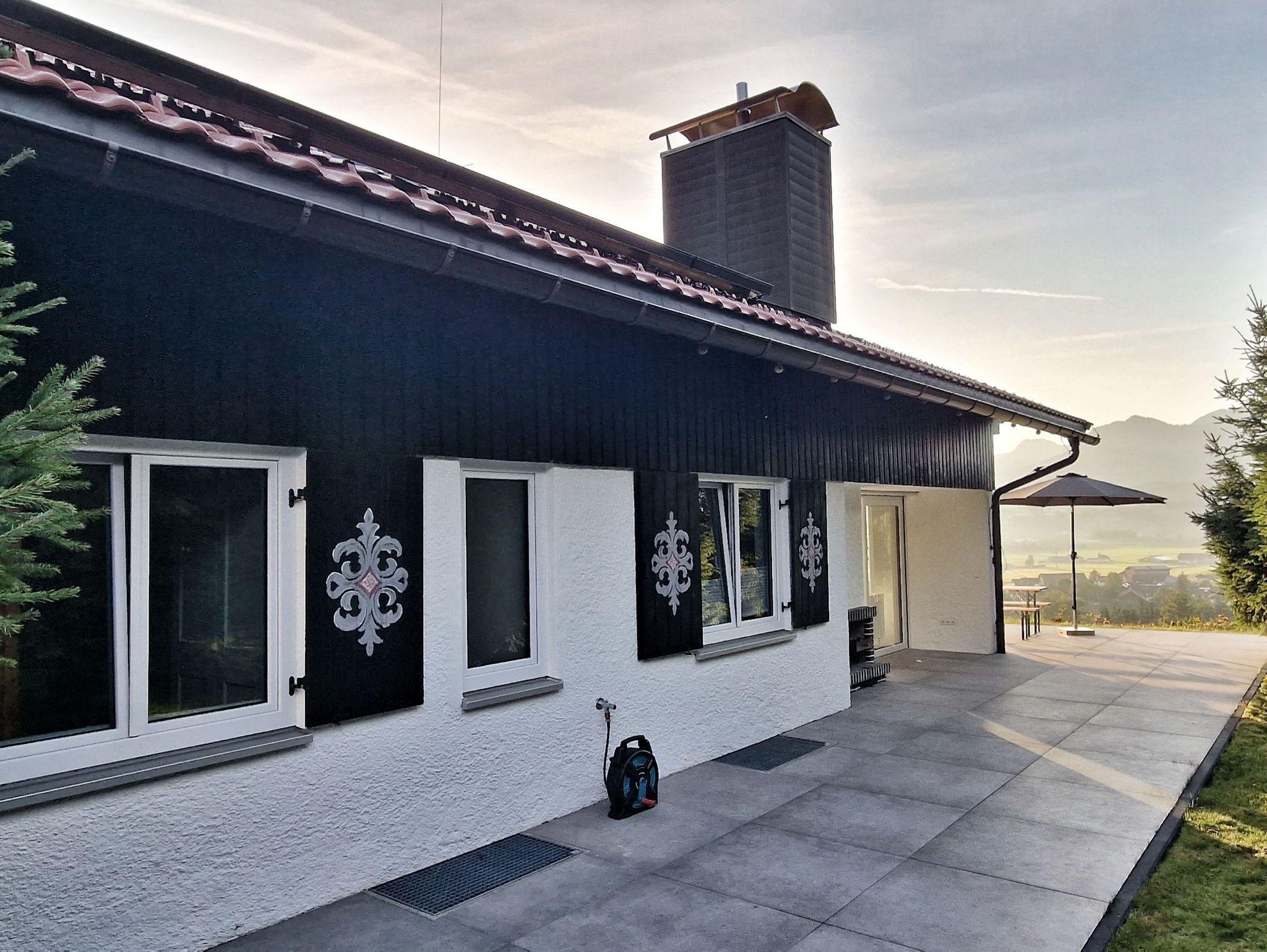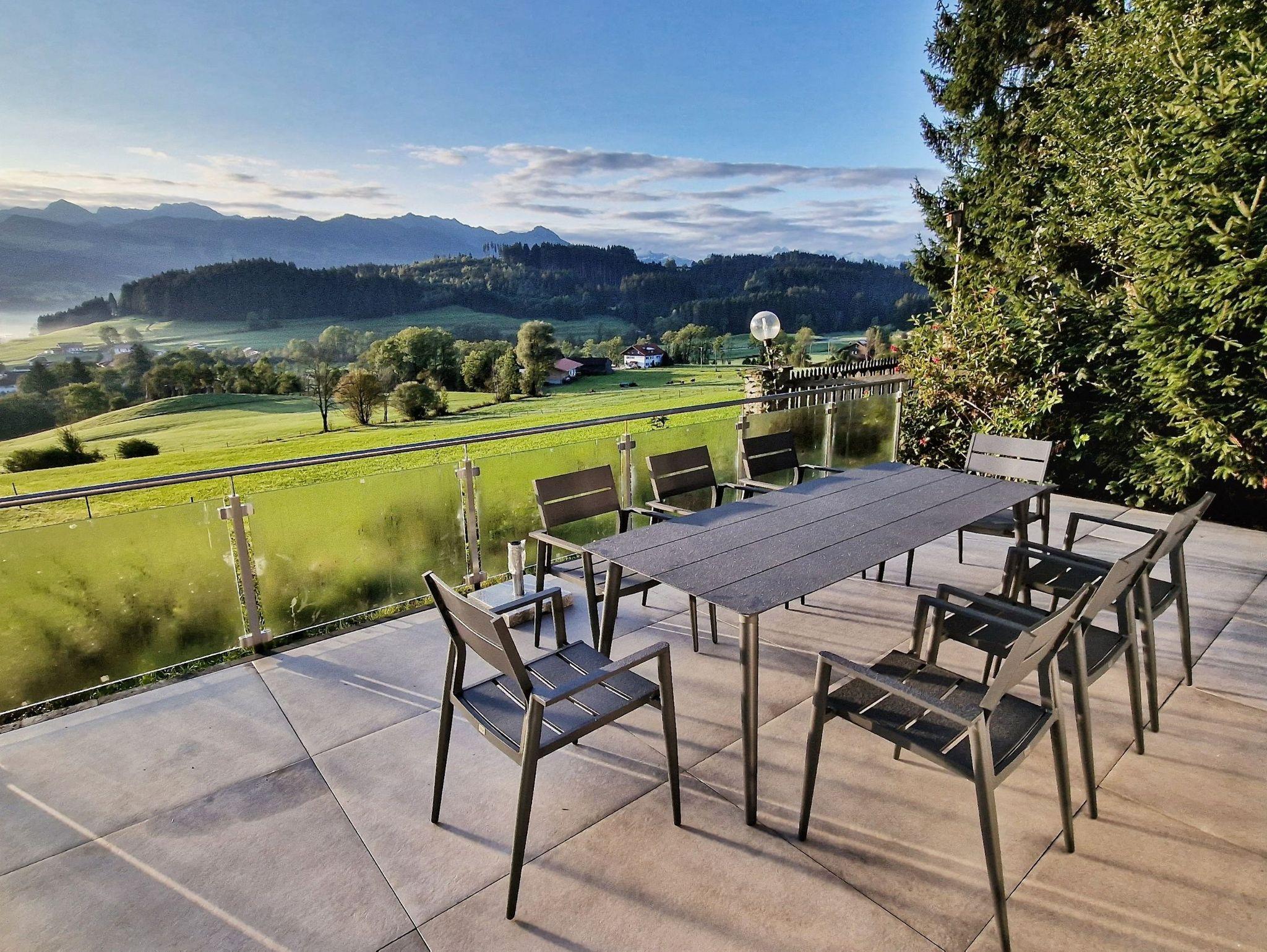 Ein absolutes Highlight ist die atemberaubende, rund 100 Quadratmeter große Terrasse. Hier eröffnet sich Ihnen ein traumhafter Blick auf die Allgäuer Berge. Genießen Sie Ihr Frühstück unter freiem Himmel, lassen Sie sich von der Sonne wärmen oder erleben Sie unvergessliche Sonnenuntergänge. Um die Ruhe und Harmonie in der Nachbarschaft zu respektieren, sind Junggesellenabschiede und ähnliche Gruppenfeiern untersagt.