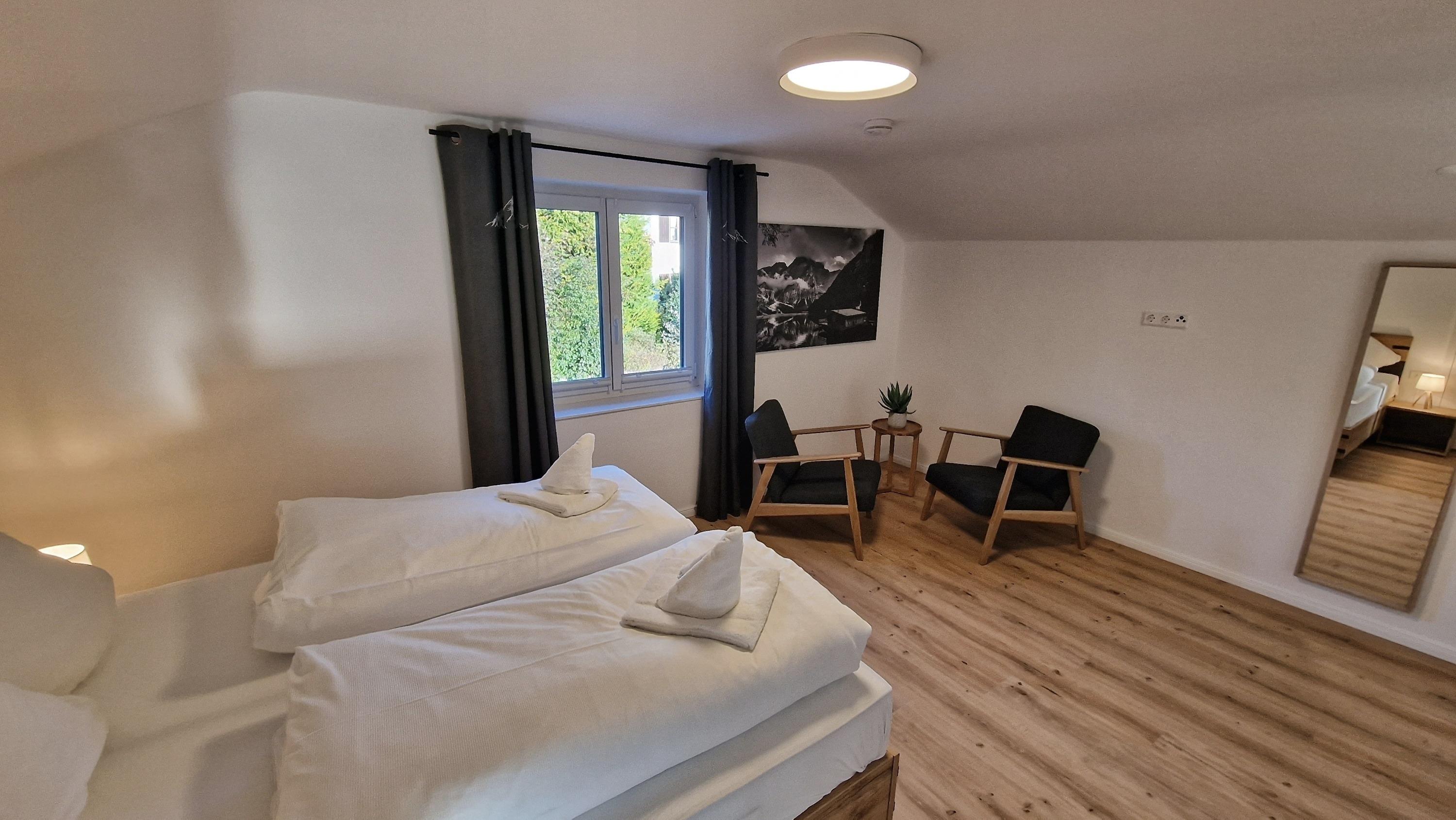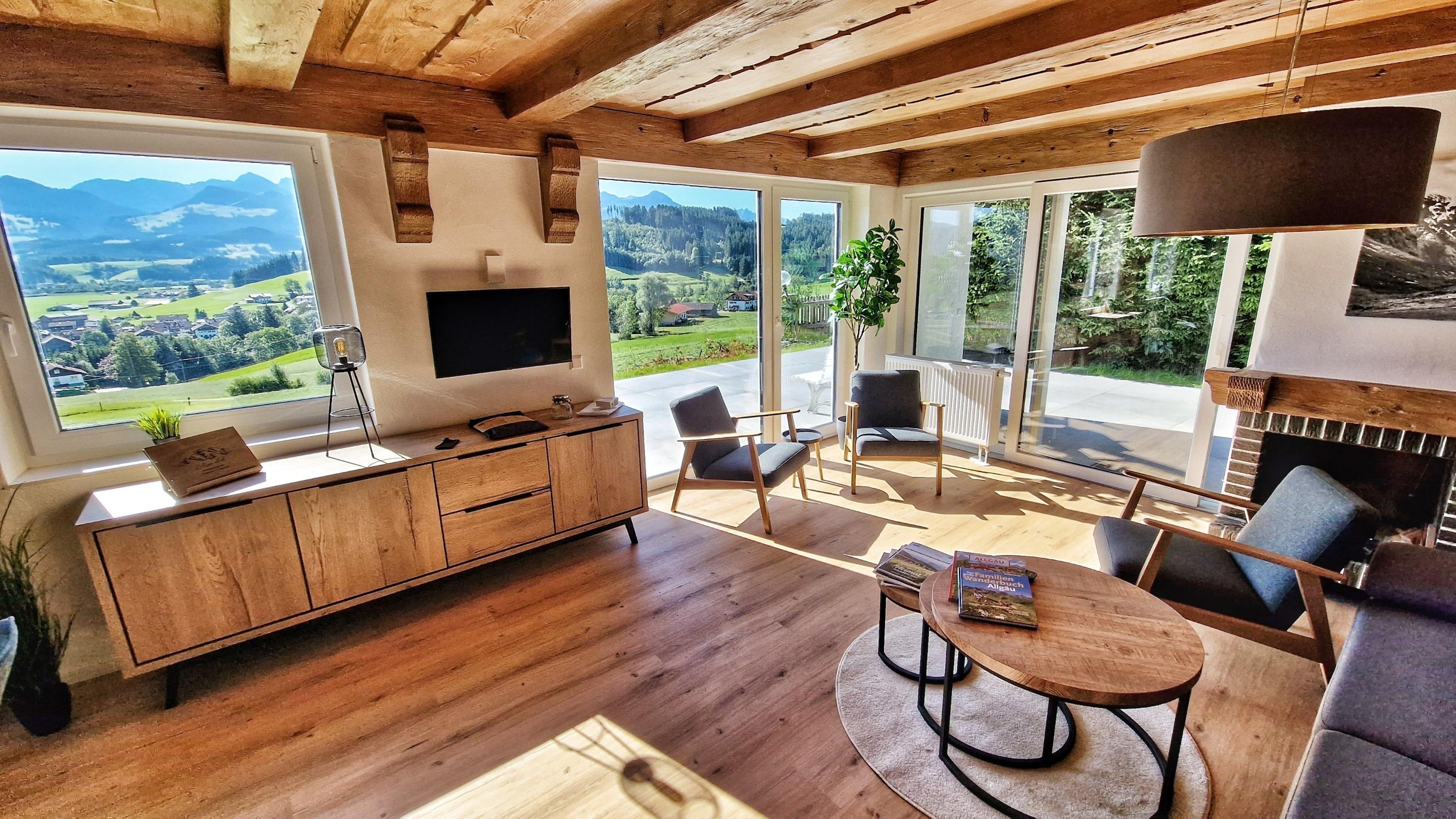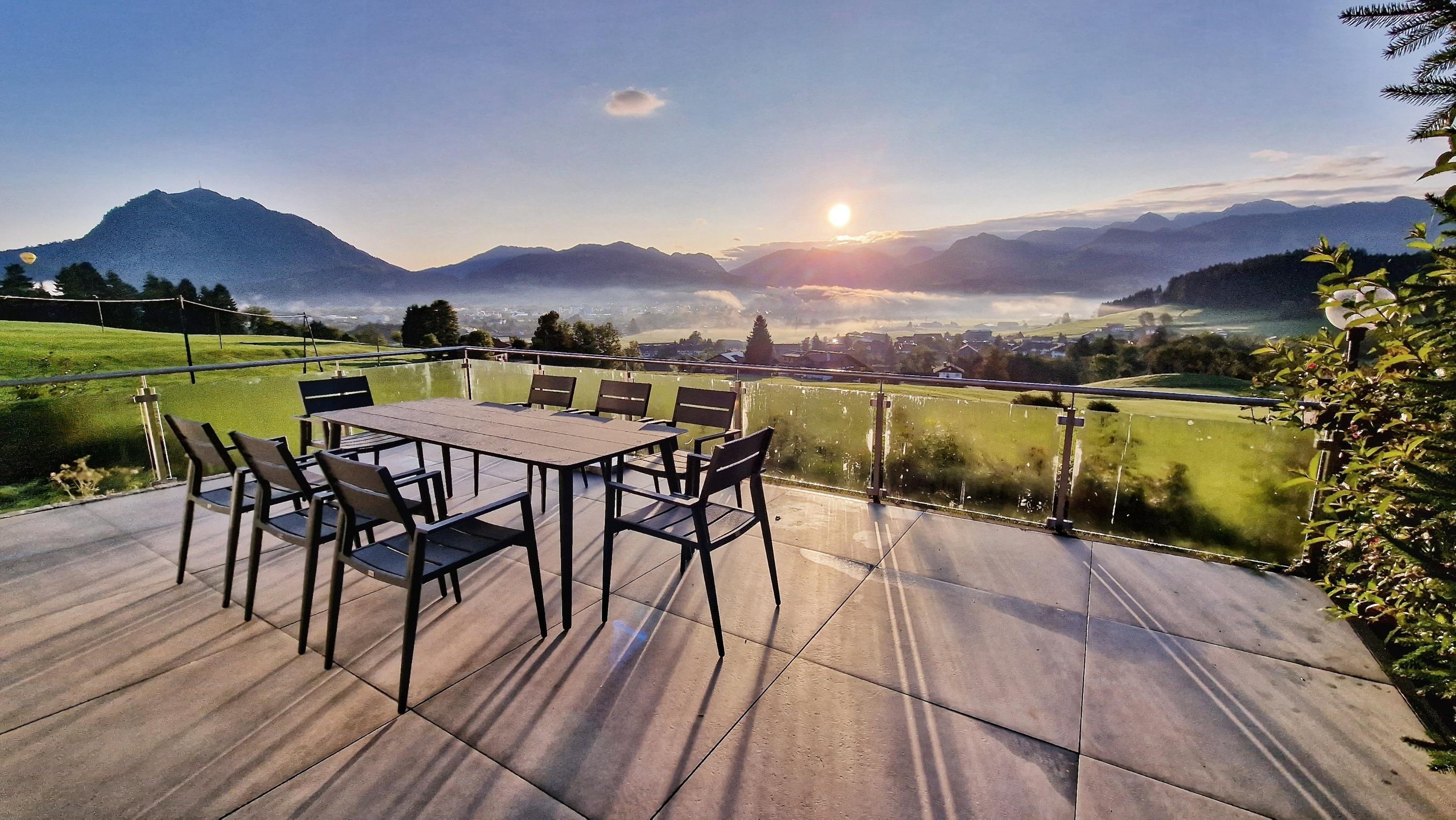 Ein absolutes Highlight ist die atemberaubende, rund 100 Quadratmeter große Terrasse. Hier eröffnet sich Ihnen ein traumhafter Blick auf die Allgäuer Berge. Genießen Sie Ihr Frühstück unter freiem Himmel, lassen Sie sich von der Sonne wärmen oder erleben Sie unvergessliche Sonnenuntergänge. Um die Ruhe und Harmonie in der Nachbarschaft zu respektieren, sind Junggesellenabschiede und ähnliche Gruppenfeiern untersagt.