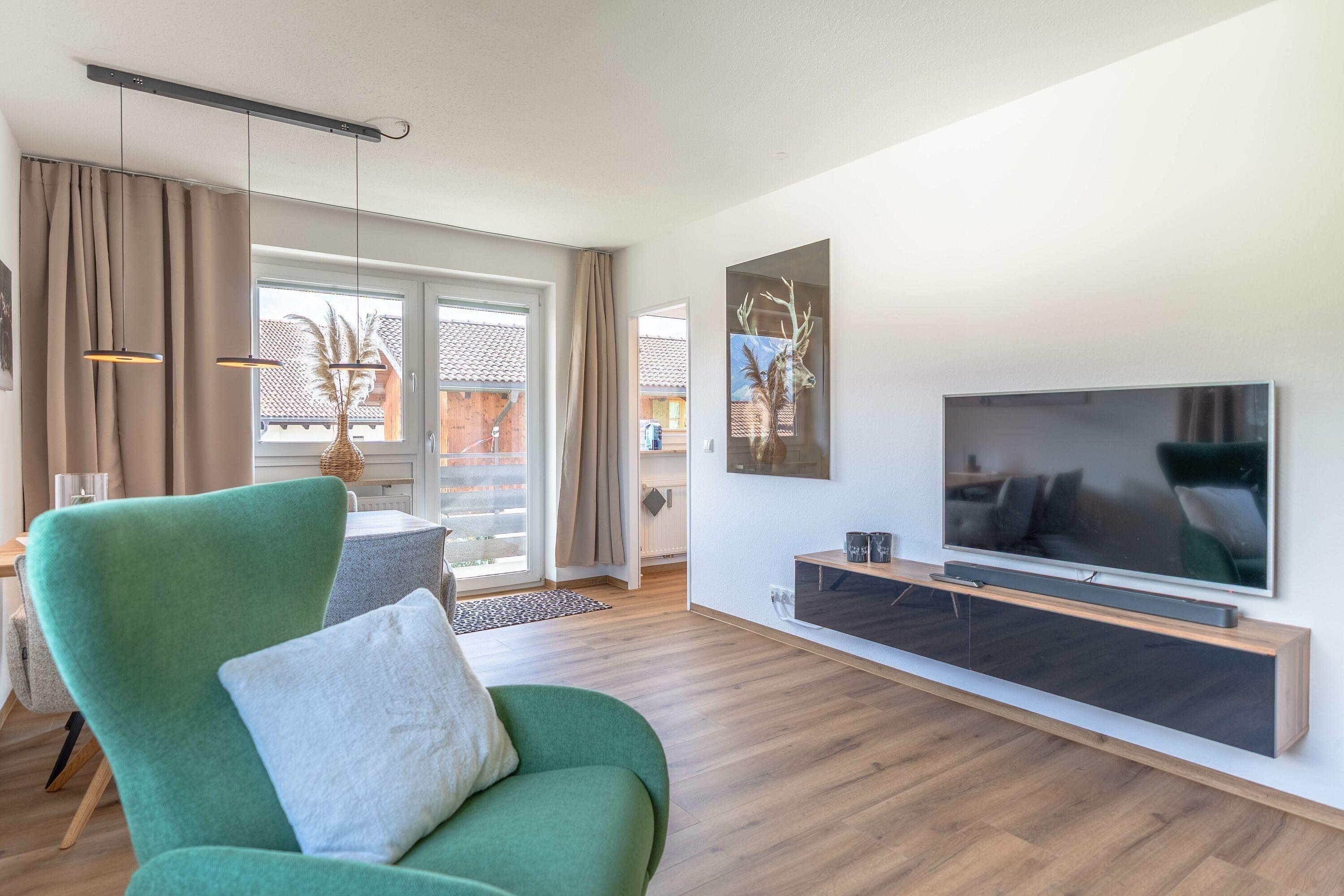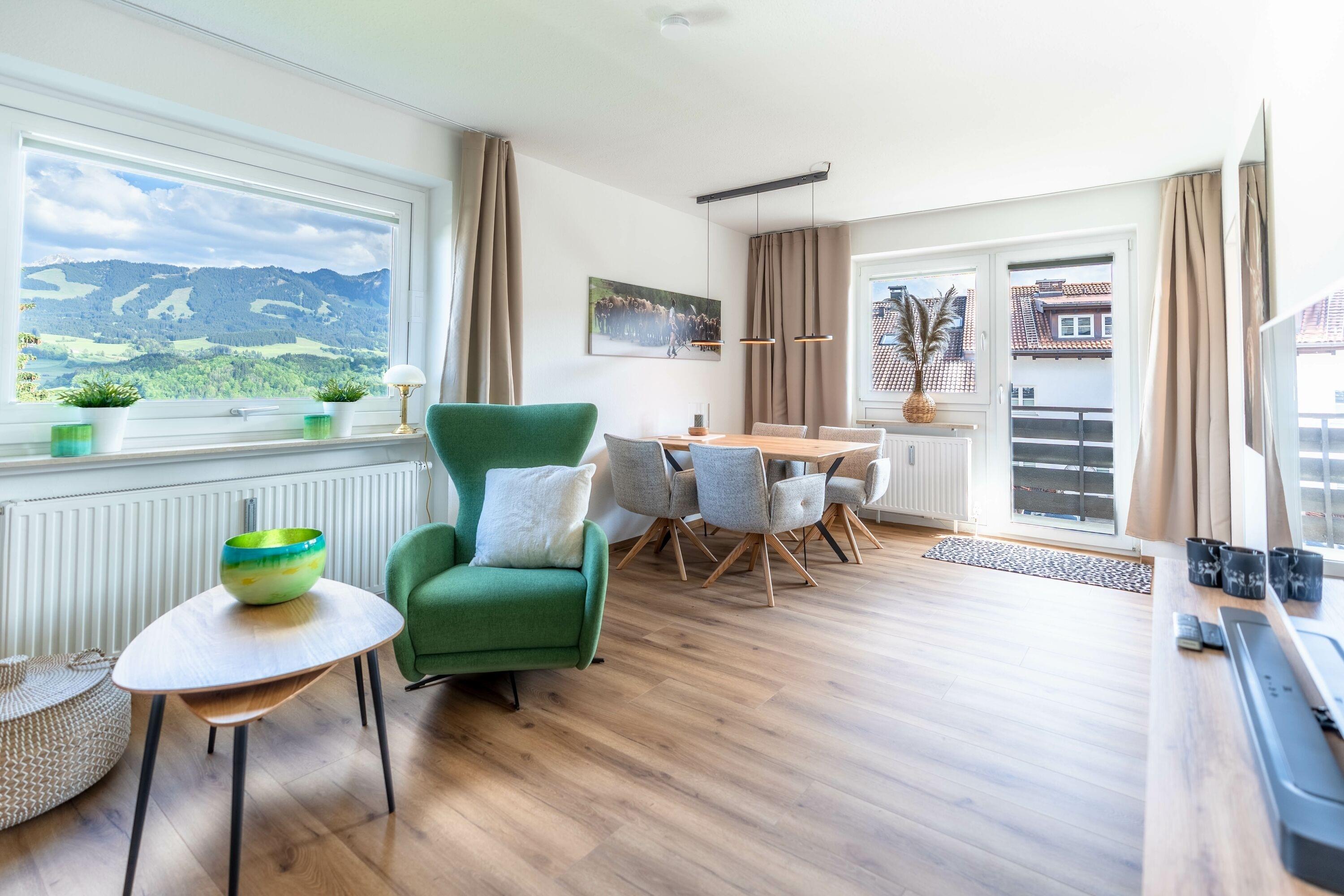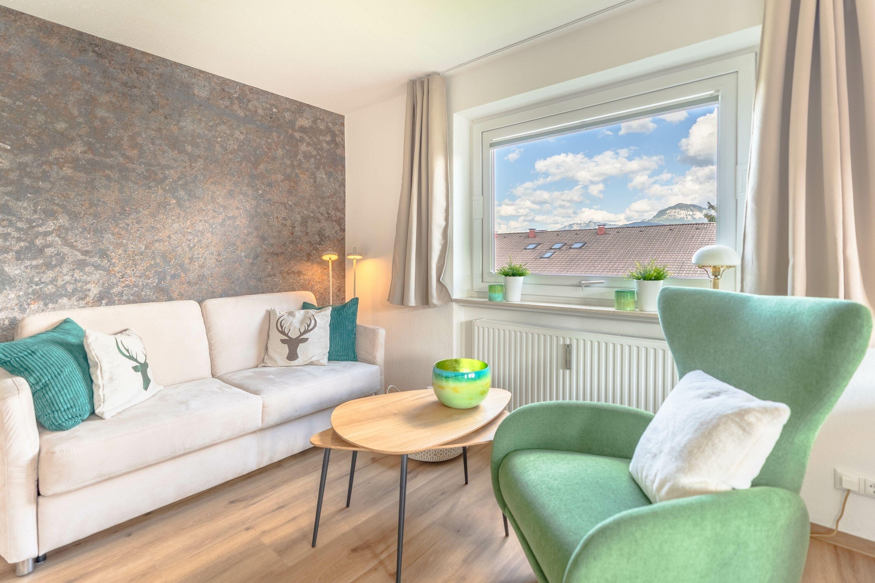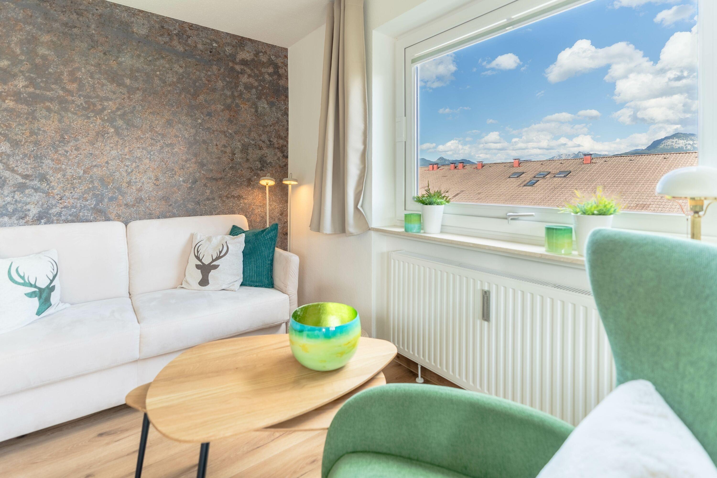 Die Ferienwohnung "Alphorn" in Ofterschwang bietet mit ihren 45 m² Platz für maximal 2 Personen. Sie verfügt über ein Wohnzimmer mit Essbereich, Schlafzimmer und ein Badezimmer mit Dusche. Zur Ausstattung gehört WLAN/Internet, TV, ein Balkon mit herrlichem Bergblick, Fahrradkeller, Skiraum und eine gem. Waschmaschine im Haus.
