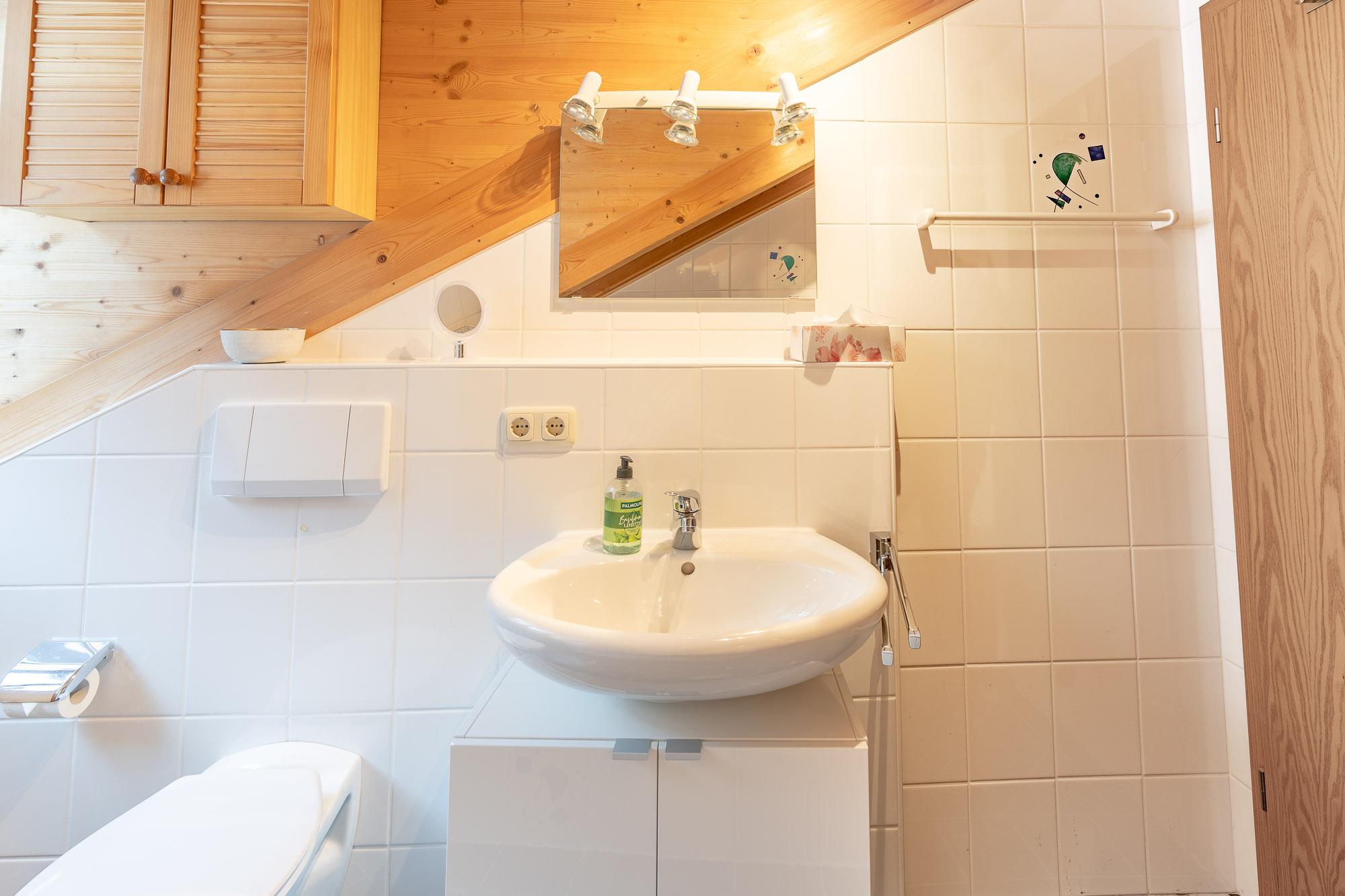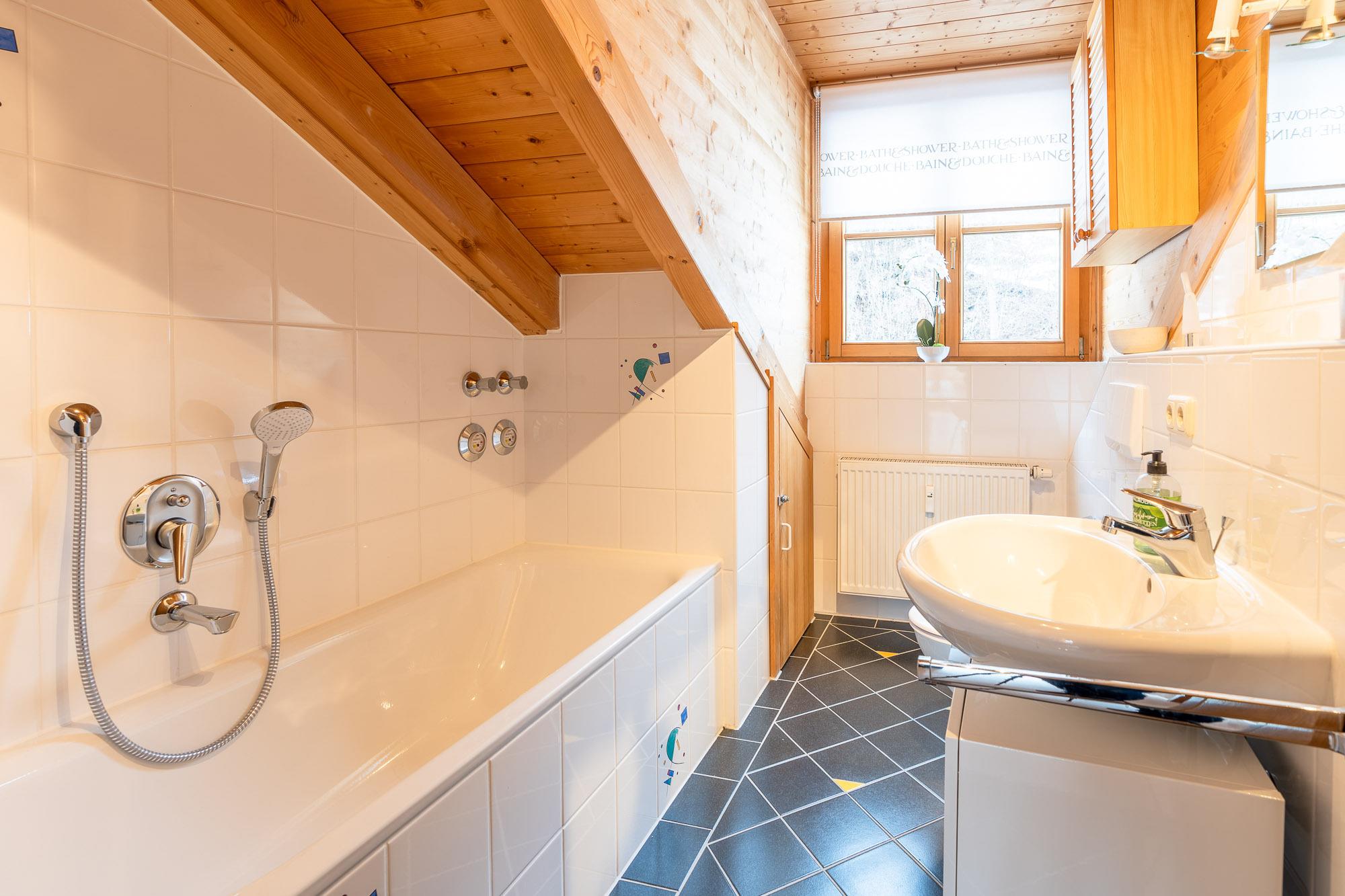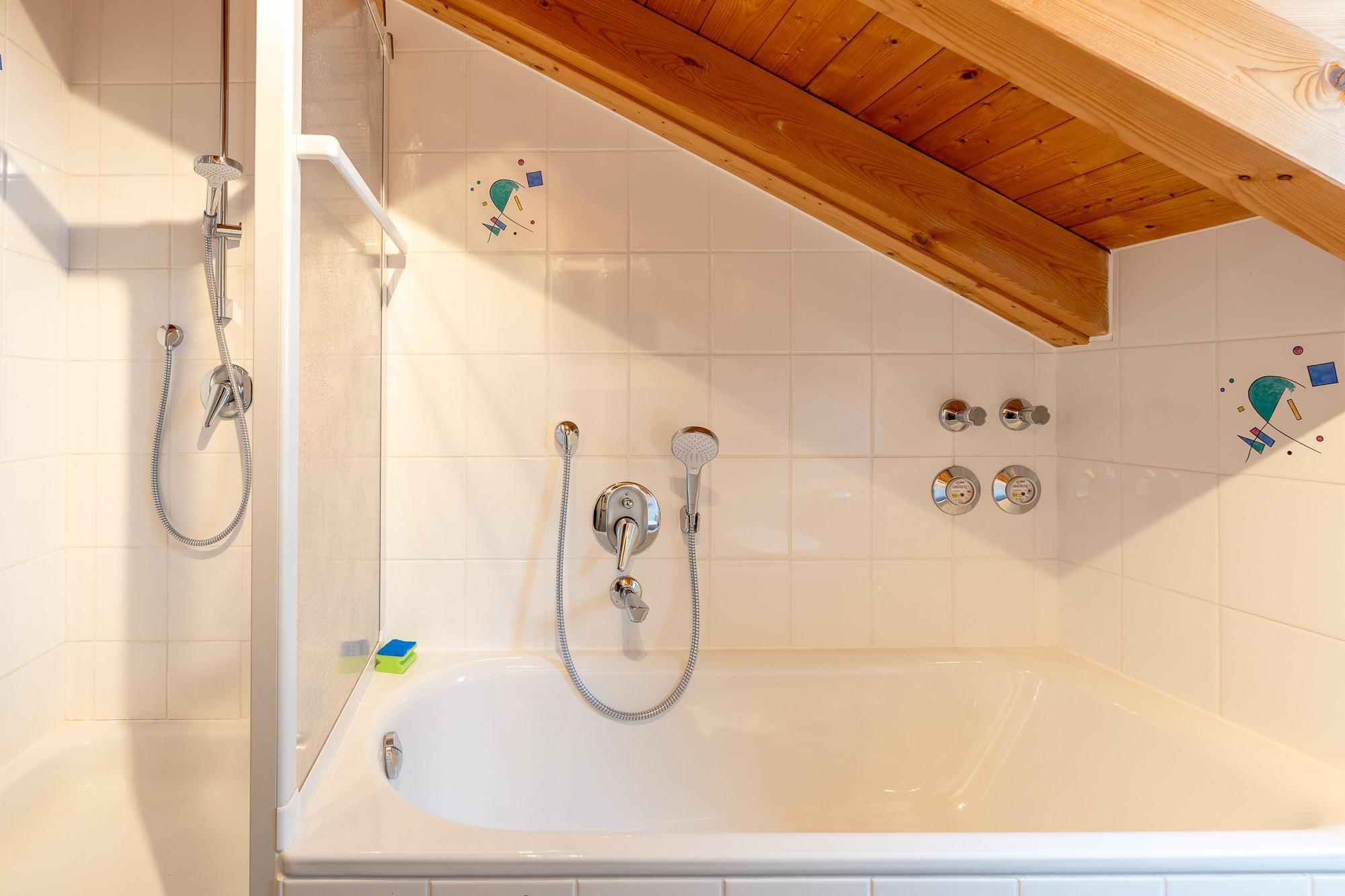 Das Badezimmer beinhaltet Dusche, Badewanne und ein extra WC.