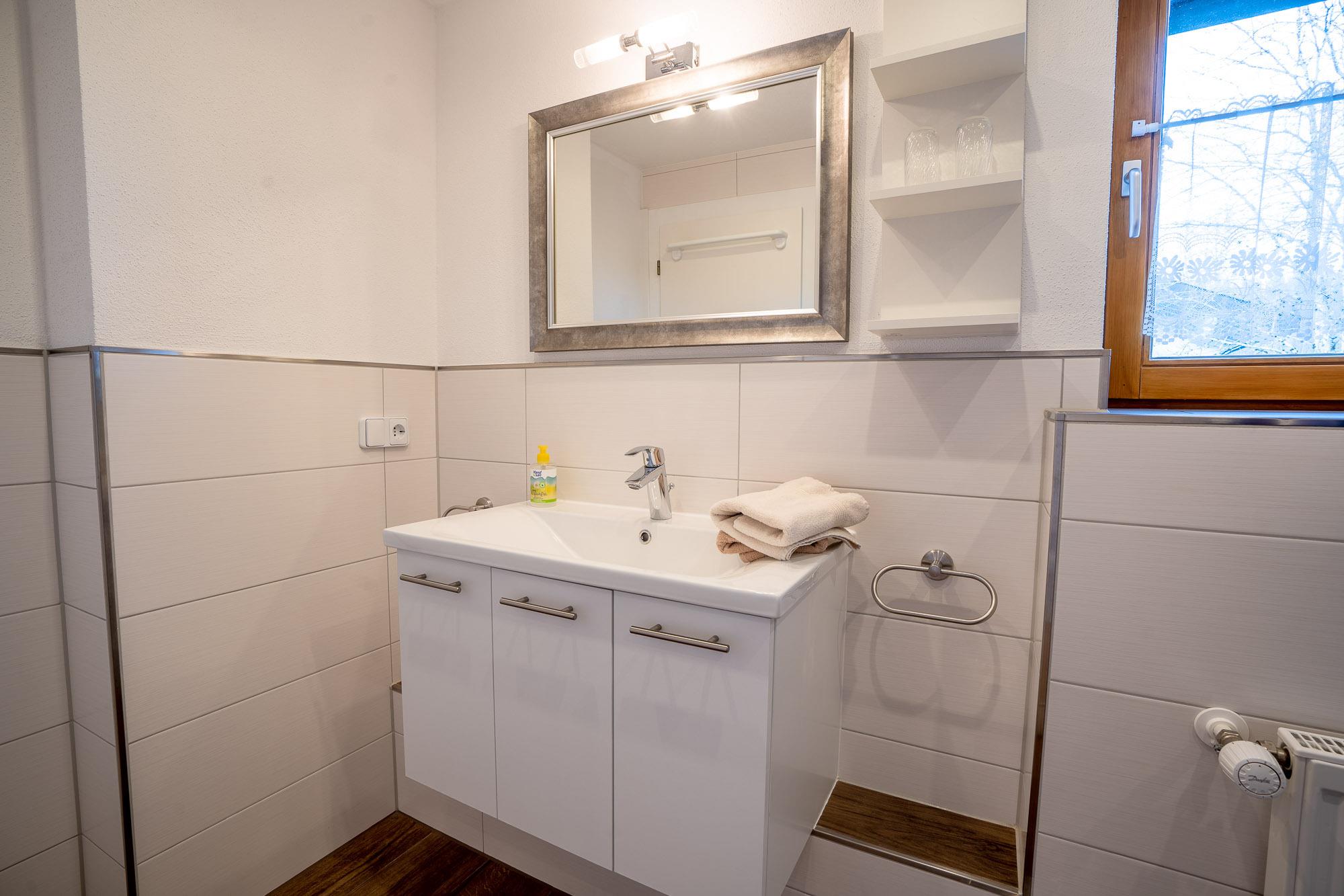 Im neuen großen Tageslichtbad ist eine XXL-Dusche, Handtuchheizkörper, WC, Waschtisch und Haarföhn vorhanden.