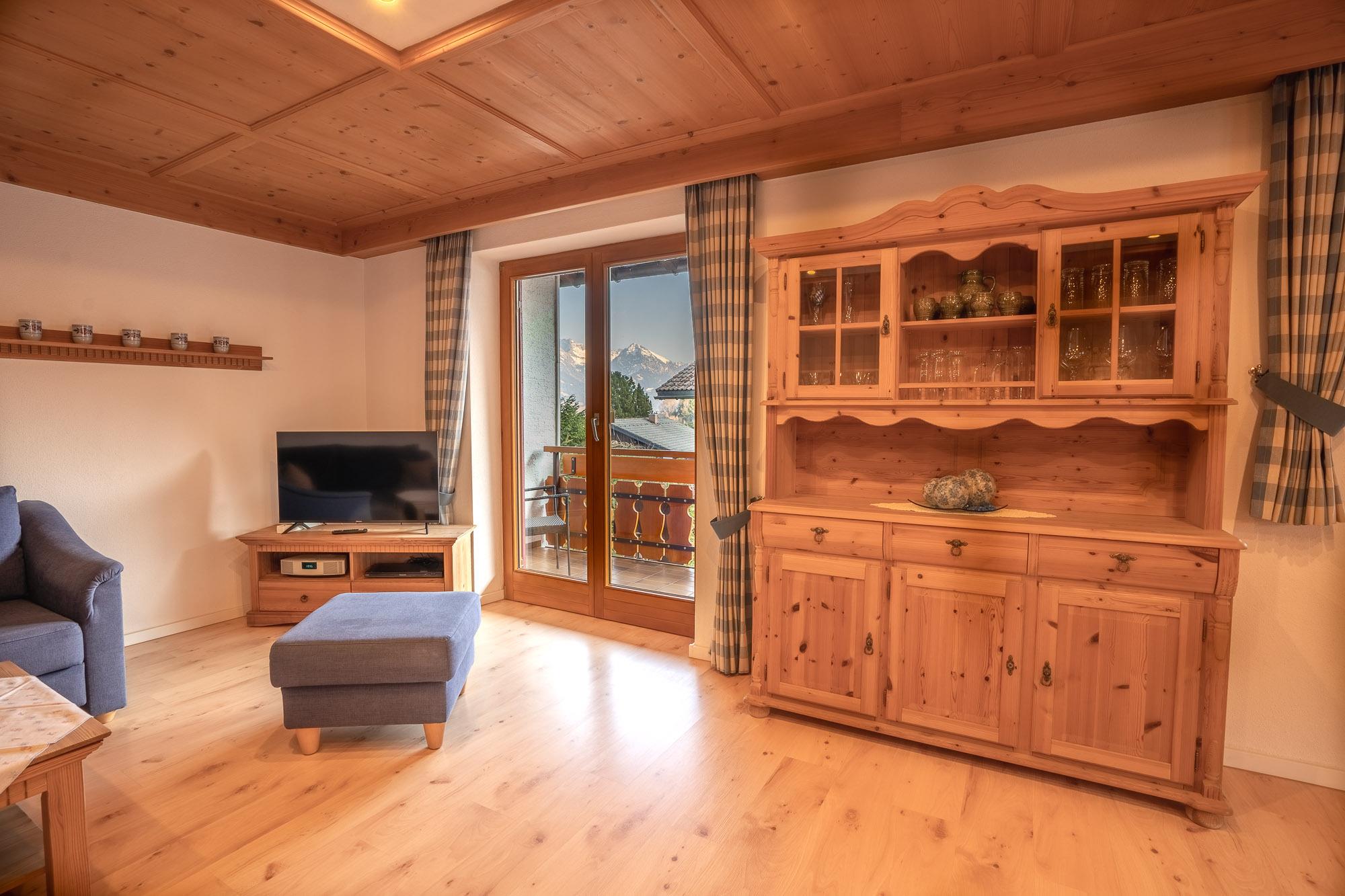An dem urgemütlichen Essbereich im "Allgäuer-Stil" lässt es sich gut verweilen. Der Wohnbereich ist mit einer bequemem ausziehbaren Ecksofa ausgestattet und hat einen Zugang zum großen Südwestbalkon.