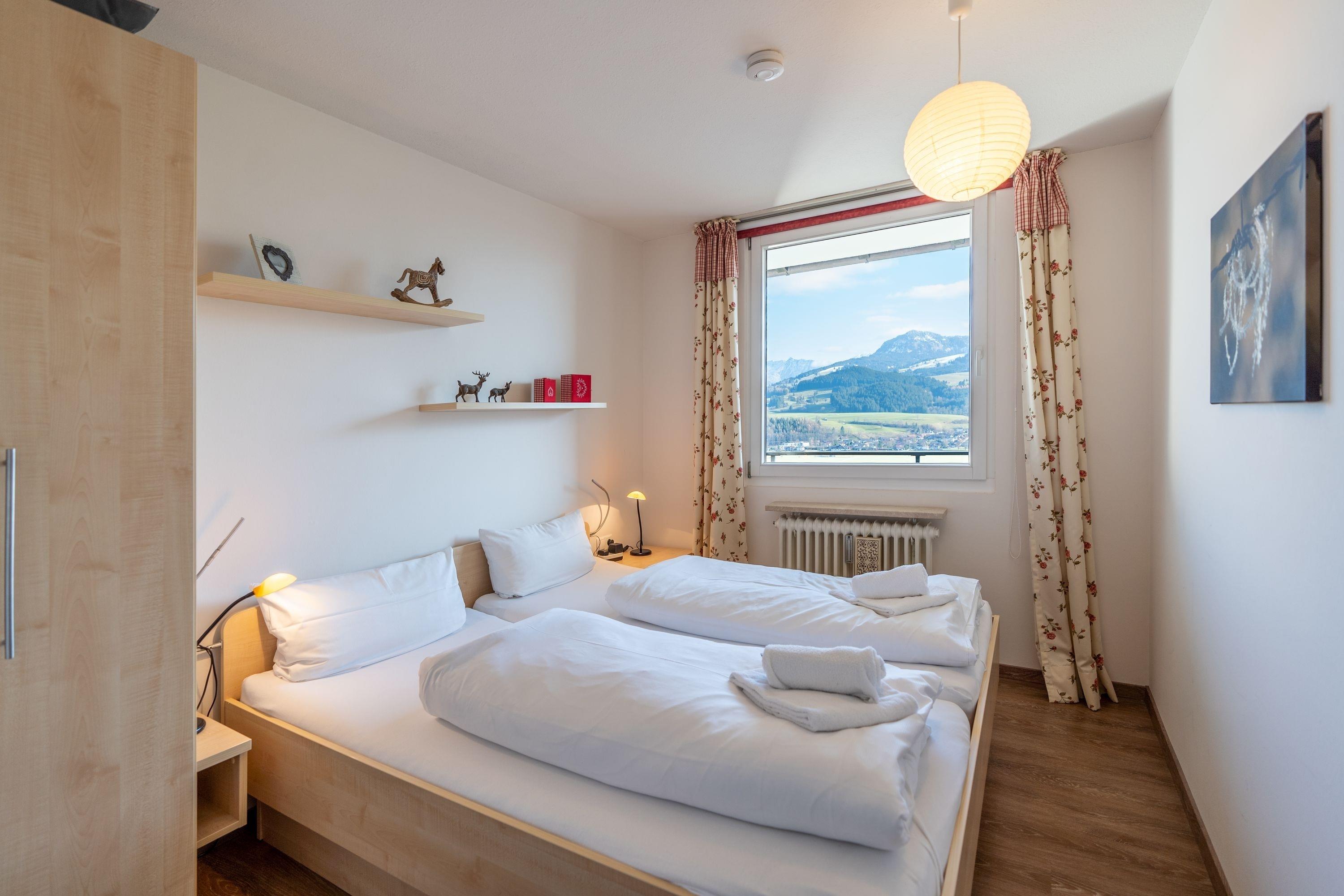 Diese liebevoll eingerichtete 2 Zimmerwohnung bietet Ihnen einen herrlichen Blick in die Allgäuer Berge und befindet sich im 2. OG eines Mehrfamilienhauses. Das Wohnzimmer ist mit einem gemütlichen Sofa, TV und einem Esstisch ausgestattet.